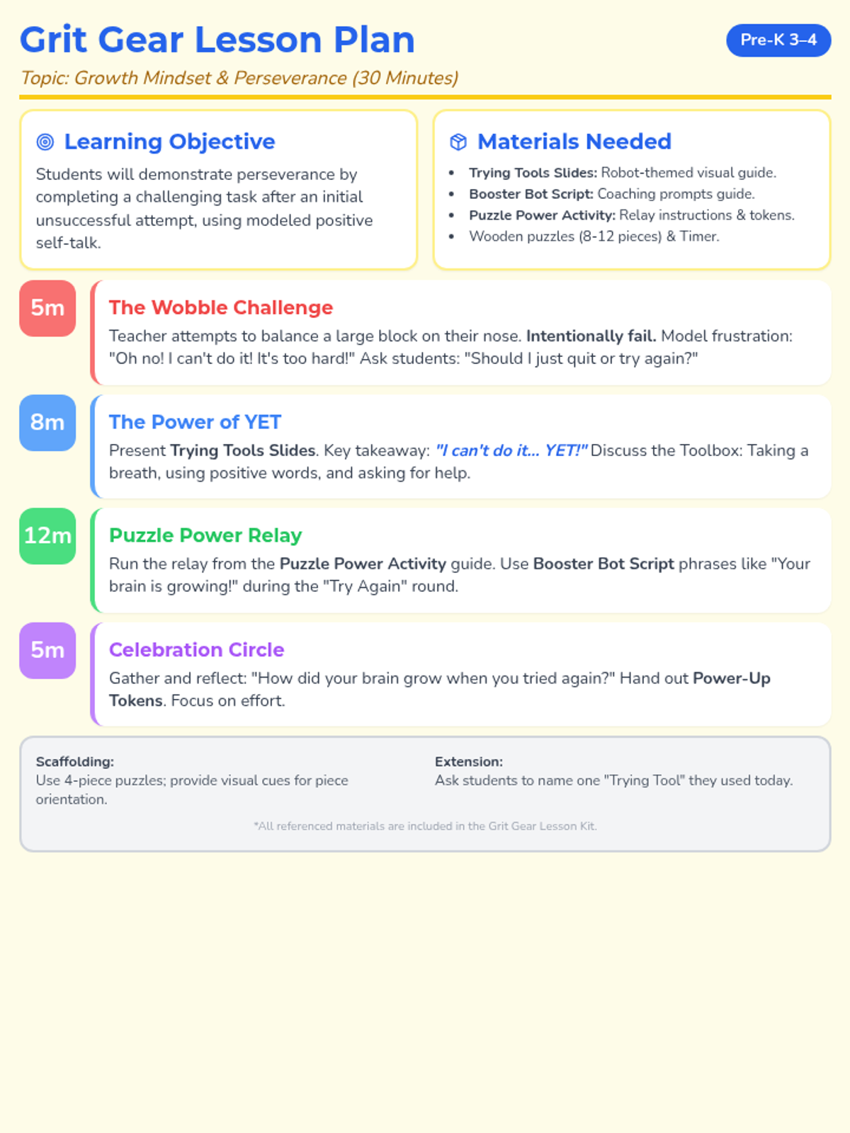 A high-energy, supportive lesson for Pre-K students focused on developing a growth mindset and perseverance through interactive games and positive self-talk modeling.