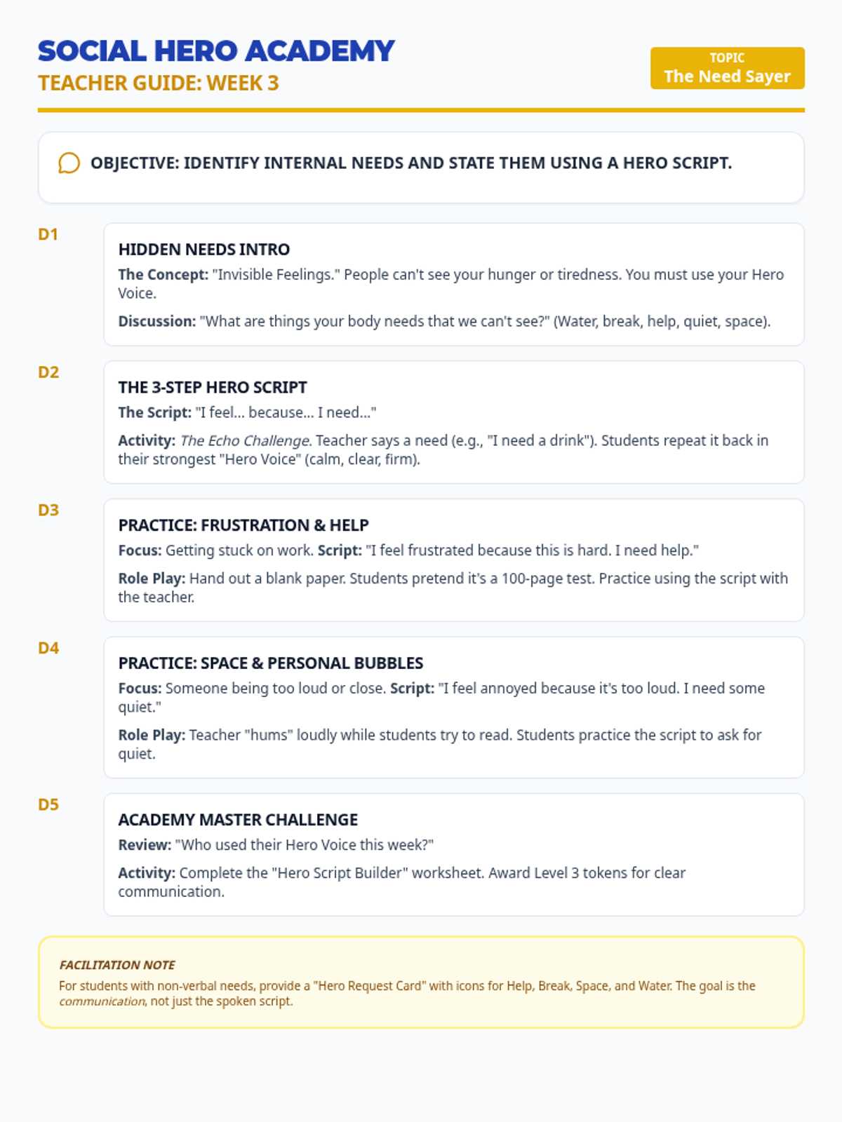 An intensive week of role-play scenarios where students combine pause, impulse control, and communication skills to solve social challenges.