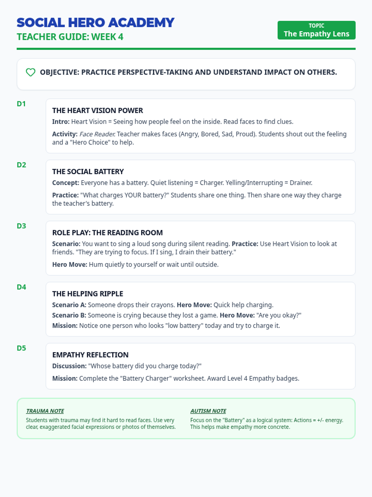 Explores perspective-taking and how individual choices impact the group. Students practice 'Heart Vision' to understand others' feelings.