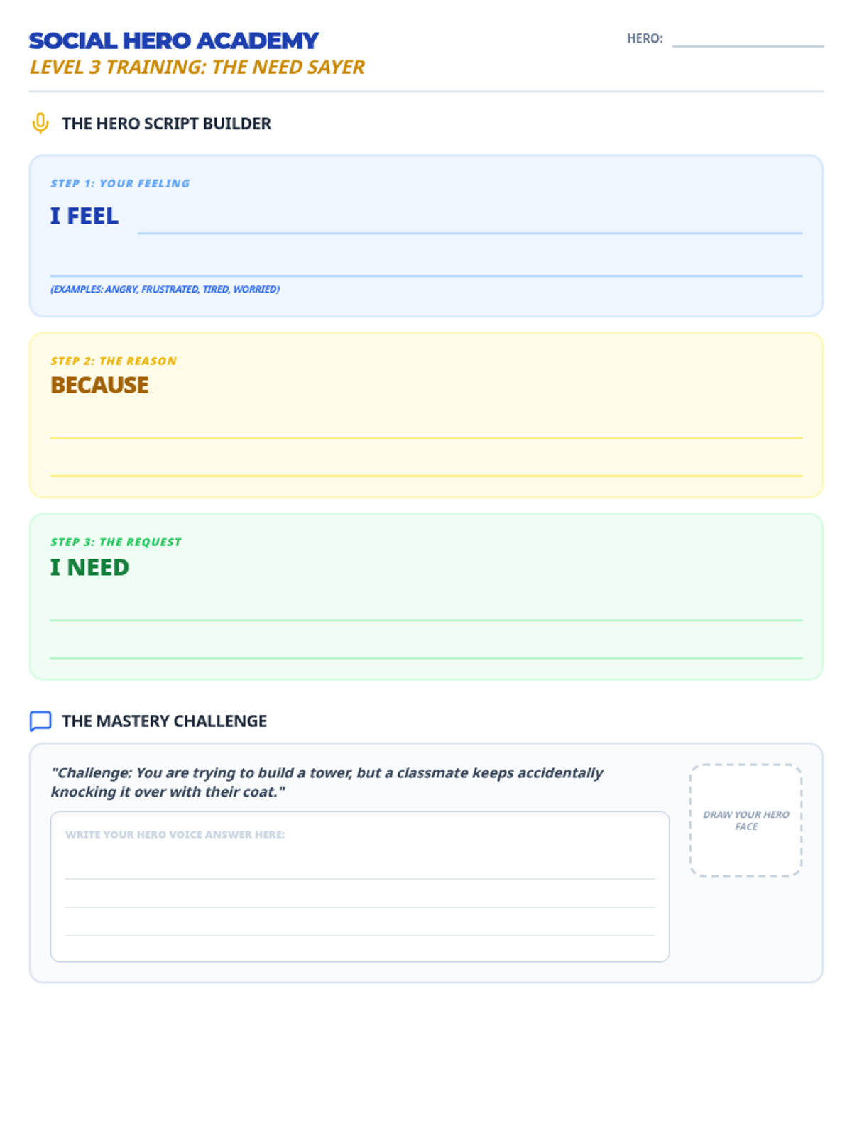 Teaches students to identify internal needs and use clear 'I feel... because... I need...' statements to communicate effectively without escalating.