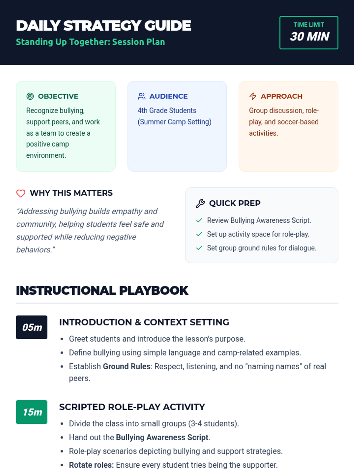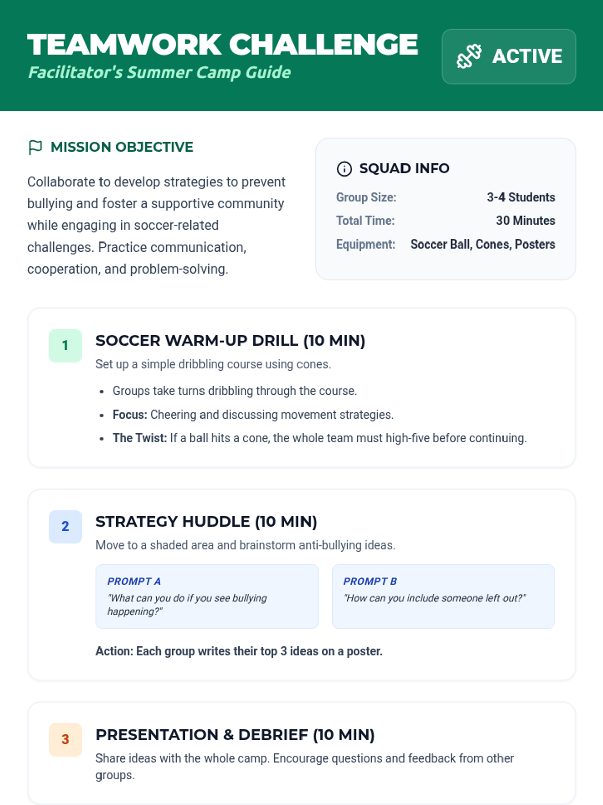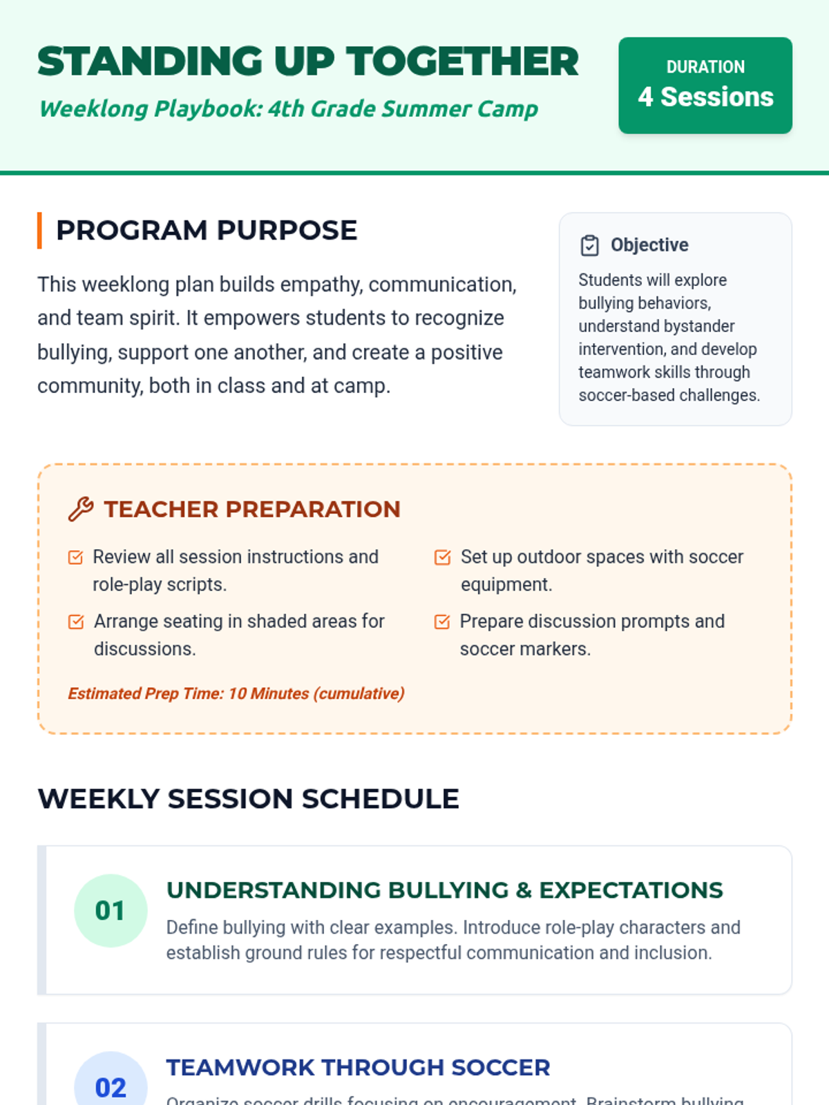 A weeklong series of four 30-minute sessions focused on recognizing bullying, practicing bystander intervention, and fostering teamwork through soccer and role-play.