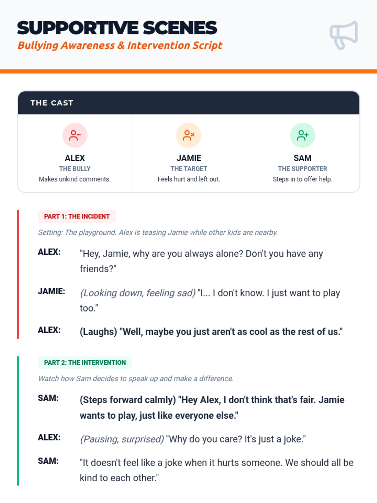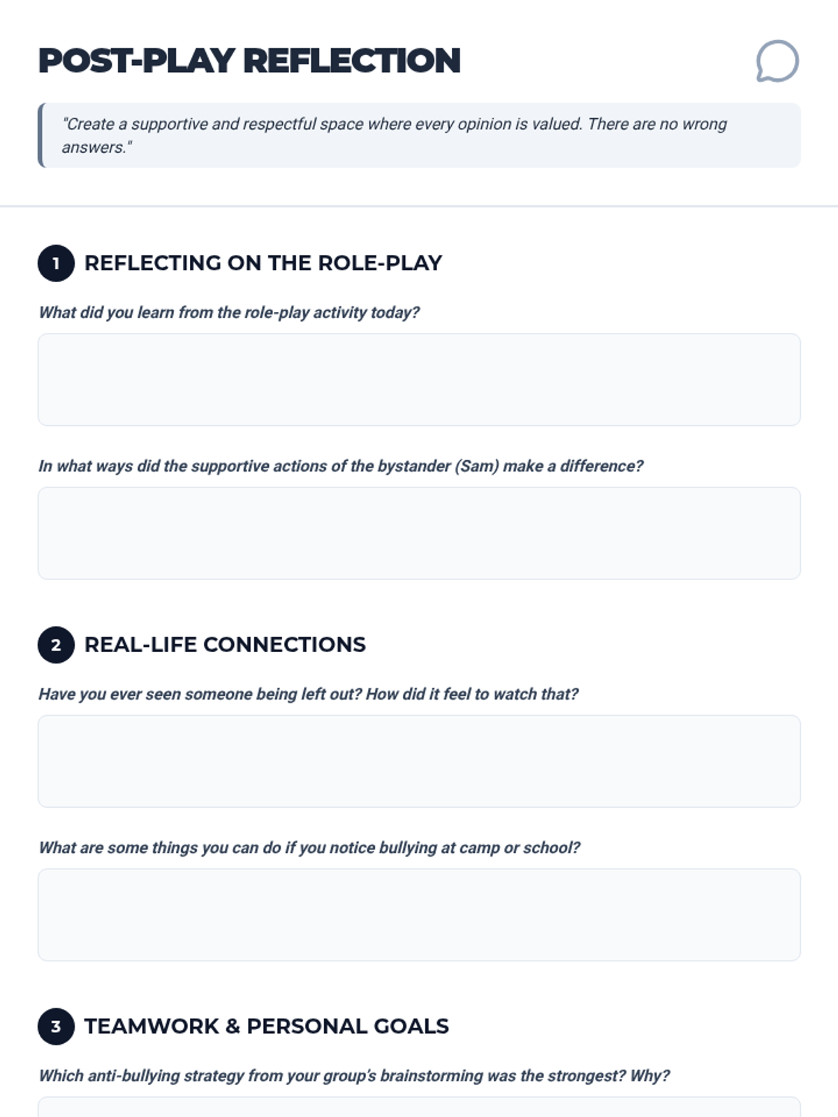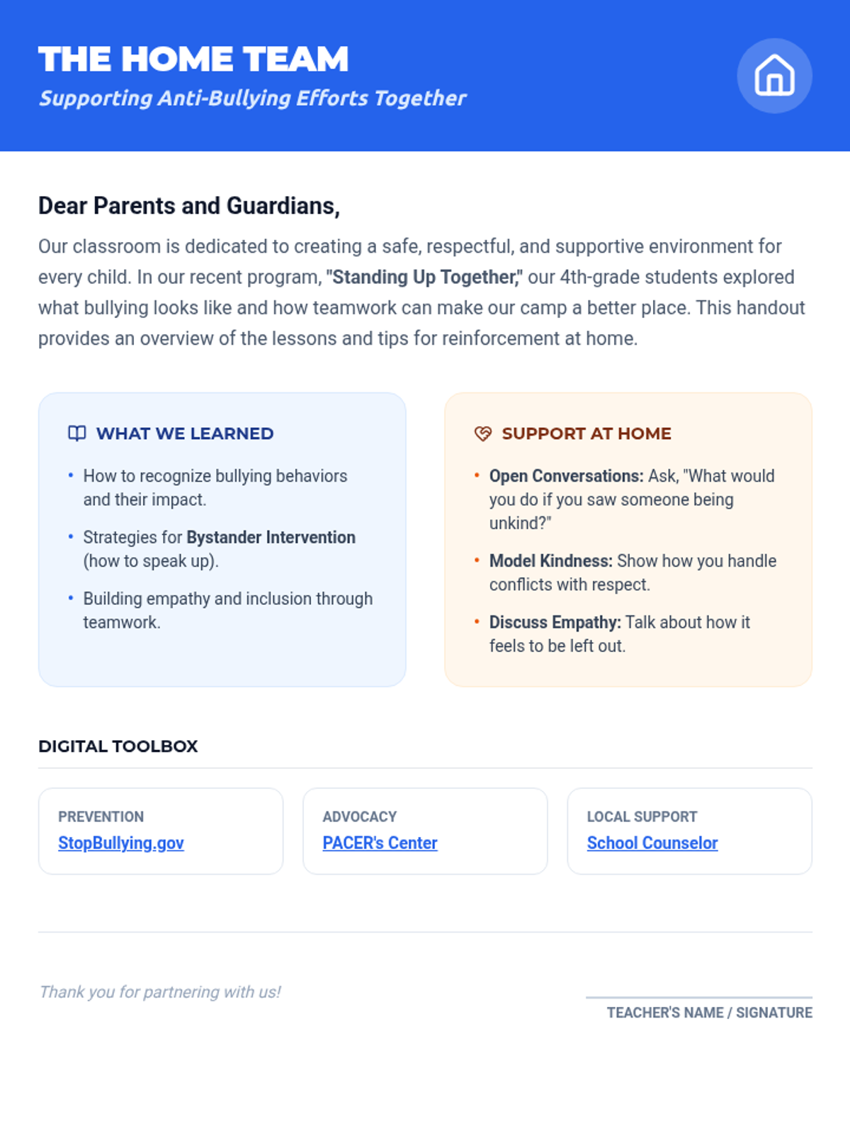 A weeklong series of four 30-minute sessions focused on recognizing bullying, practicing bystander intervention, and fostering teamwork through soccer and role-play.