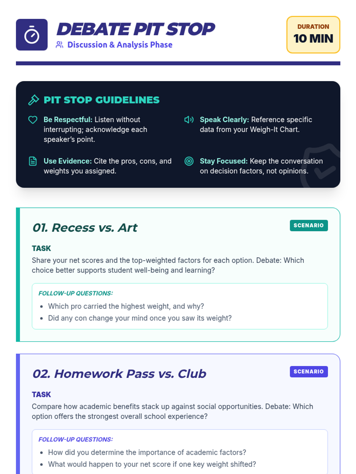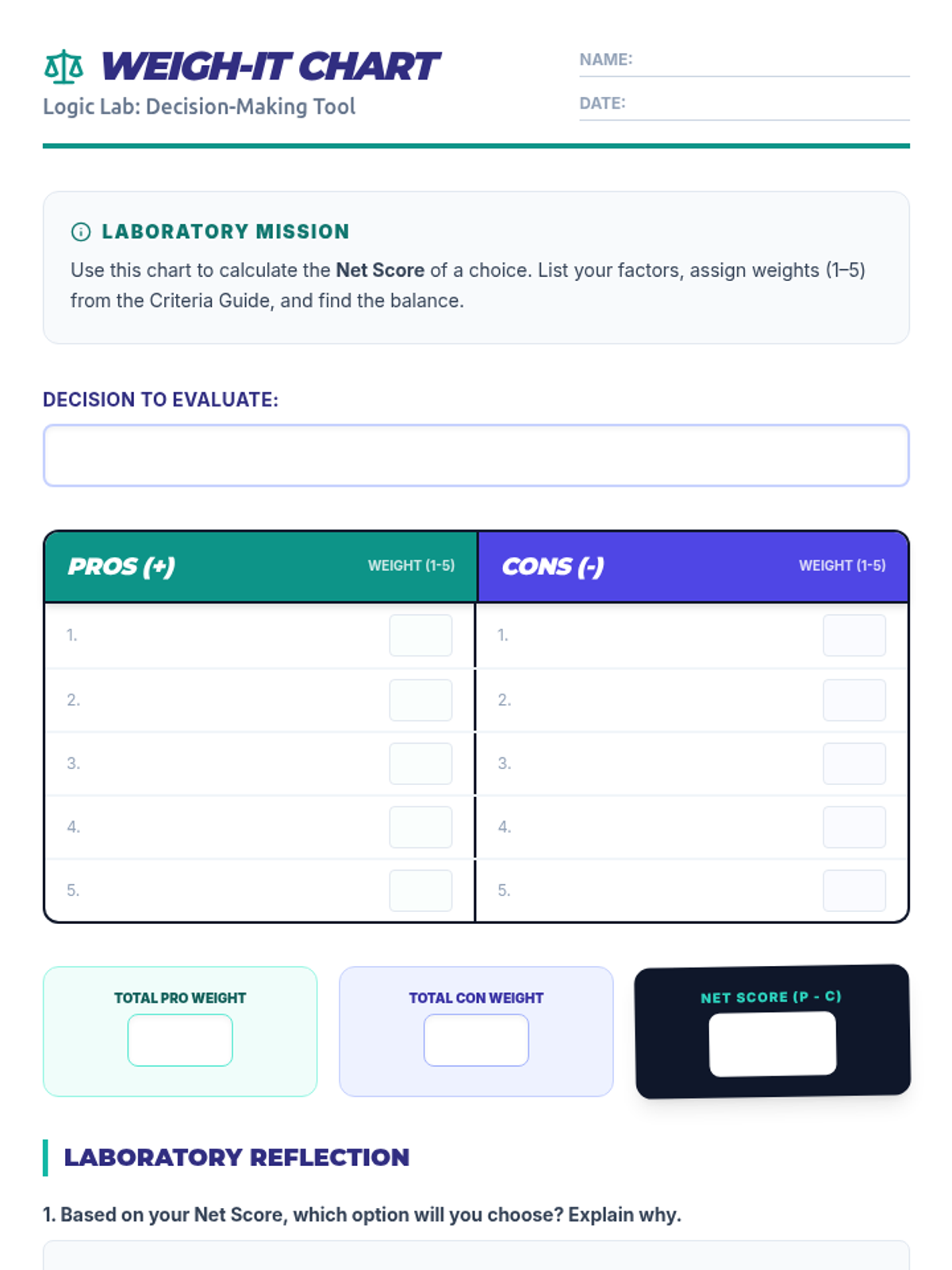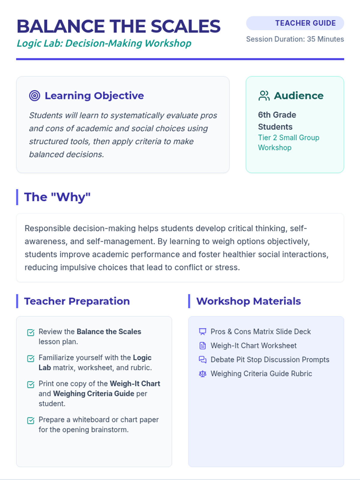 A focused 35-minute small-group workshop for 6th graders to develop responsible decision-making skills by systematically evaluating pros and cons using a 'Logic Lab' approach.