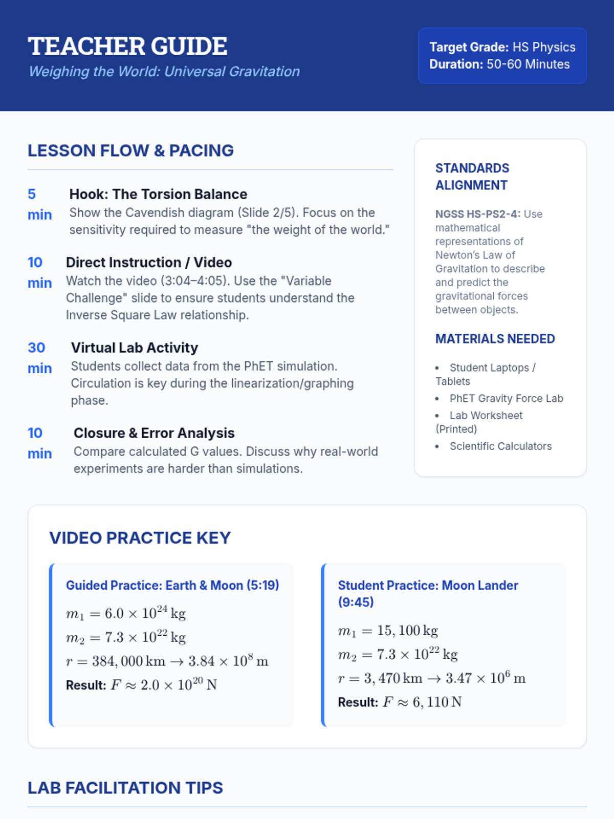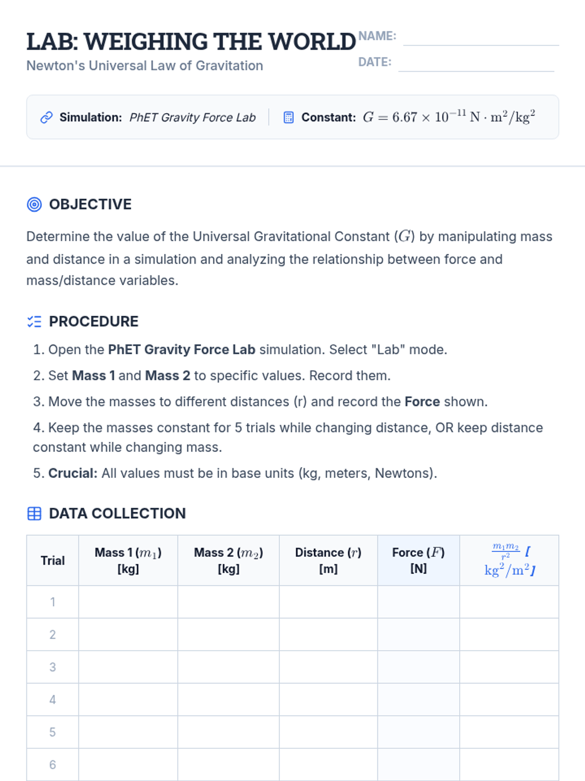 Students determine the universal gravitational constant (G) by simulating the Cavendish experiment using the PhET Gravity Force Lab. They collect data, linearize the gravitational equation, and use the slope of their graph to calculate G, comparing their results to the accepted value.