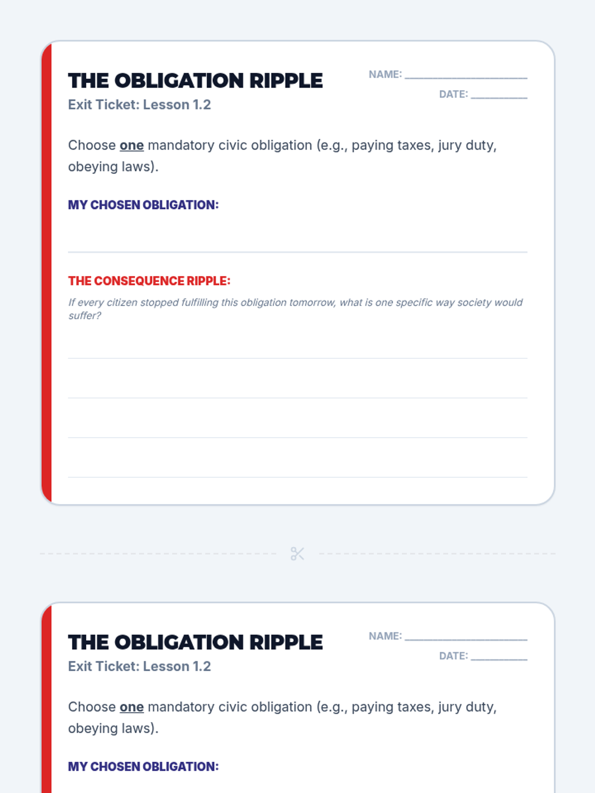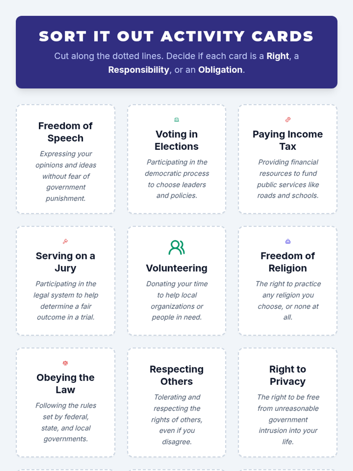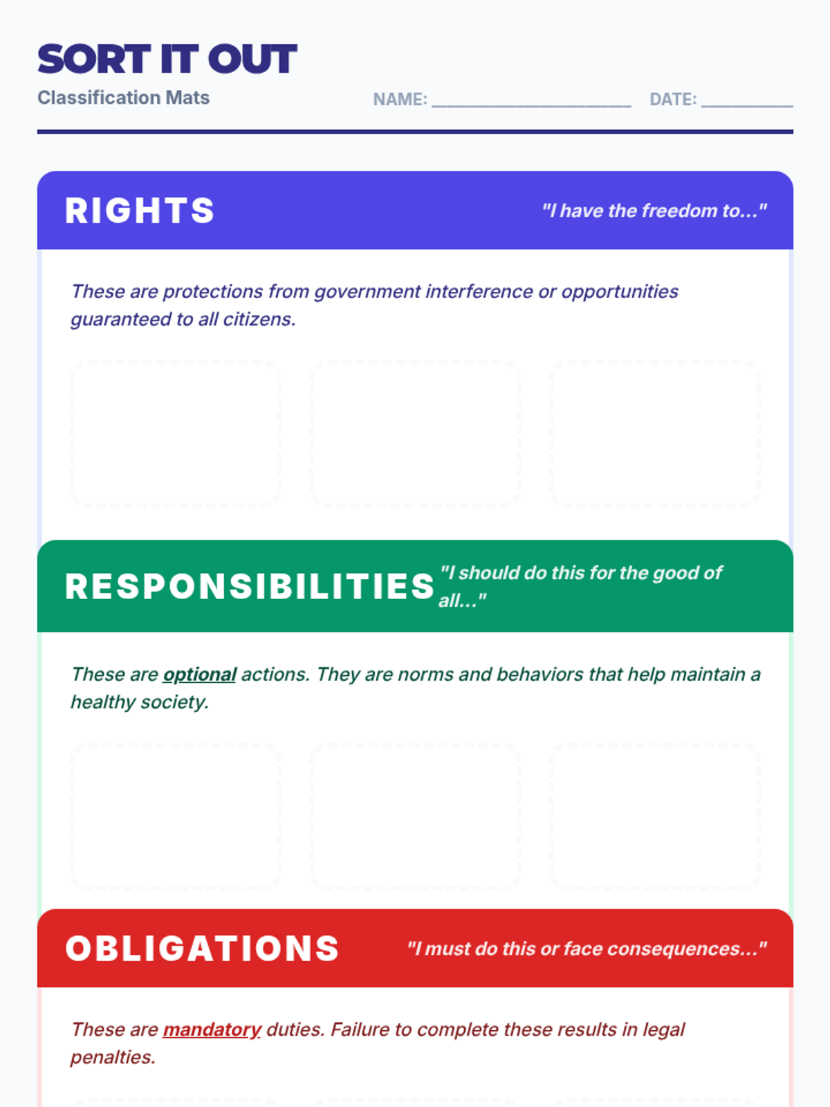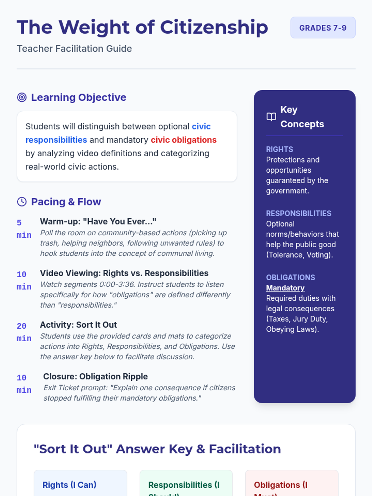 A civics lesson focused on the distinction between optional responsibilities and mandatory obligations, featuring a sorting activity and video analysis.