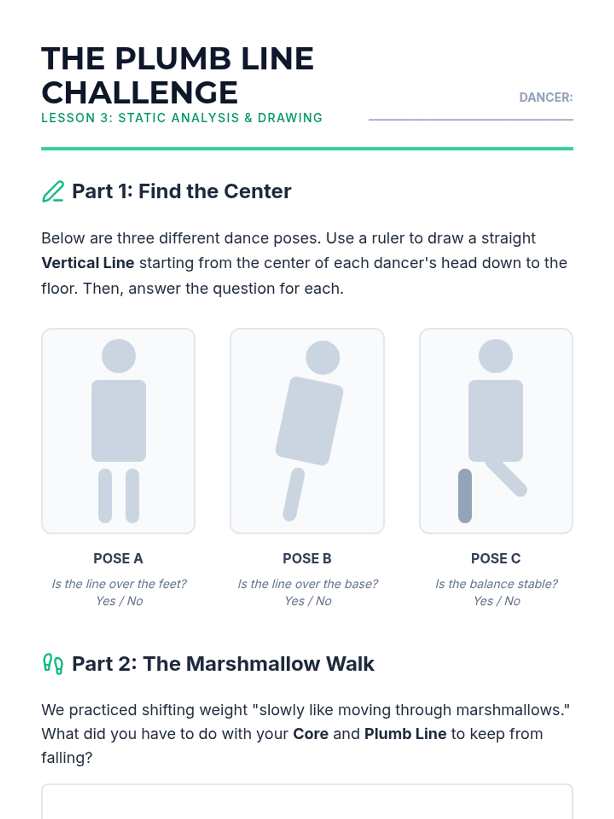 Explores how the center of gravity shifts during movement. Students practice maintaining alignment during weight transfers through games and visual analysis.