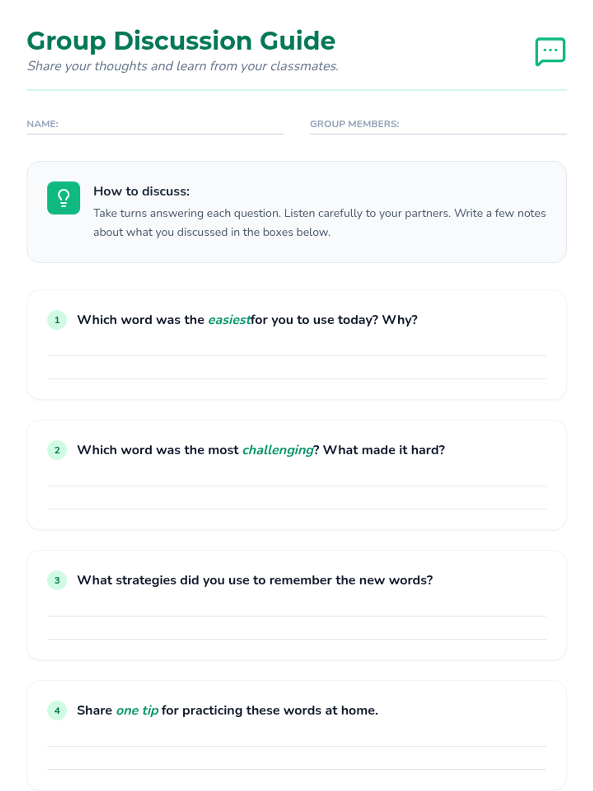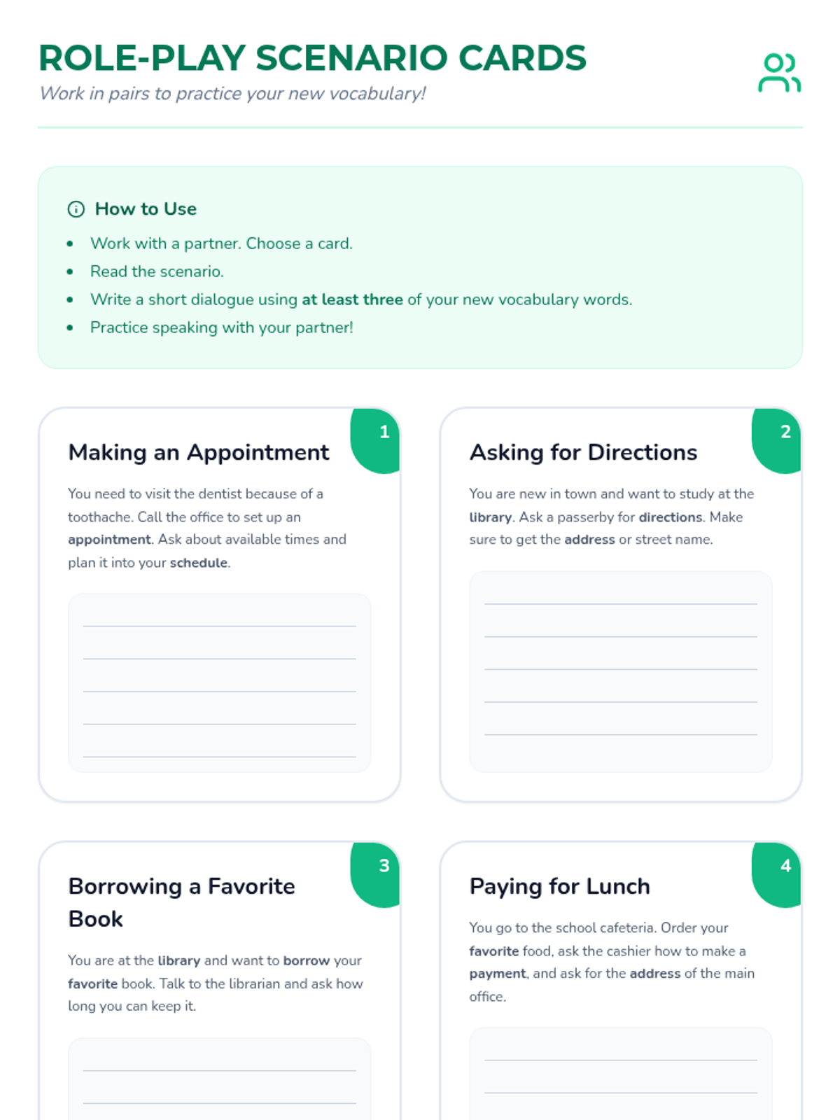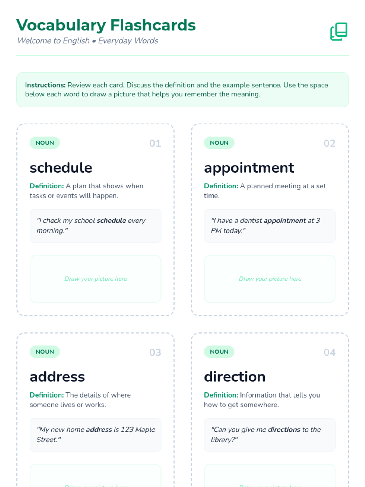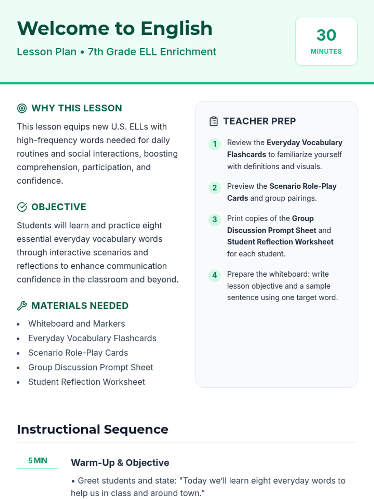 A 30-minute enrichment session for 7th grade ELLs to learn and practice eight essential everyday vocabulary words through interactive scenarios and reflection.