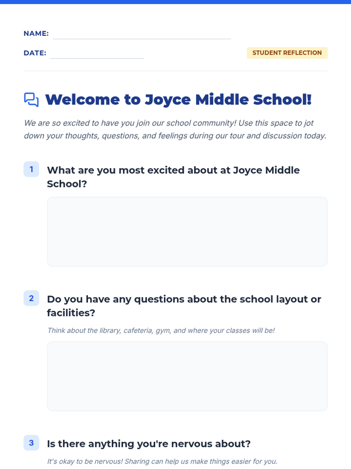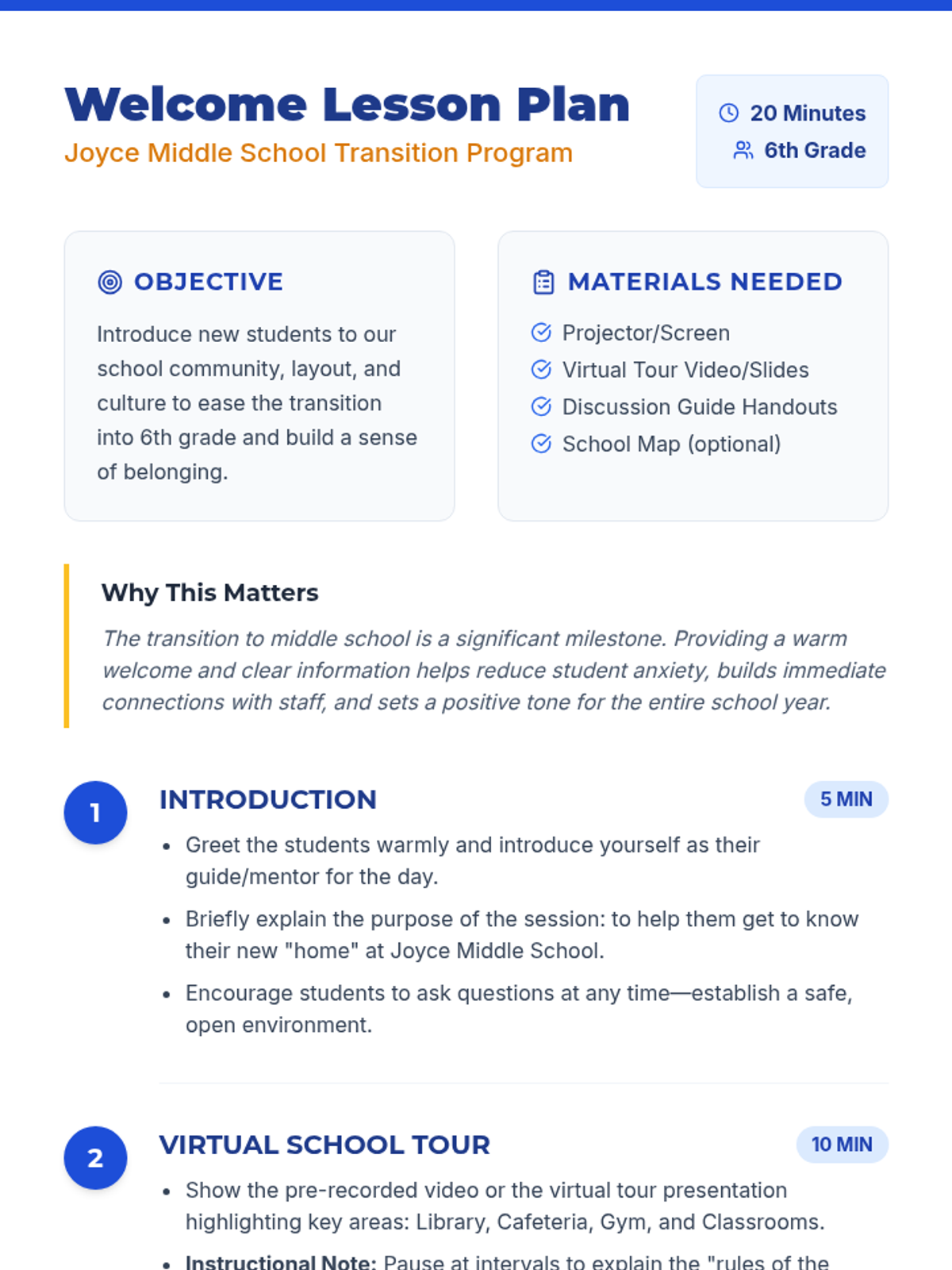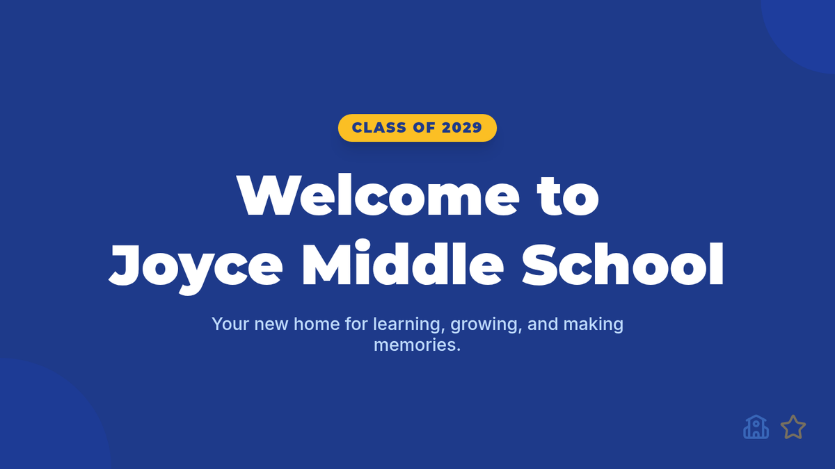 A warm, introductory lesson for incoming 6th graders at Joyce Middle School, featuring a school tour and Q&A session.