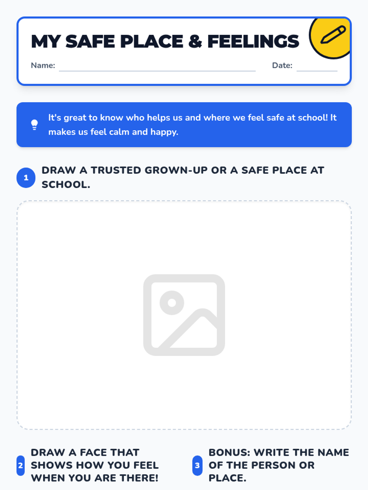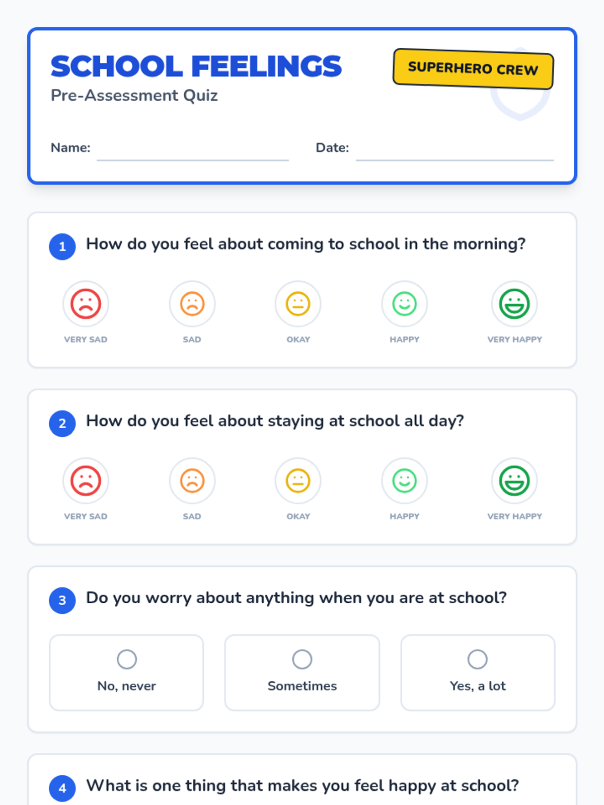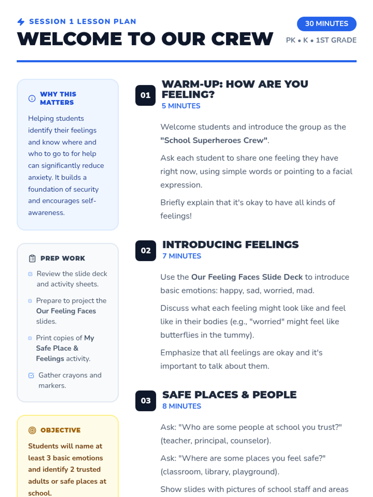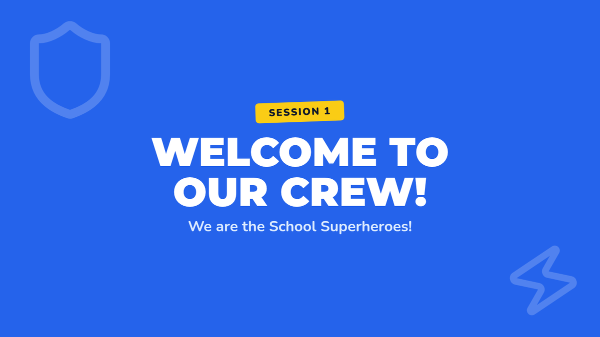 Introduces the group as a Superhero Crew, focuses on identifying basic emotions, and identifies trusted adults and safe places within the school.