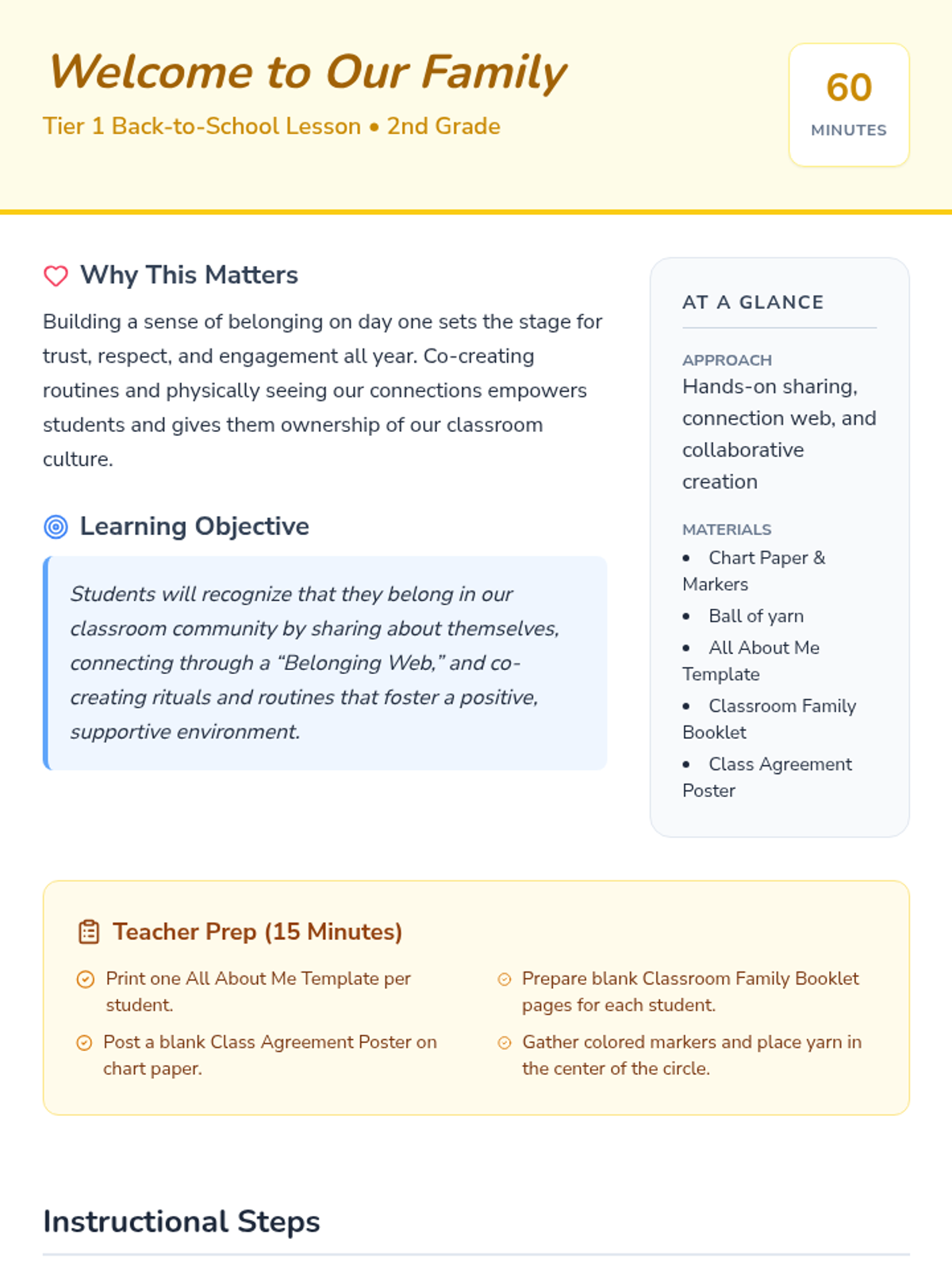 In this 60-minute Tier 1 back-to-school lesson for 2nd graders, students will explore the idea that they belong in our classroom community by creating rituals and routines that foster a positive, supportive environment. This lesson sets the tone for the year, builds connections, and helps students feel safe and valued on day one.