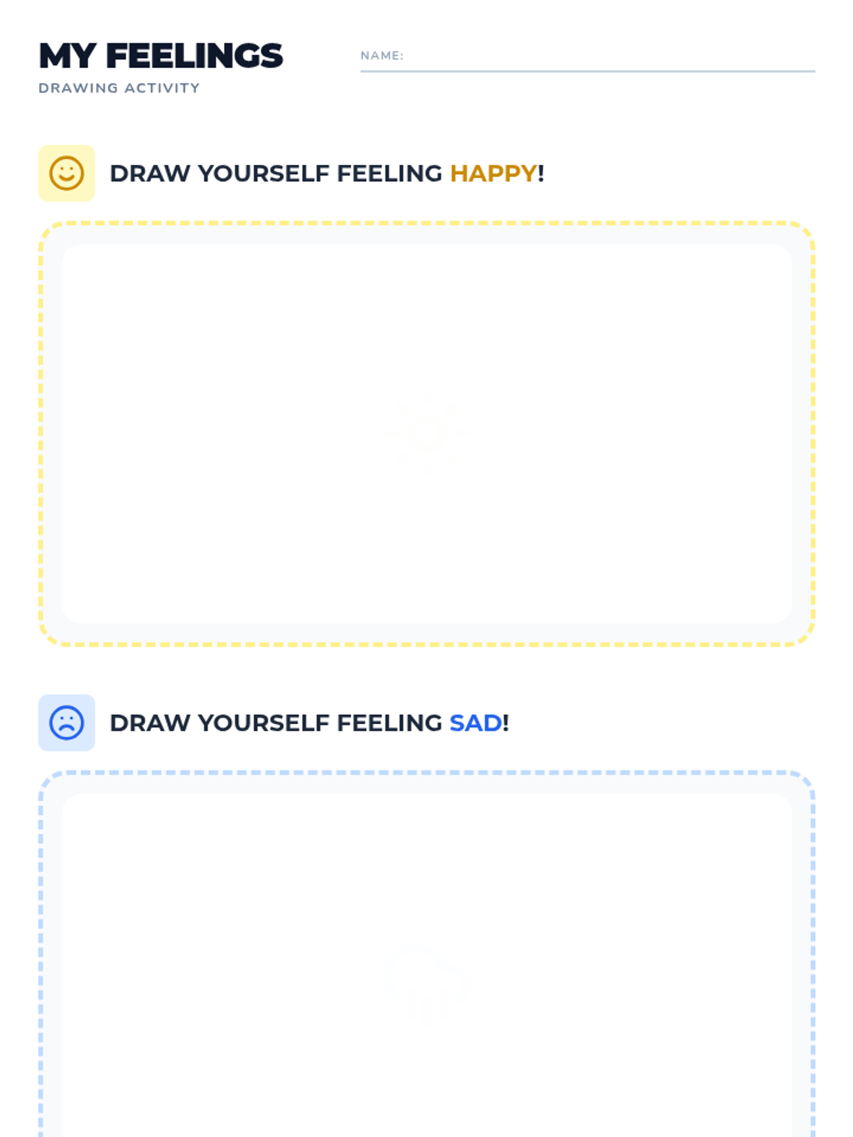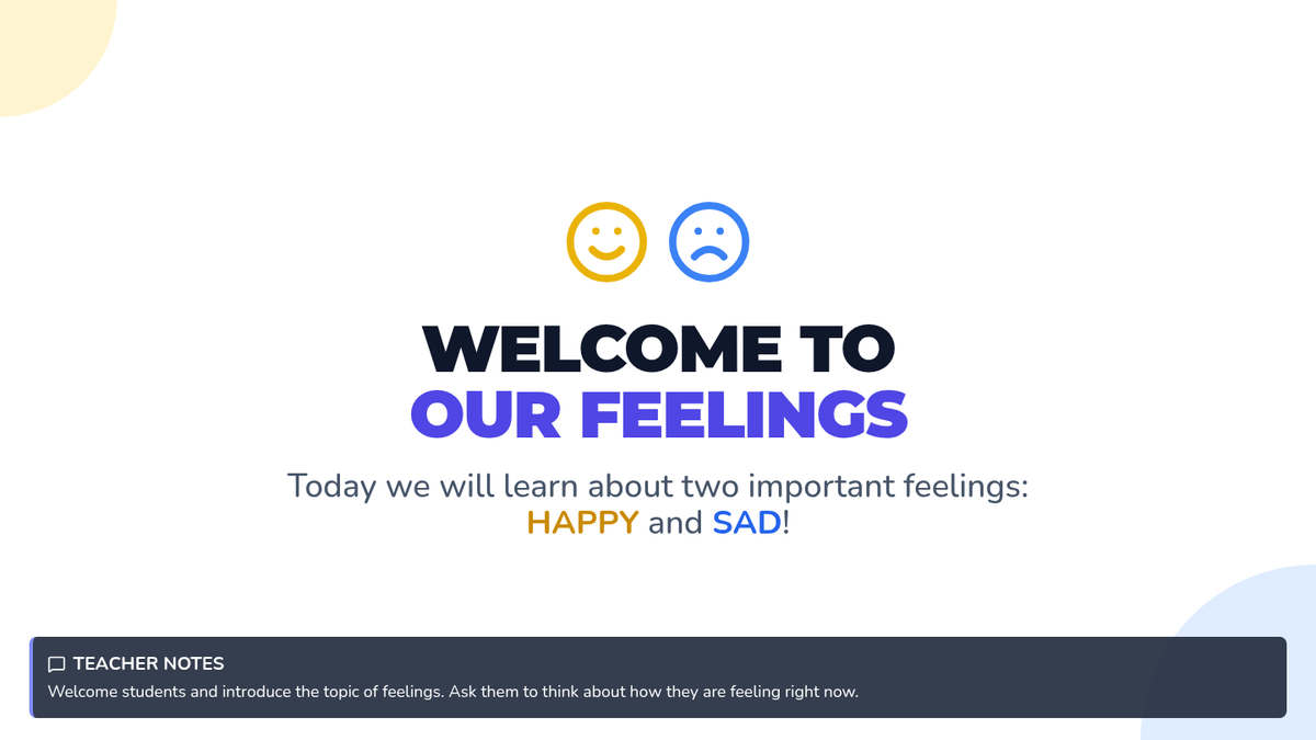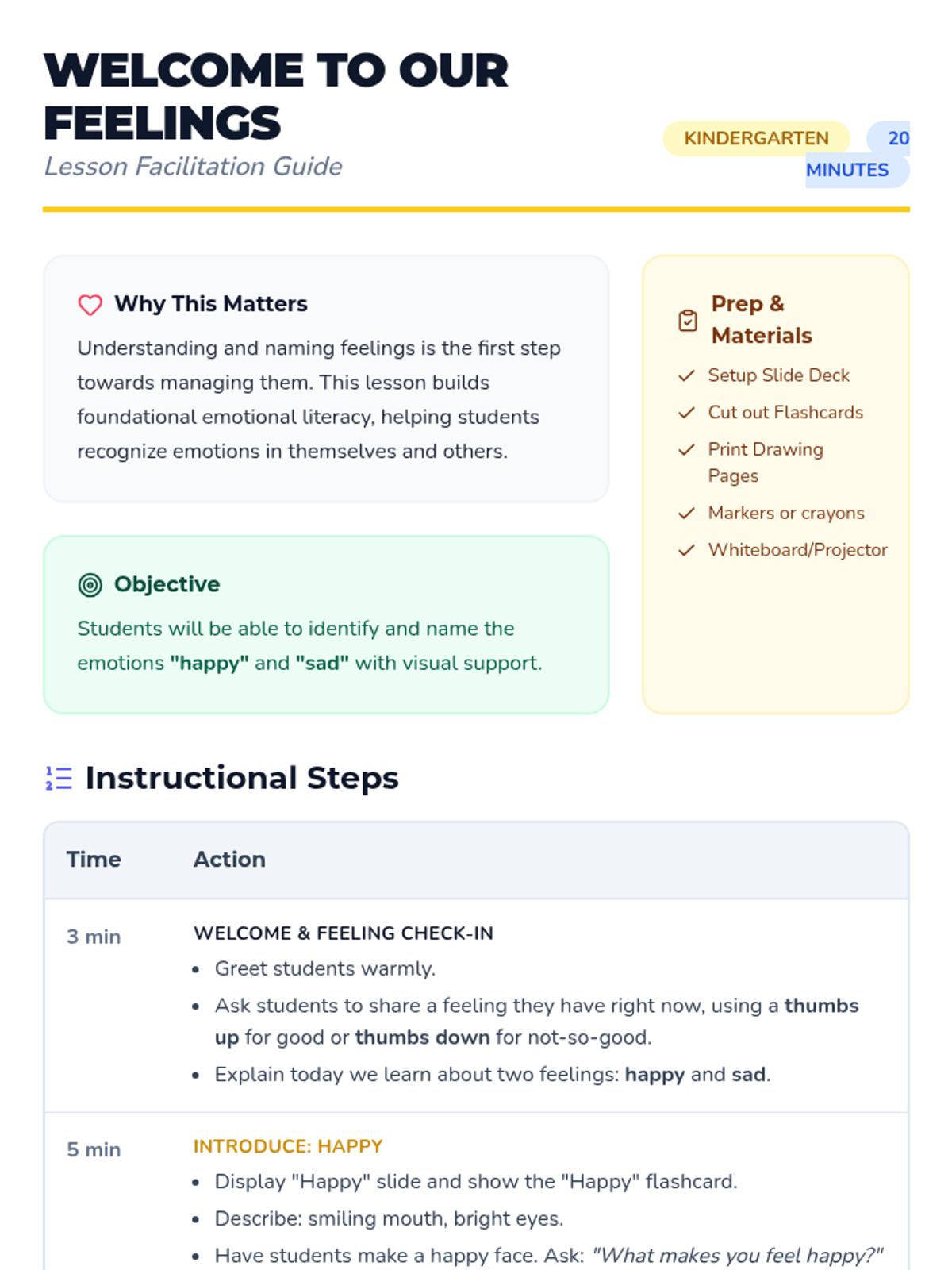 A 20-minute introductory lesson for Kindergarteners to identify and name 'happy' and 'sad' emotions using visual aids and creative expression.