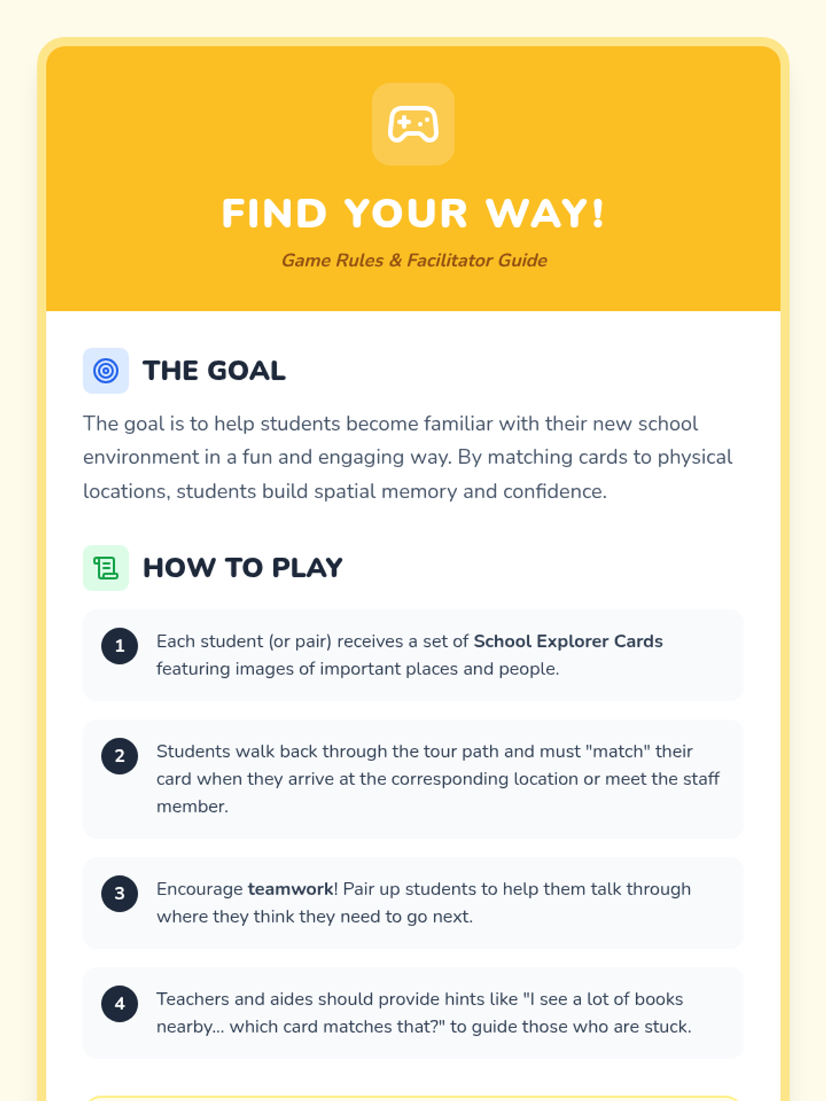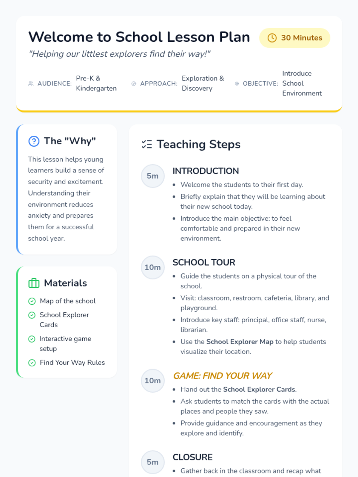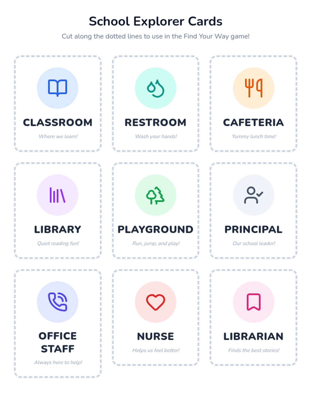 In this lesson, Pre-K and Kindergarten students will be introduced to the school environment. They will learn about important places and people they may need to know at school. The goal is to help students feel comfortable and prepared as they start their school experience. This is crucial for young learners to build a sense of security and excitement about their new environment.
