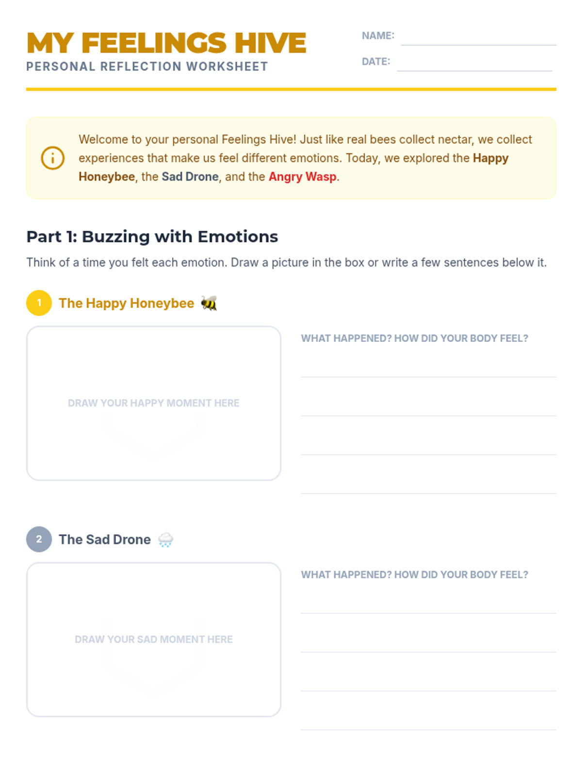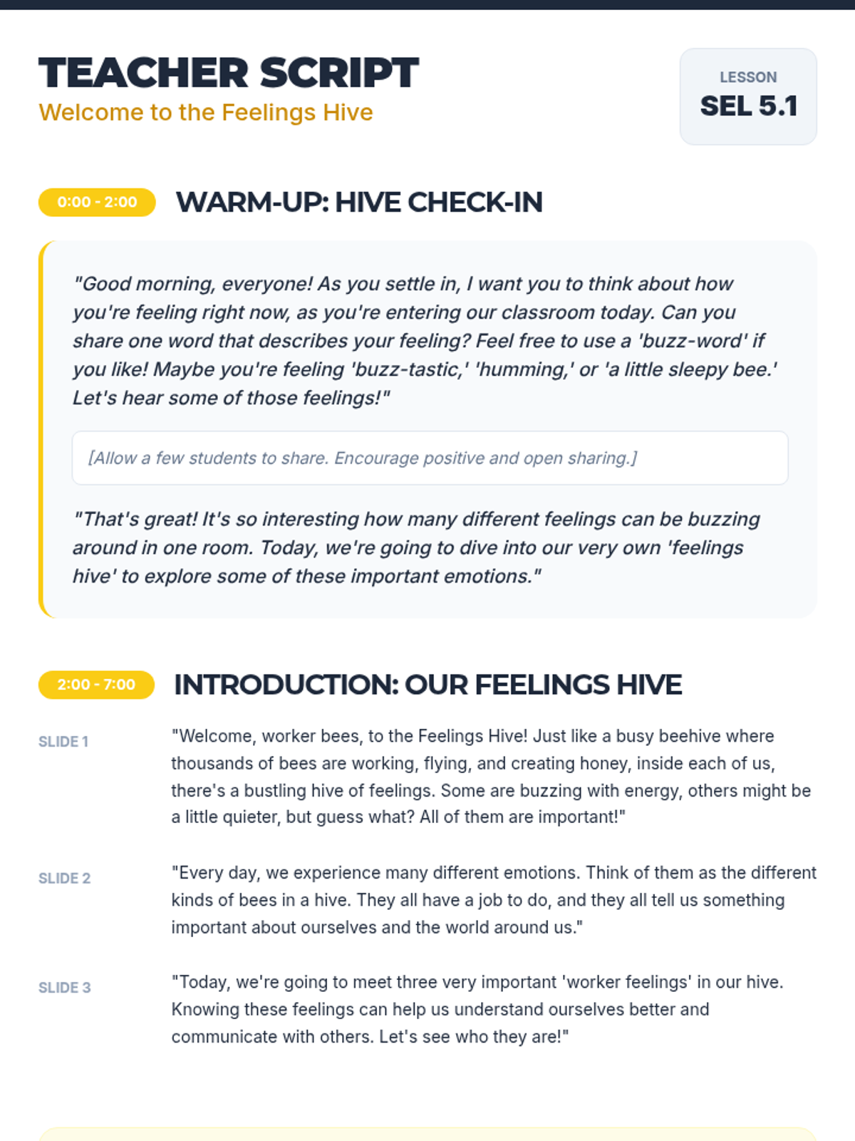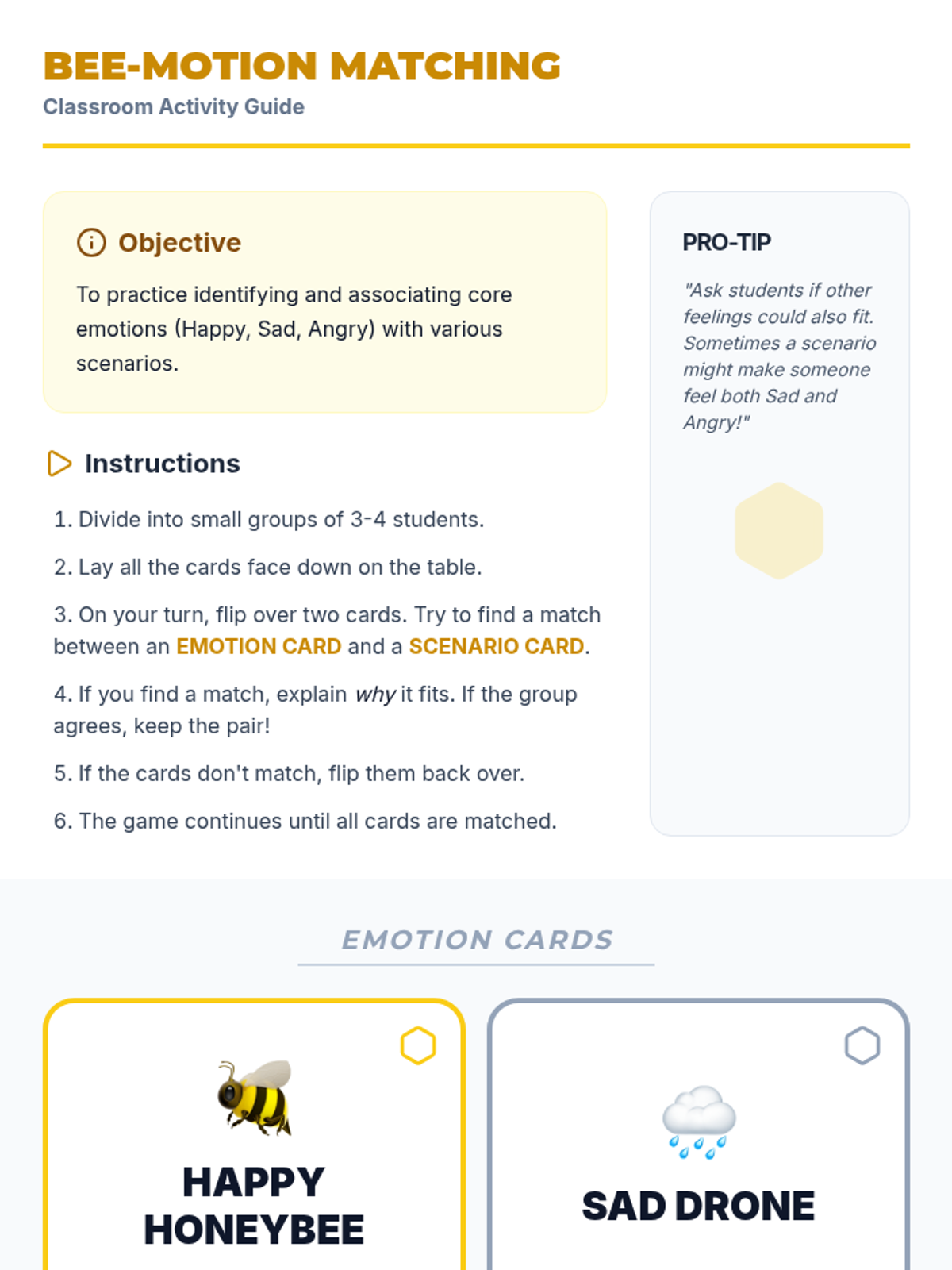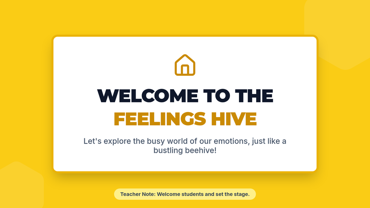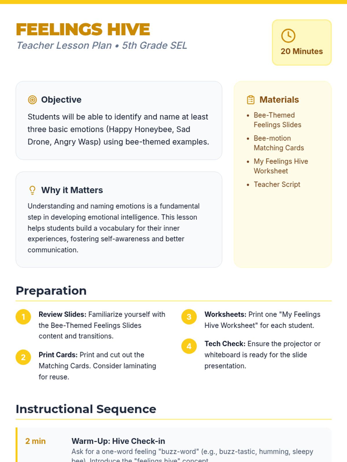 A 20-minute SEL lesson for 5th grade that uses a bee-themed metaphor to help students identify and name basic emotions (Happy, Sad, Angry) through slides, matching activities, and personal reflection.