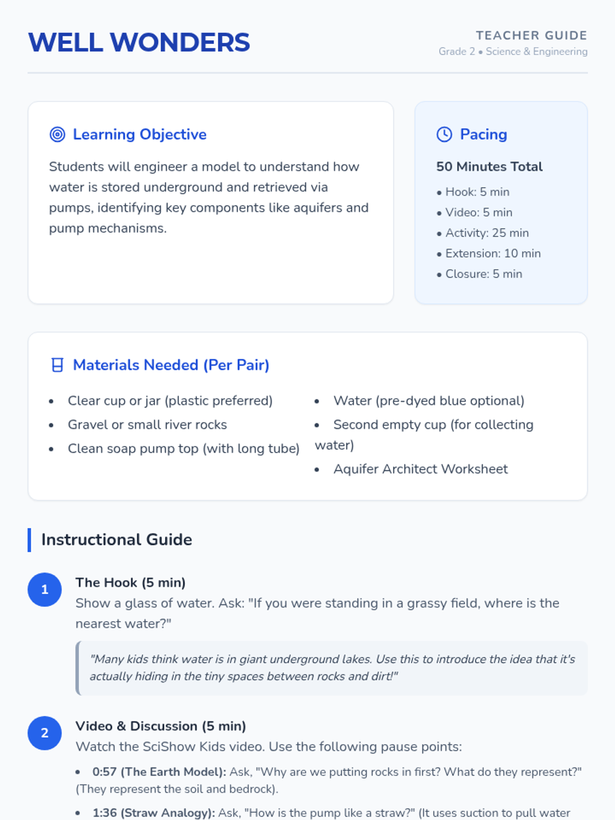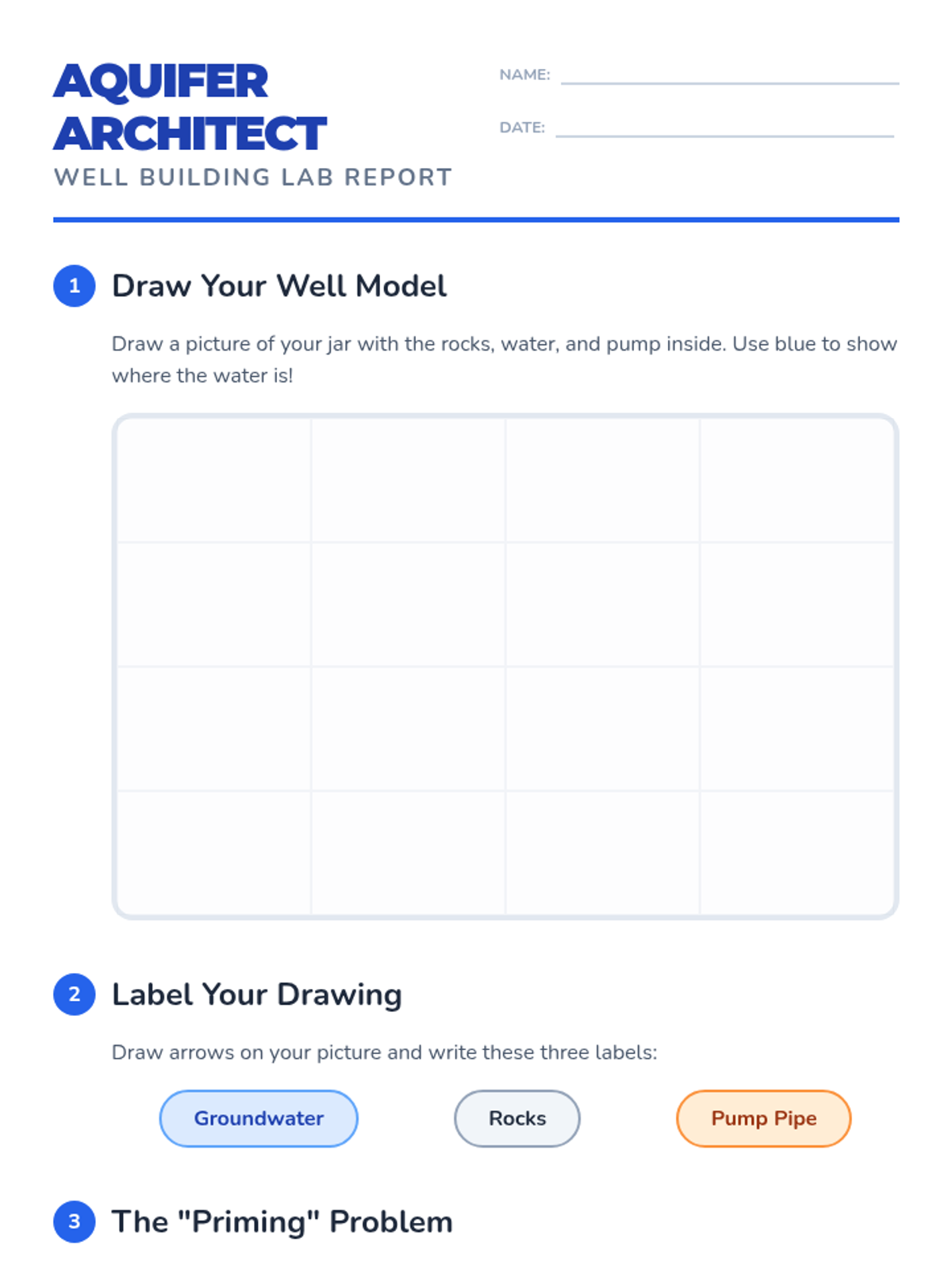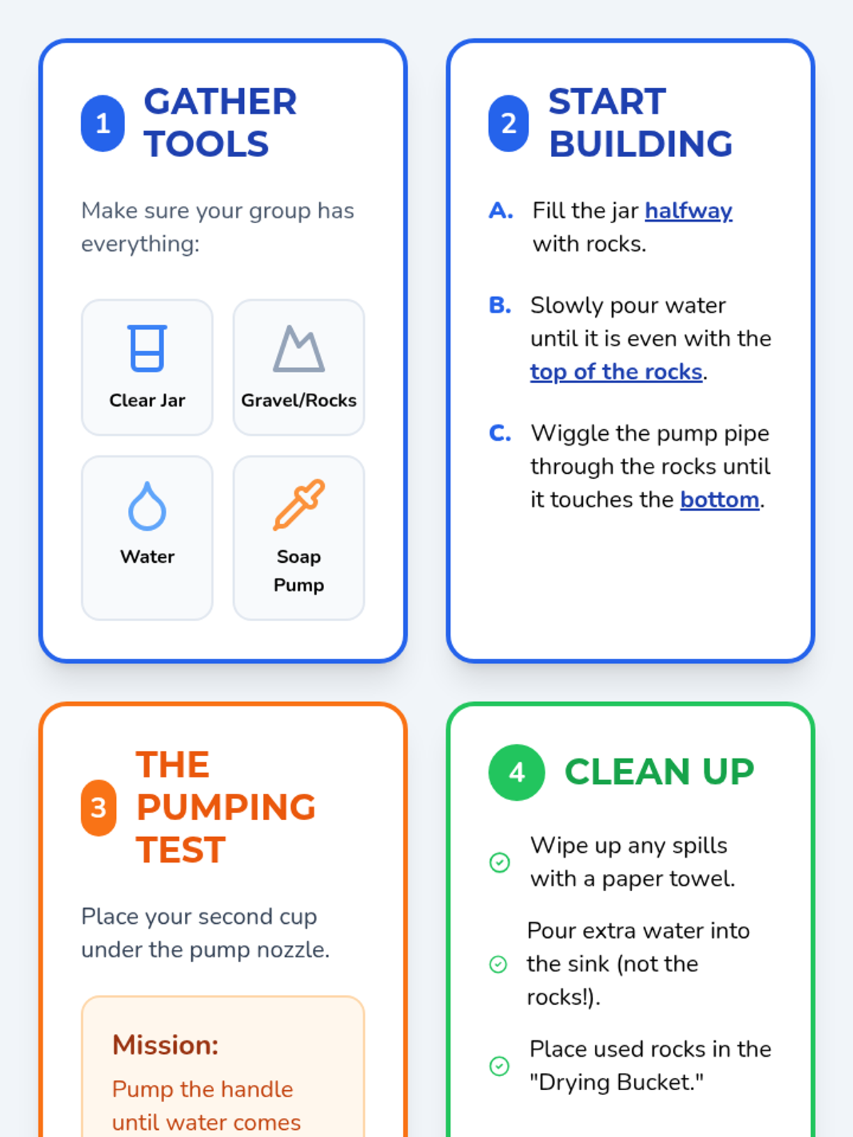 Students will explore how groundwater is stored in aquifers and retrieved using mechanical energy by building a functional model of a well using rocks, water, and soap pumps.