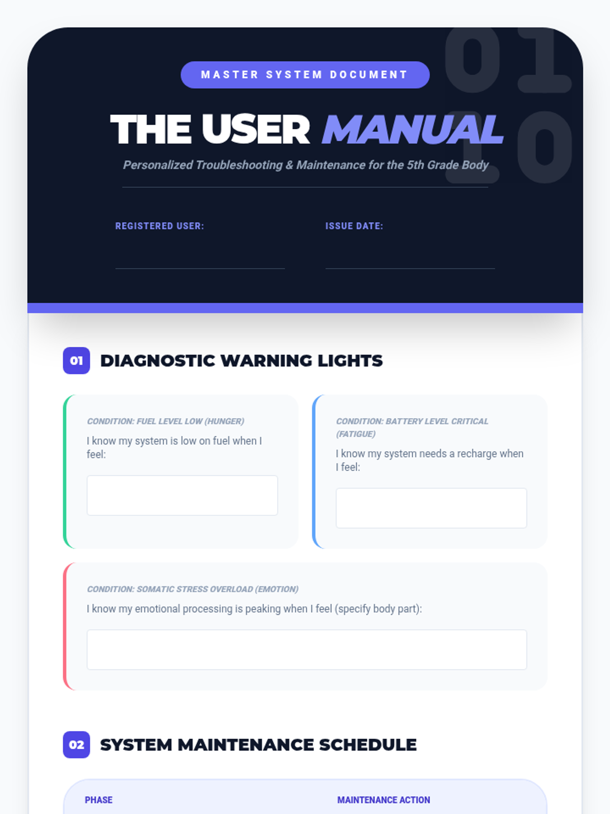 Students synthesize their learning into a personalized 'User Manual' for their bodies, creating a tangible wellness protocol that lists daily non-negotiables and response strategies for warning signs.