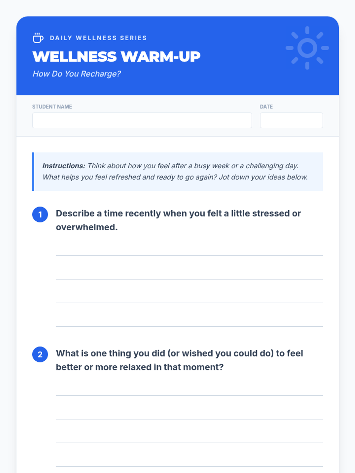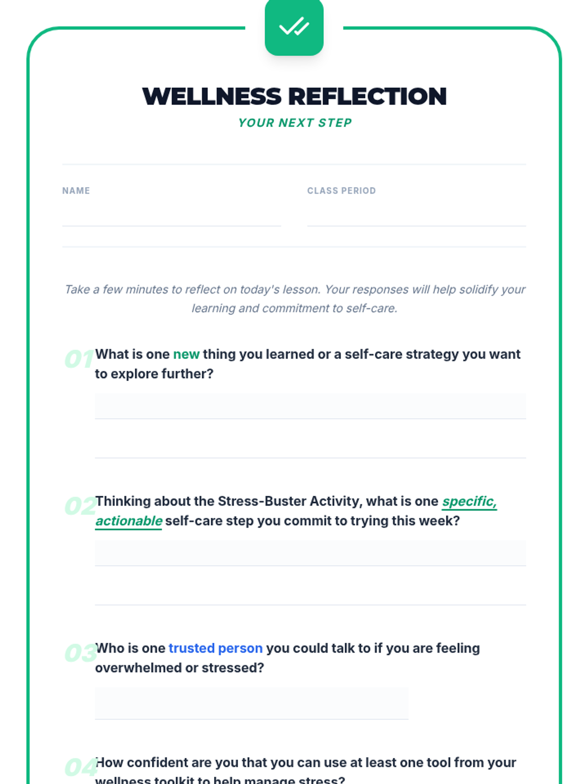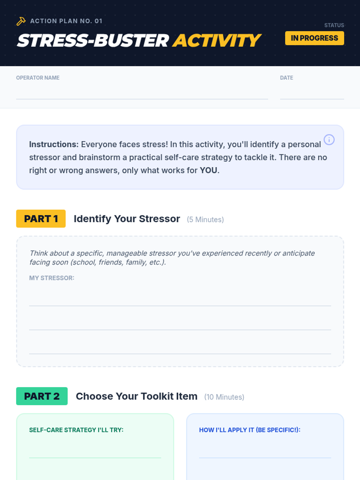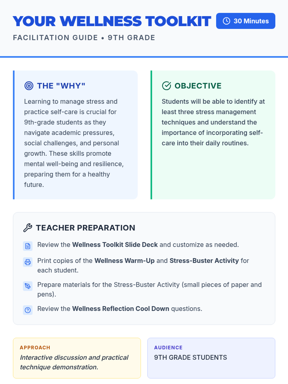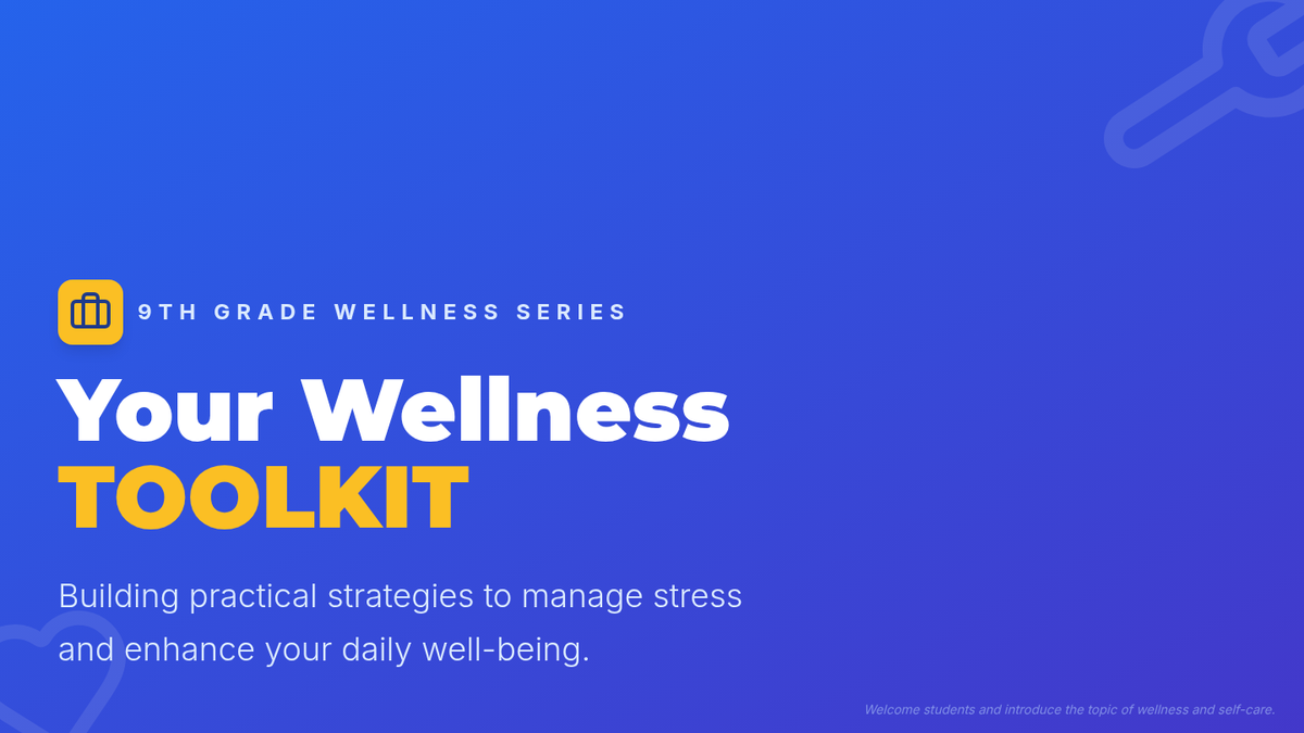 A 30-minute introductory lesson for 9th graders focused on identifying personal stressors and building a 'toolkit' of actionable self-care strategies for mental and emotional well-being.