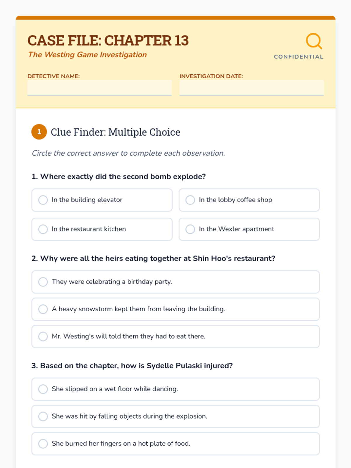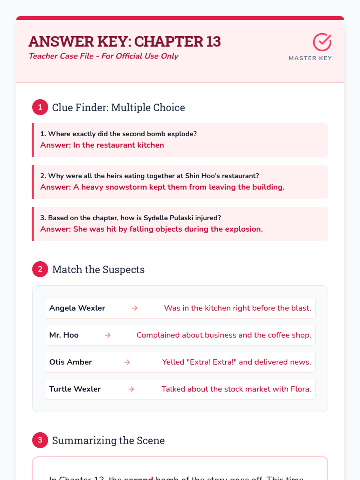 This lesson focuses on Chapter 13 of The Westing Game, simplified for 3rd-4th grade readers. Students will investigate the second bomb at Shin Hoo's Restaurant through sequencing, inference-based questions, and character analysis.