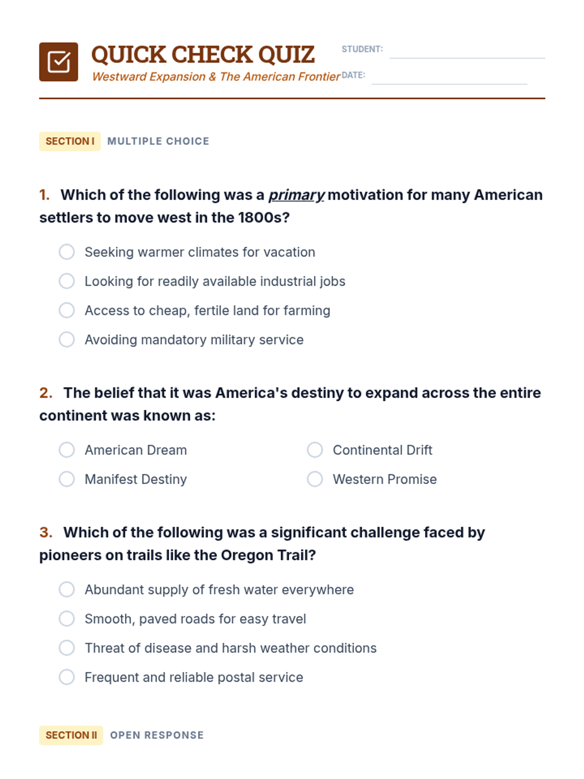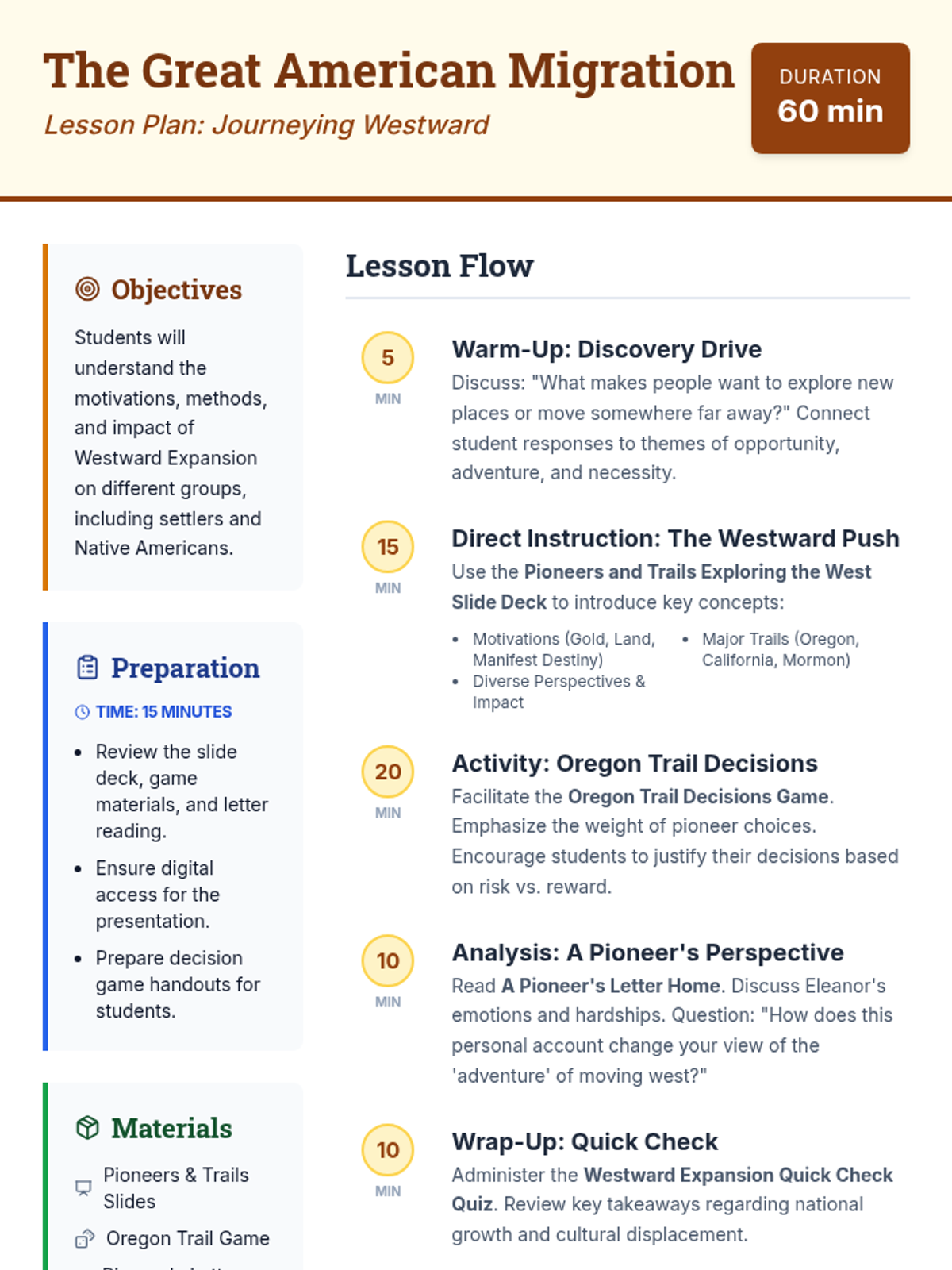 A comprehensive 60-minute journey through Westward Expansion, exploring motivations, trails, and the diverse impacts on different groups through interactive slides, a decision-making game, and primary source analysis.