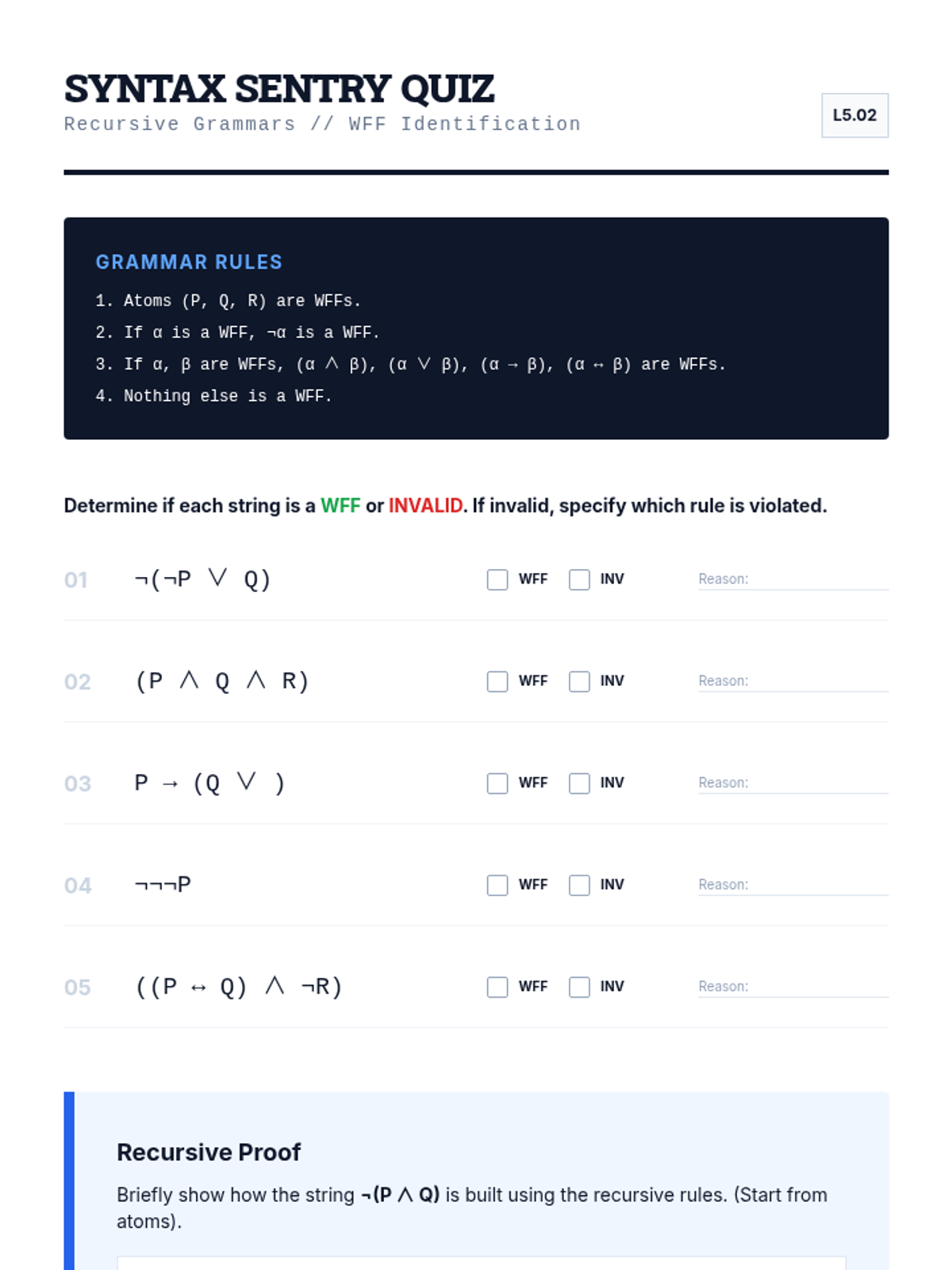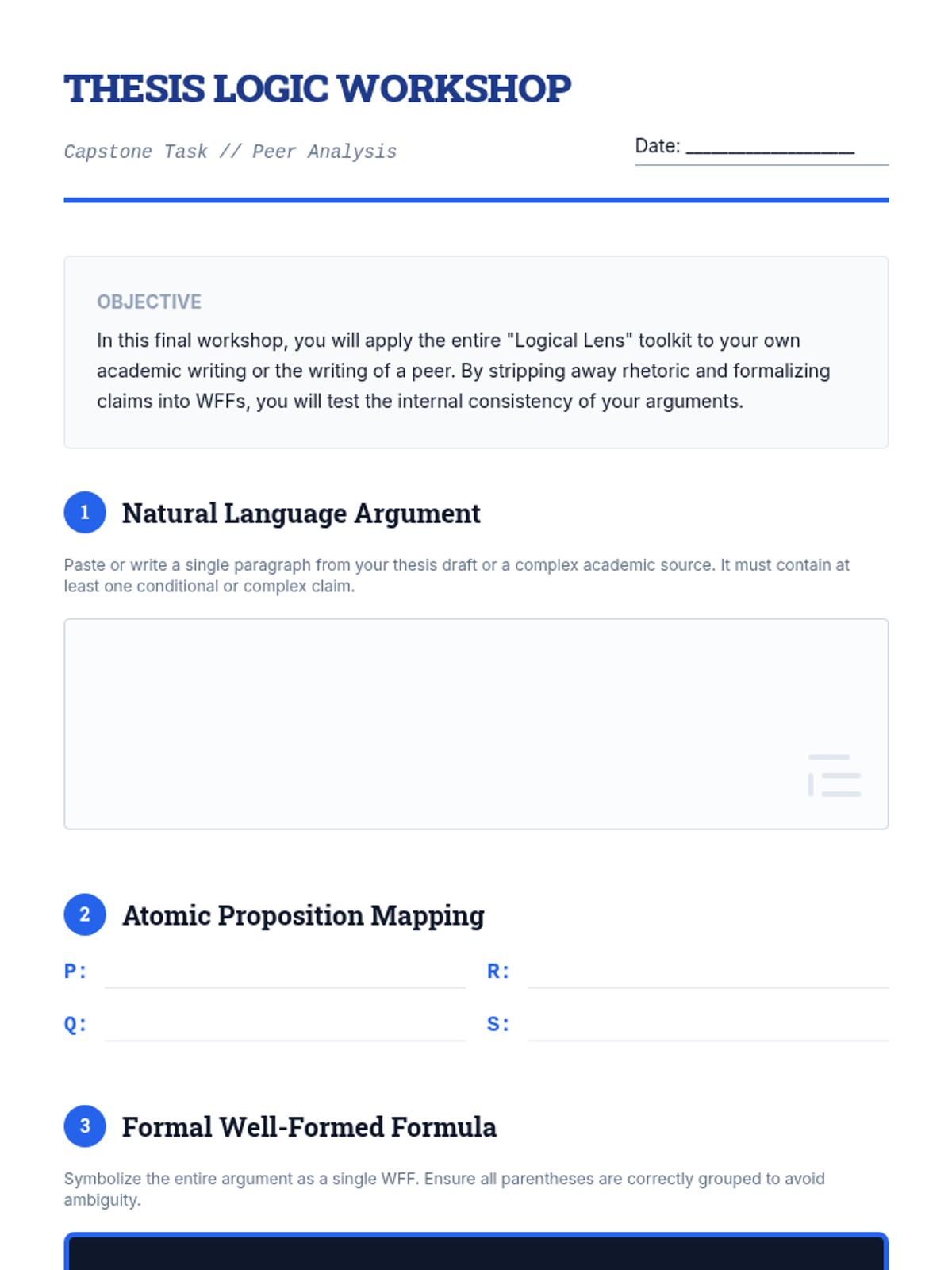 Students learn the recursive grammar rules that determine if a string of symbols is a Well-Formed Formula. The session culminates in a translation challenge where students formalize a short argument from a peer's thesis draft.