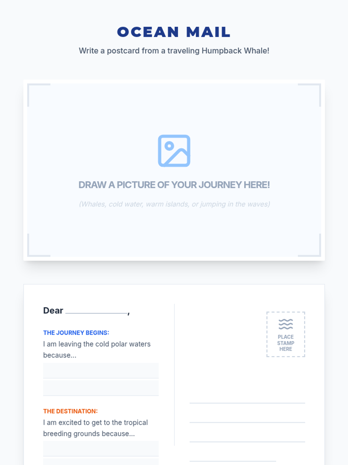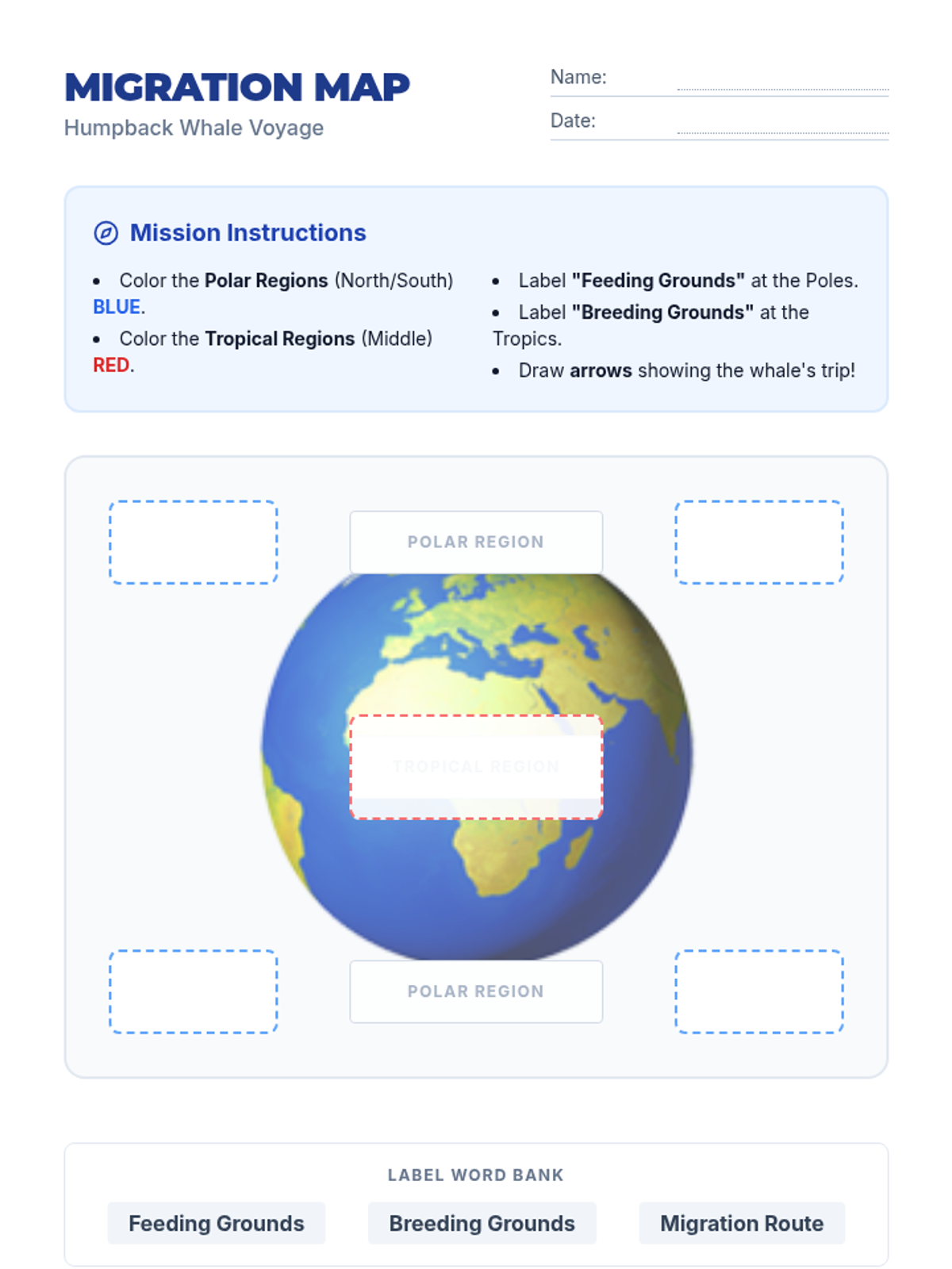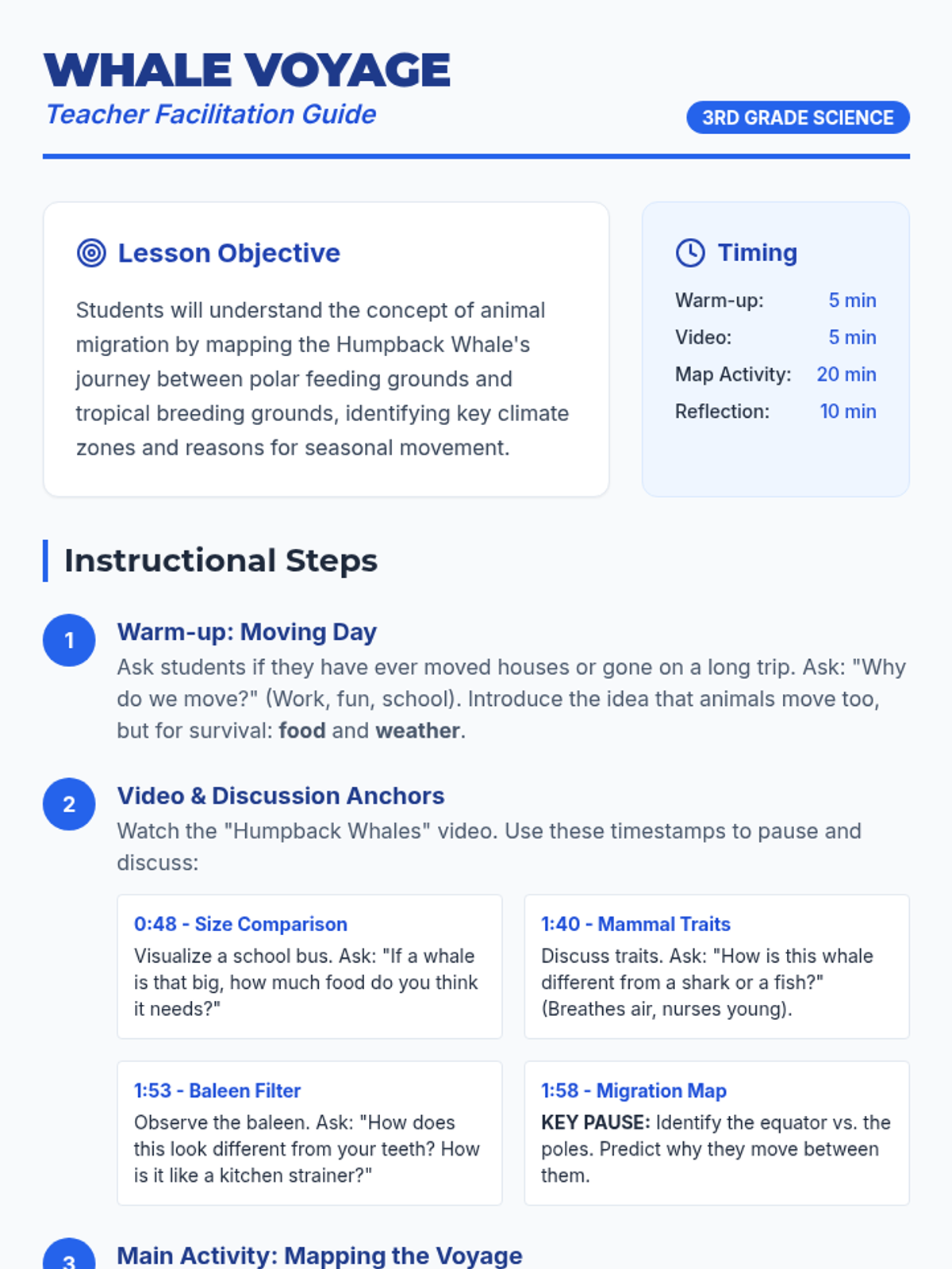 A 3rd-grade science lesson exploring the massive seasonal journeys of Humpback Whales, focusing on geography, climate zones, and animal adaptations.