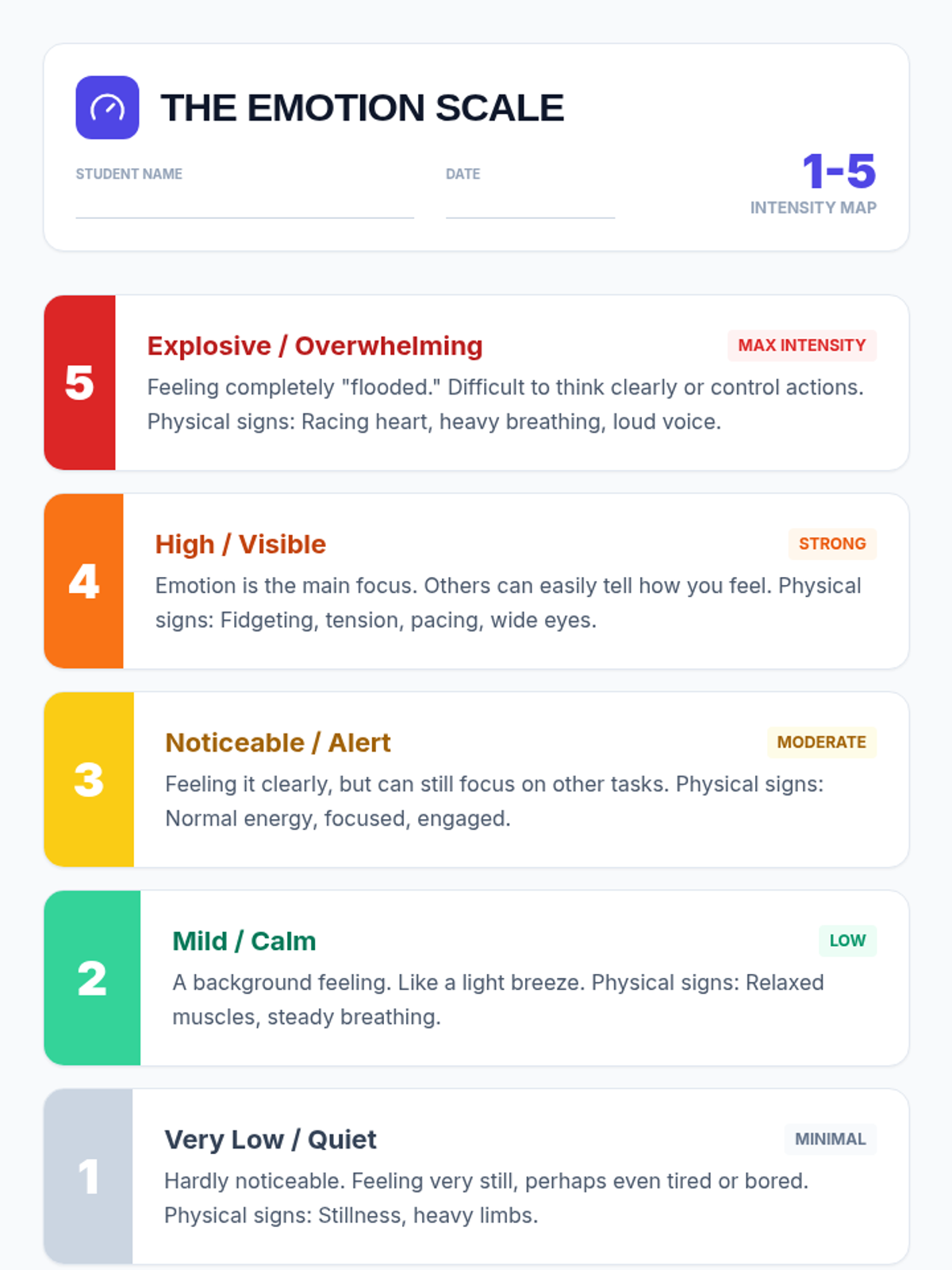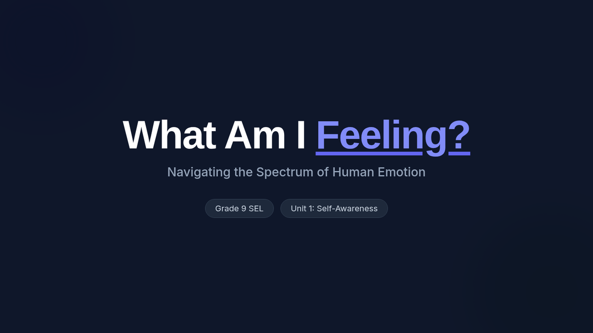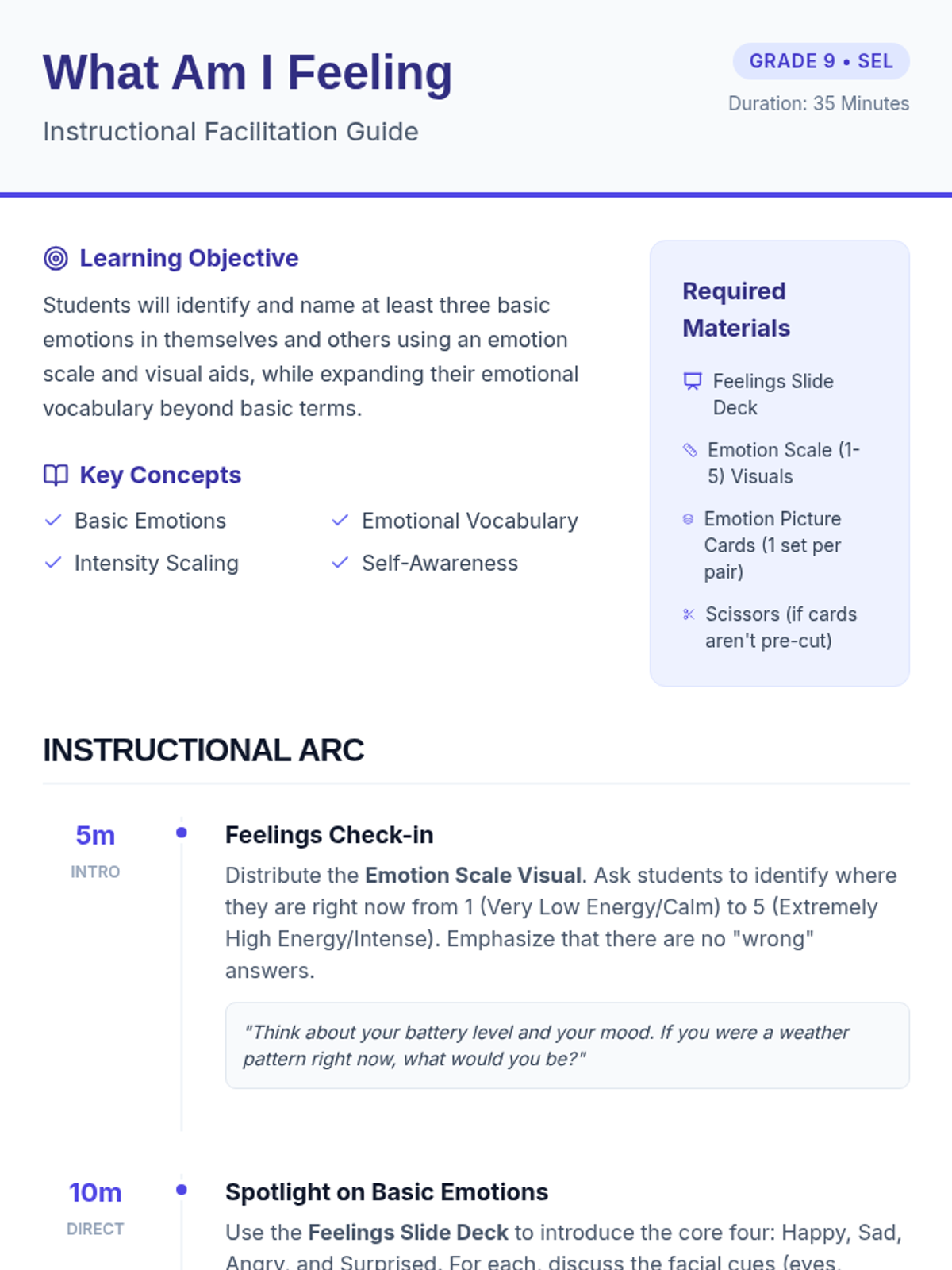 A 35-minute social-emotional learning lesson for 9th graders focused on identifying basic emotions, expanding emotional vocabulary, and recognizing emotional intensity through an interactive scale and matching activities.
