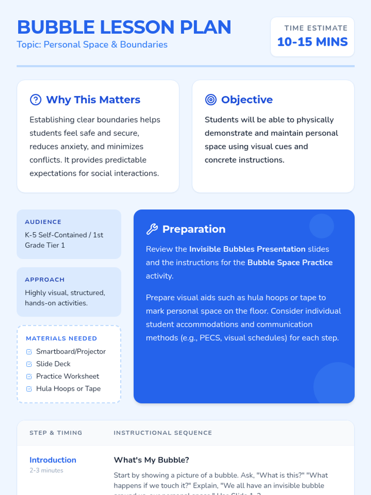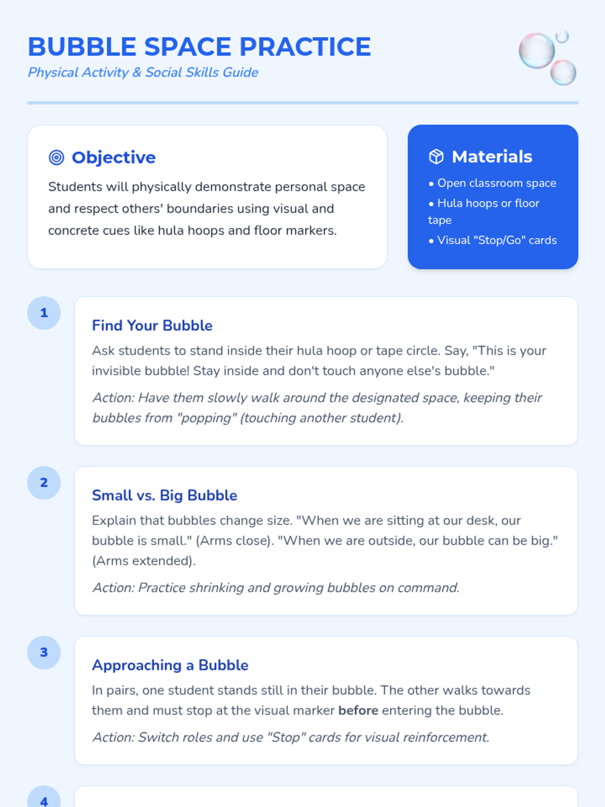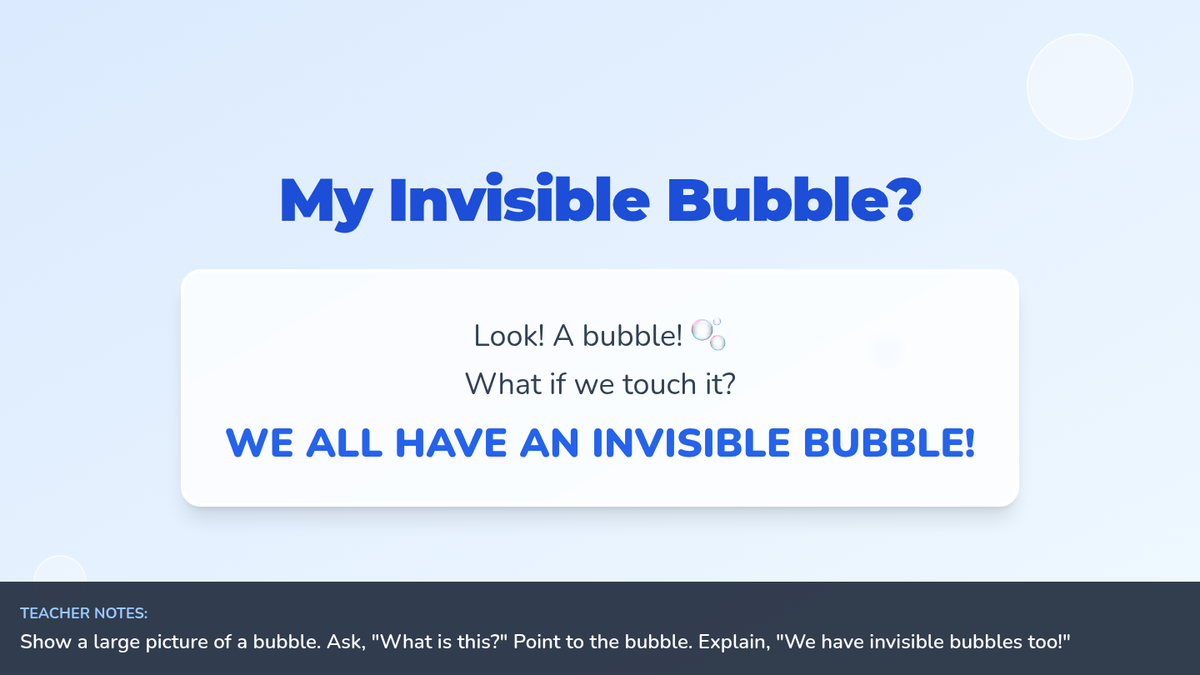 A 10-minute lesson for 1st graders (and students with severe autism) to learn about personal space through the metaphor of an 'invisible bubble.' Students will learn why personal space is important and how to respect the boundaries of others.