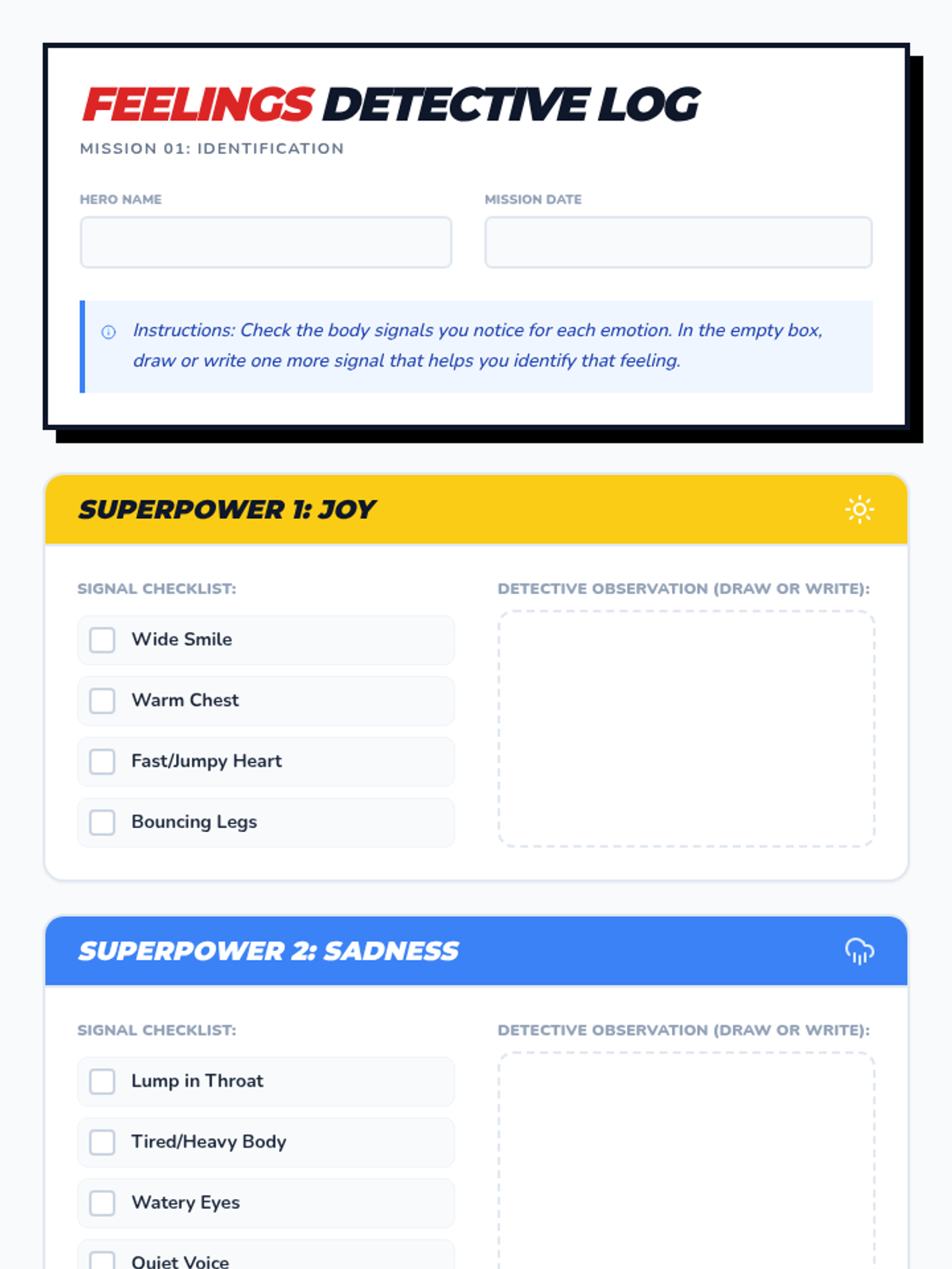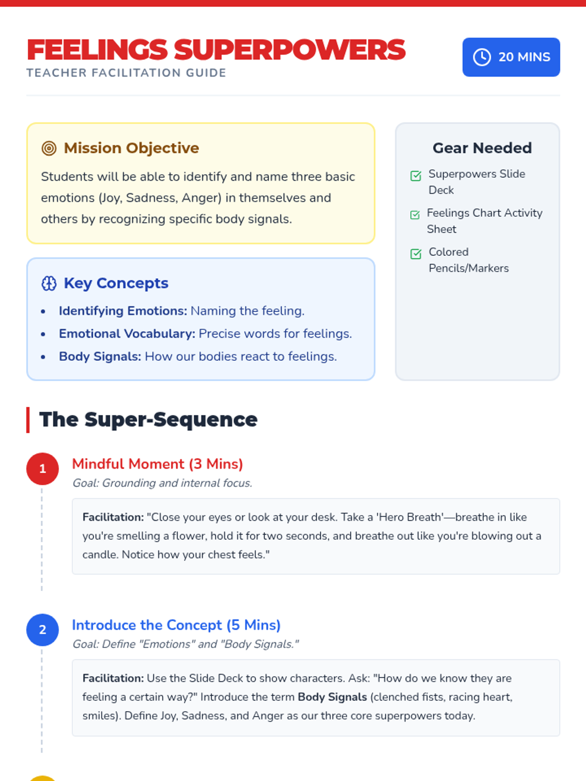 A 20-minute introductory lesson for 4th graders on identifying and naming basic emotions using body signals and emotional vocabulary through a superhero theme.