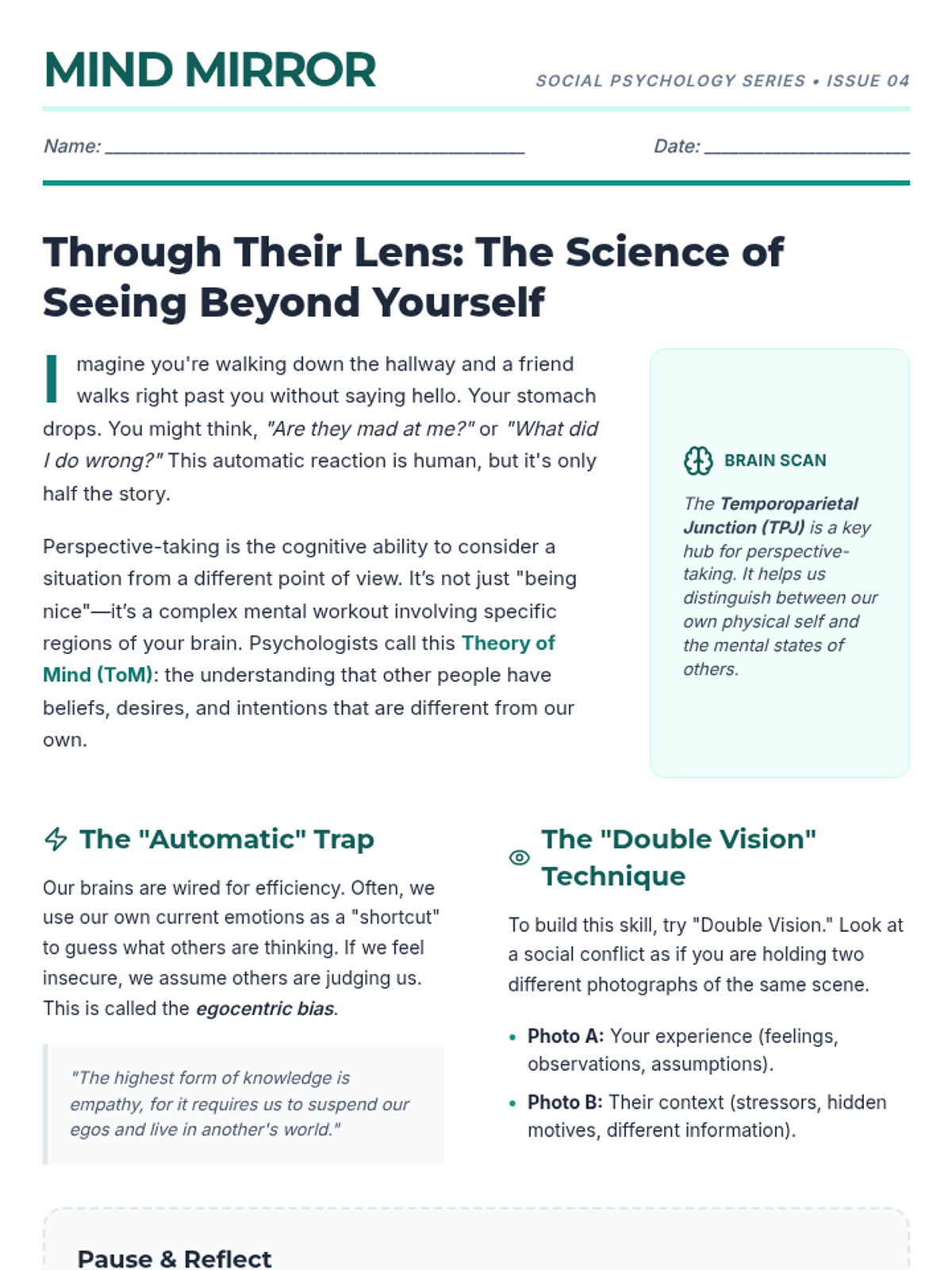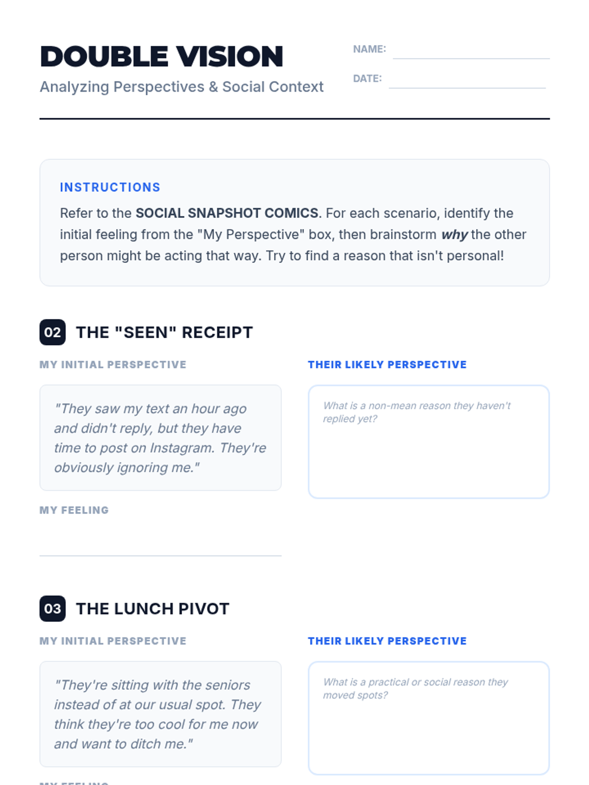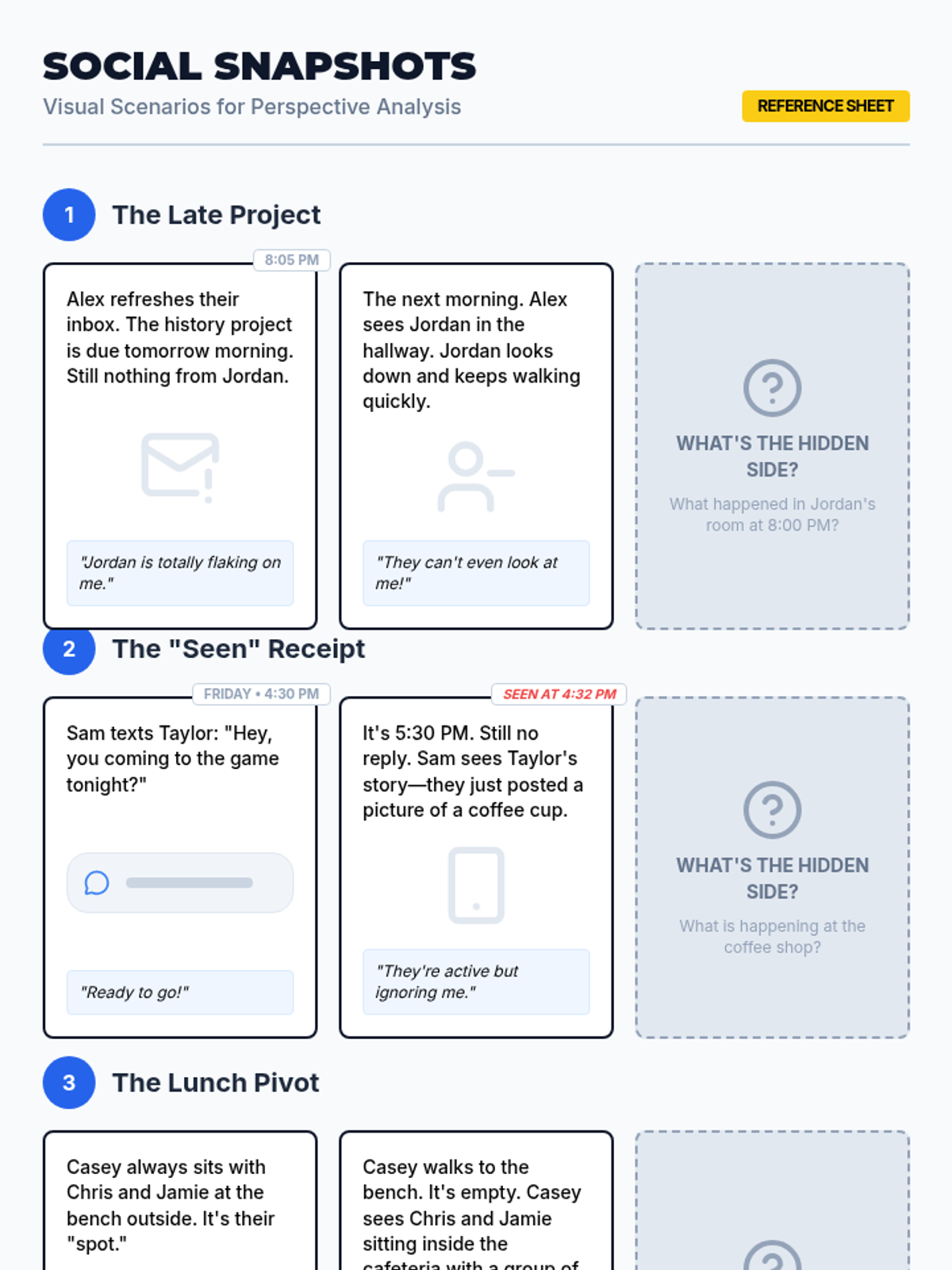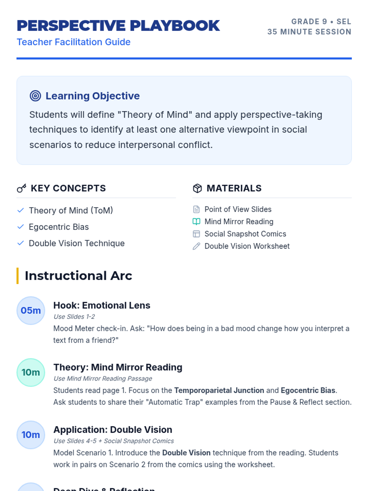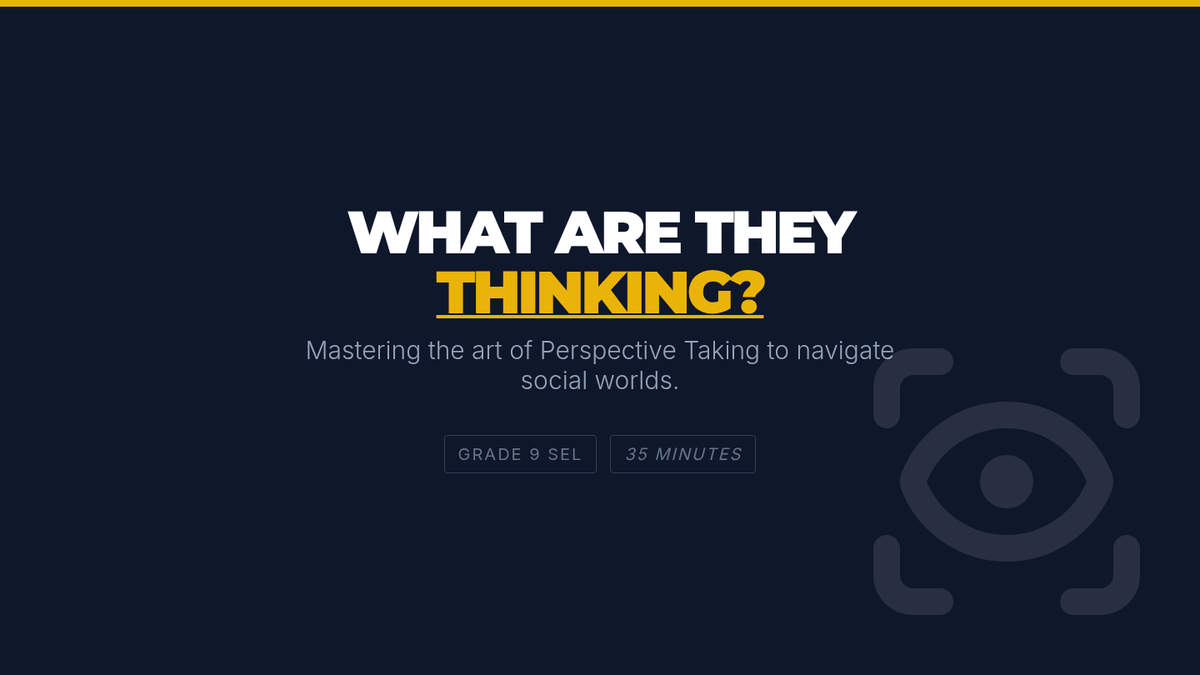 A 35-minute SEL lesson for 9th graders focused on developing perspective-taking skills through scenario analysis and partner discussion. Students learn to identify alternative viewpoints to foster empathy and reduce social conflict.