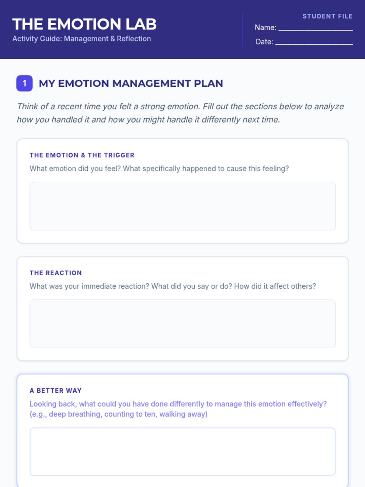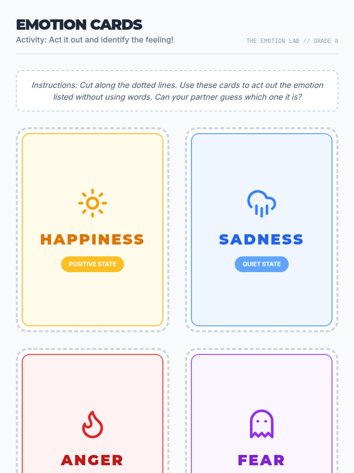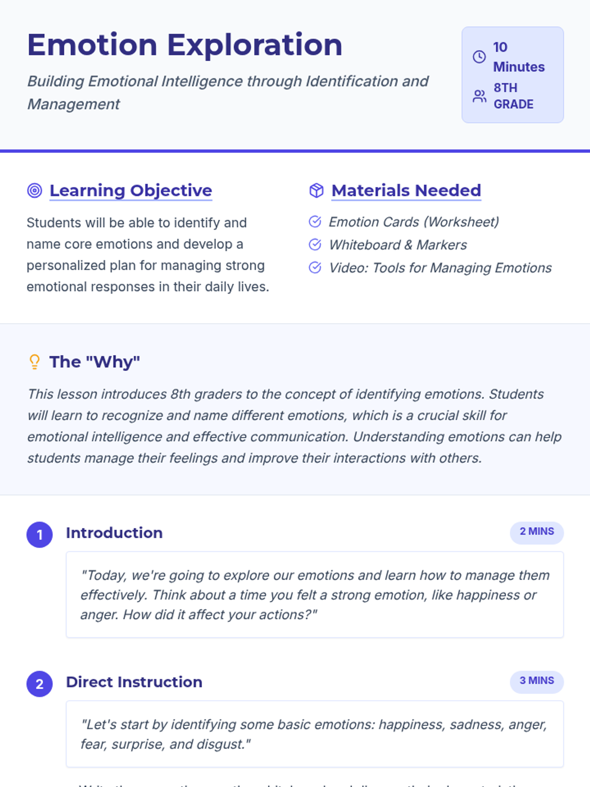 An engaging 1-session lesson for 8th graders where students learn to identify and manage common emotions, building emotional intelligence and communication skills through interactive activities and reflection.