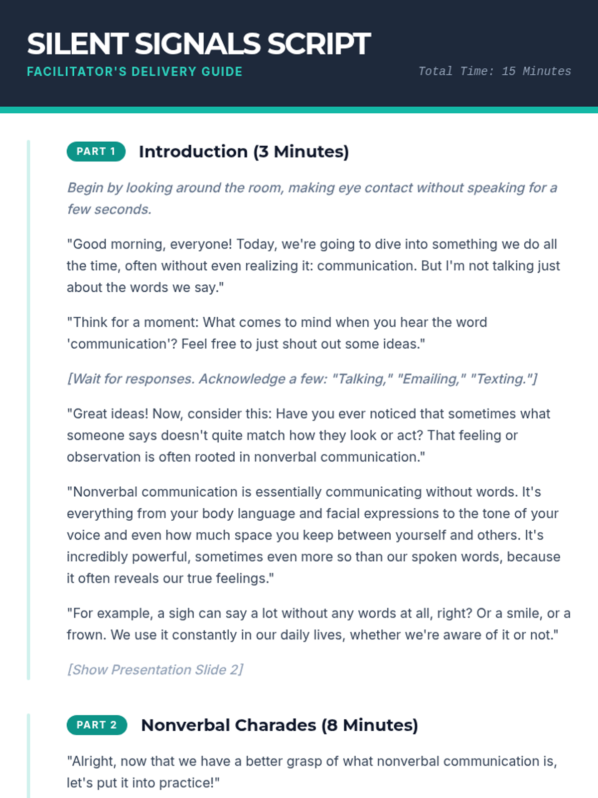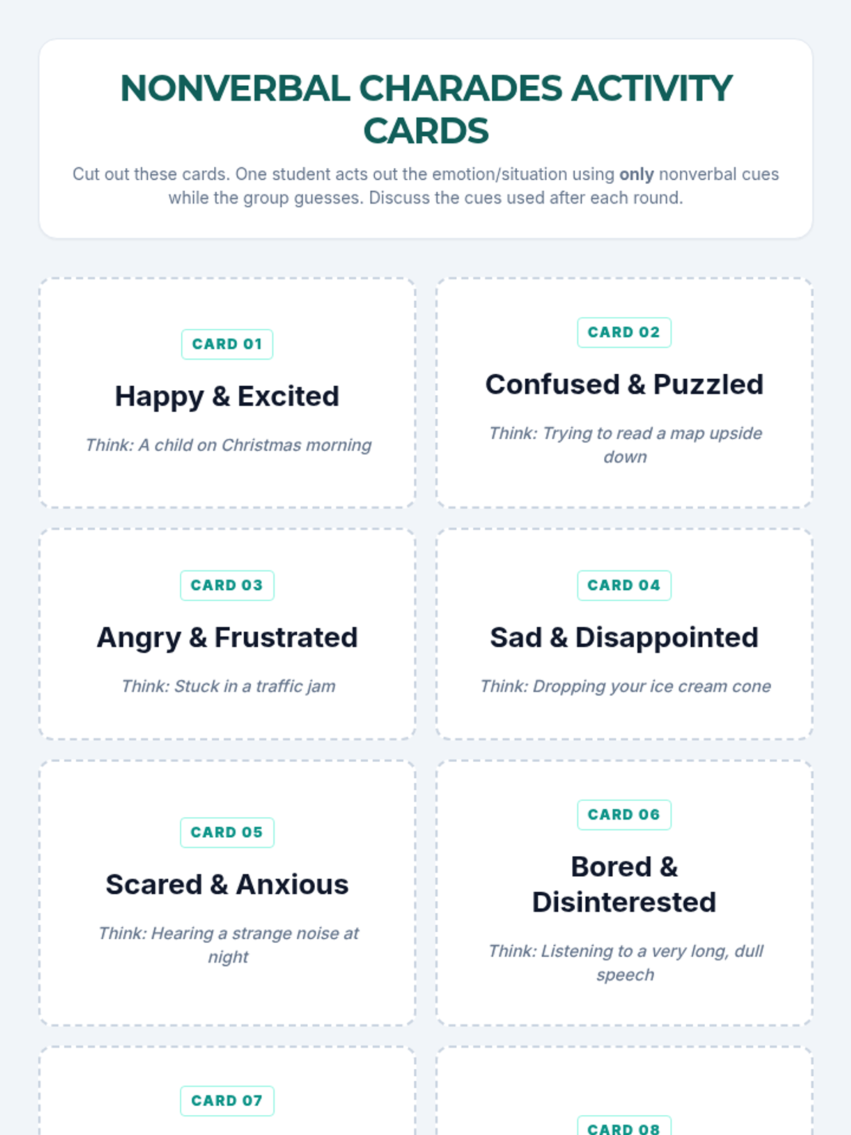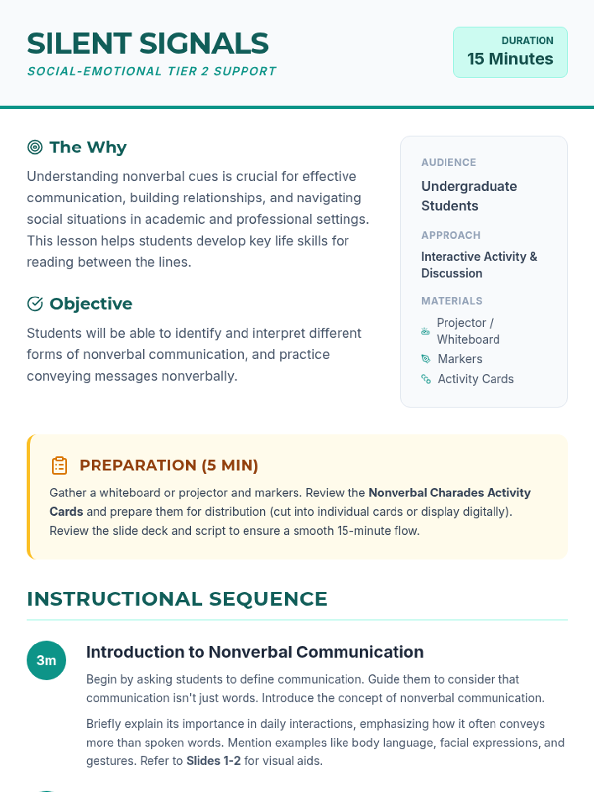 A 15-minute interactive lesson for undergraduate students focused on identifying, interpreting, and practicing nonverbal communication cues through discussion and charades.