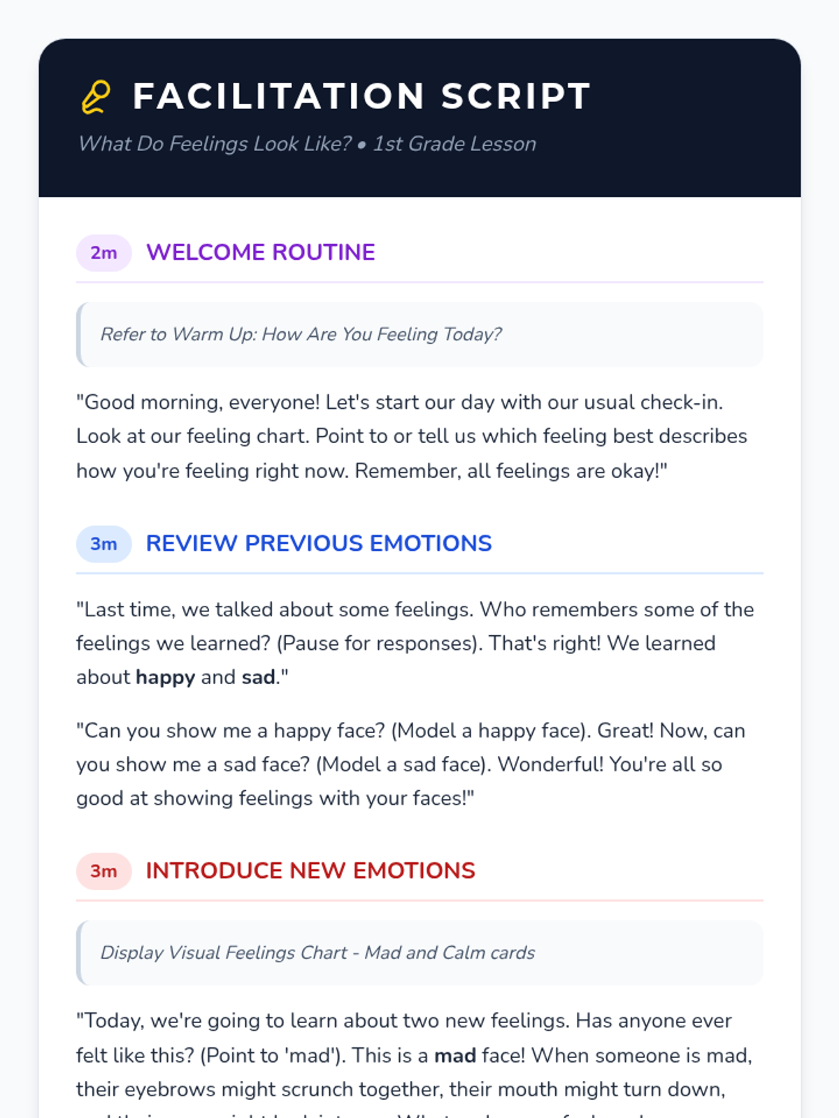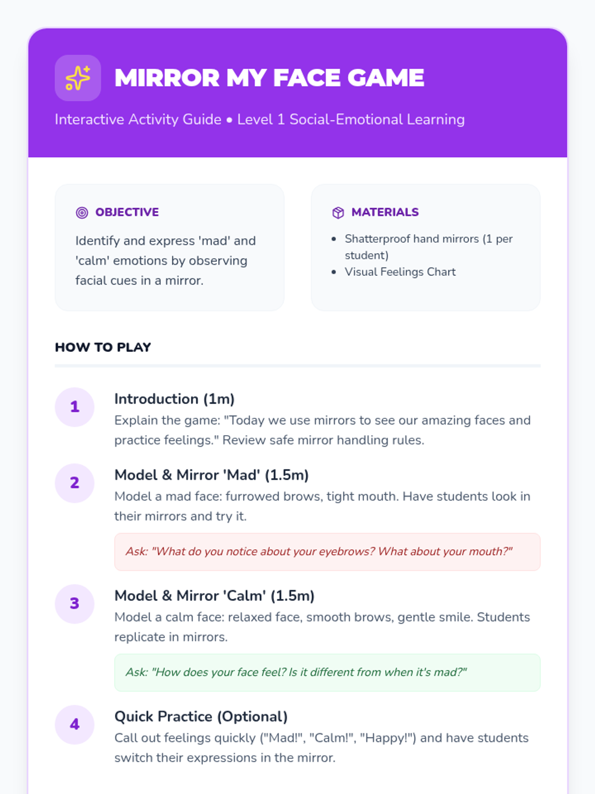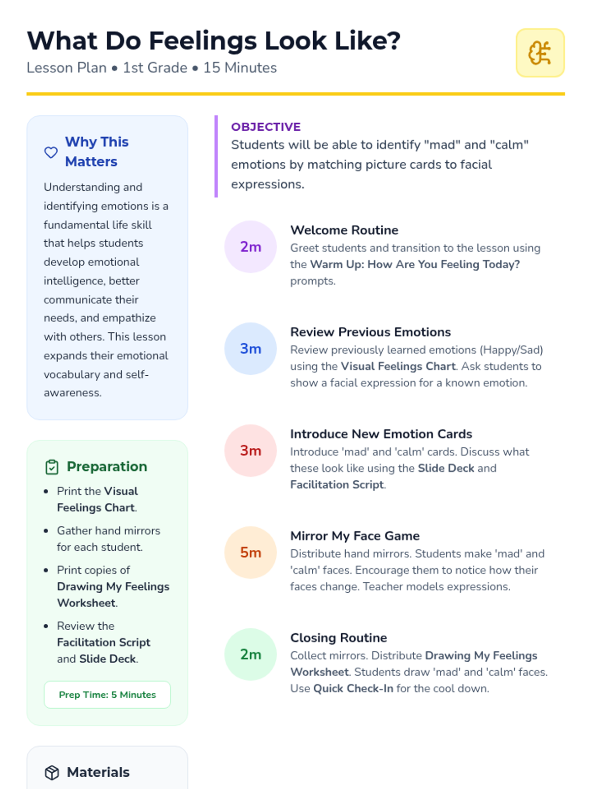 A 15-minute introductory lesson for 1st graders focused on identifying 'mad' and 'calm' emotions through facial expressions and interactive mirroring activities.