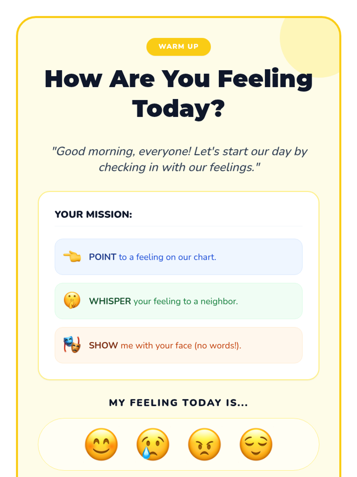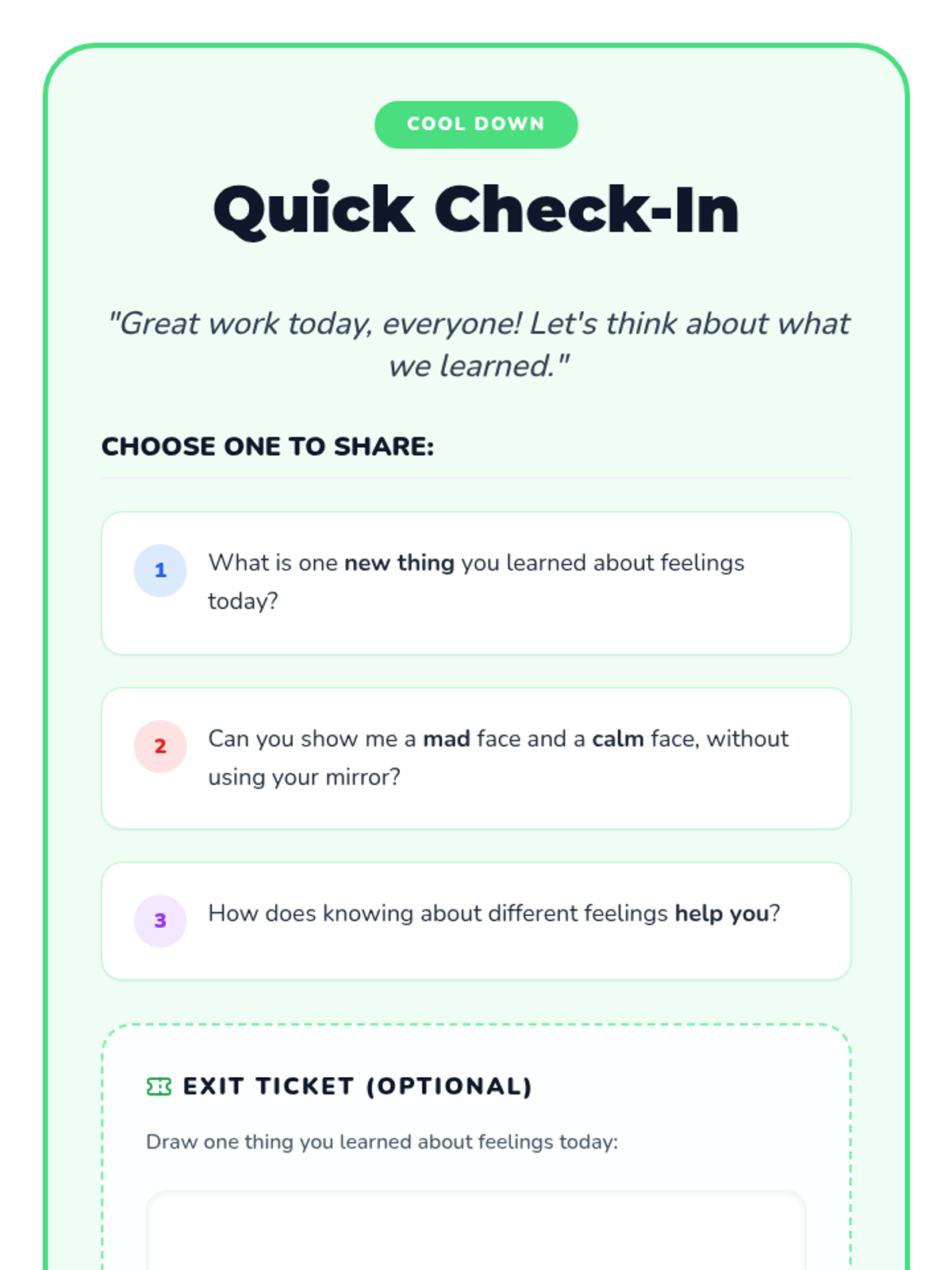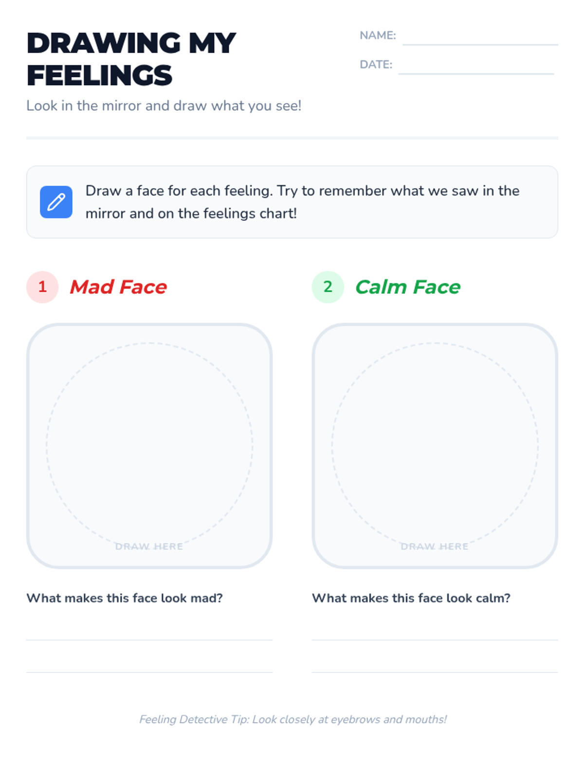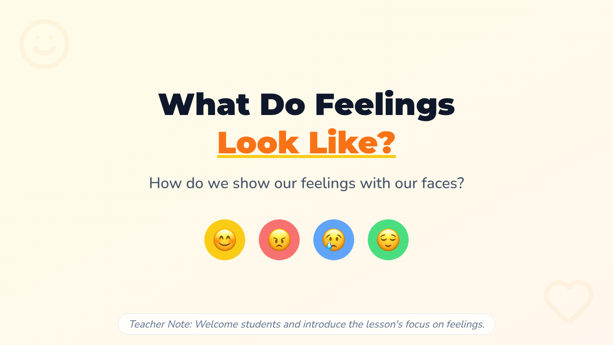 A 15-minute introductory lesson for 1st graders focused on identifying 'mad' and 'calm' emotions through facial expressions and interactive mirroring activities.