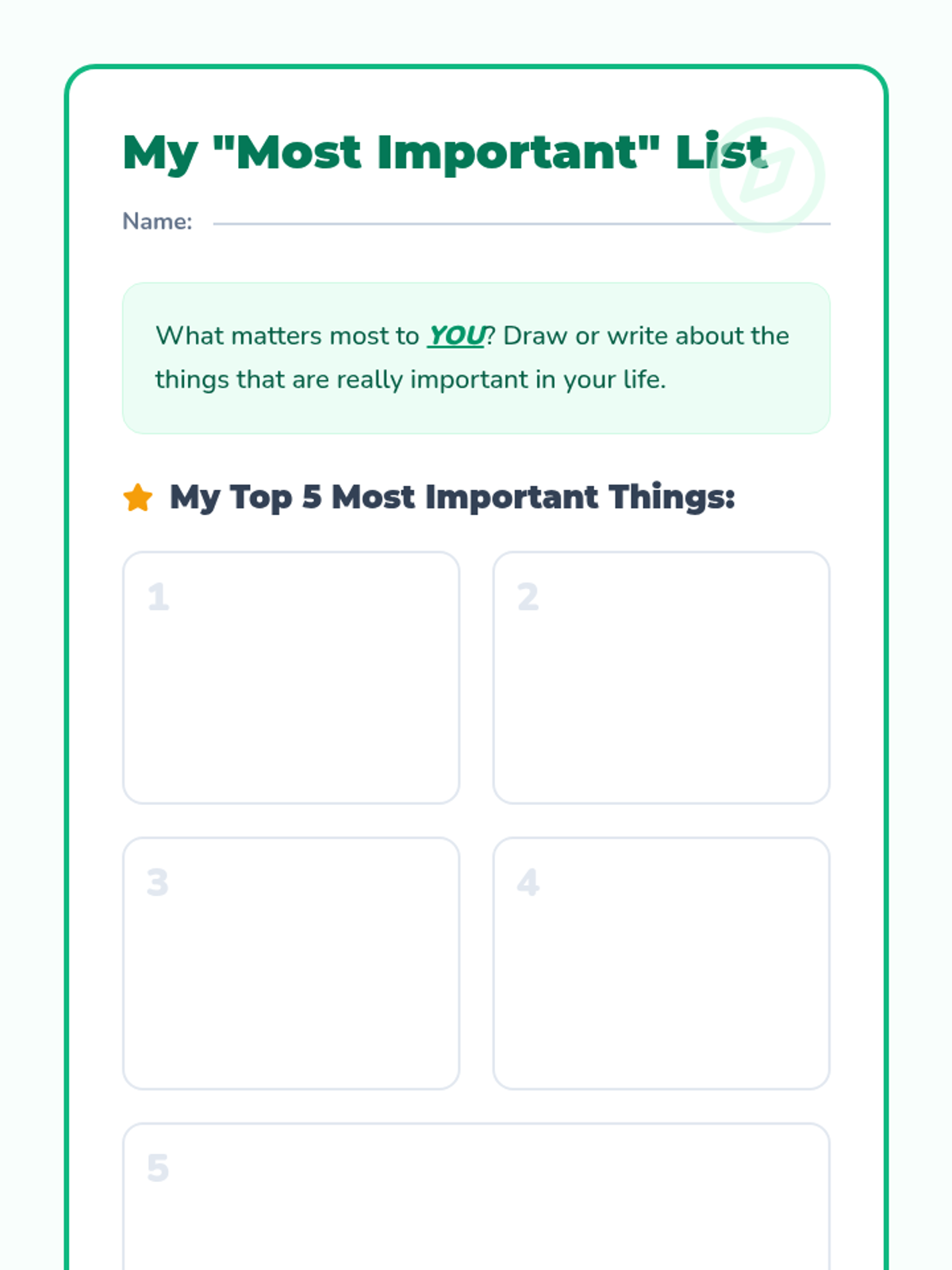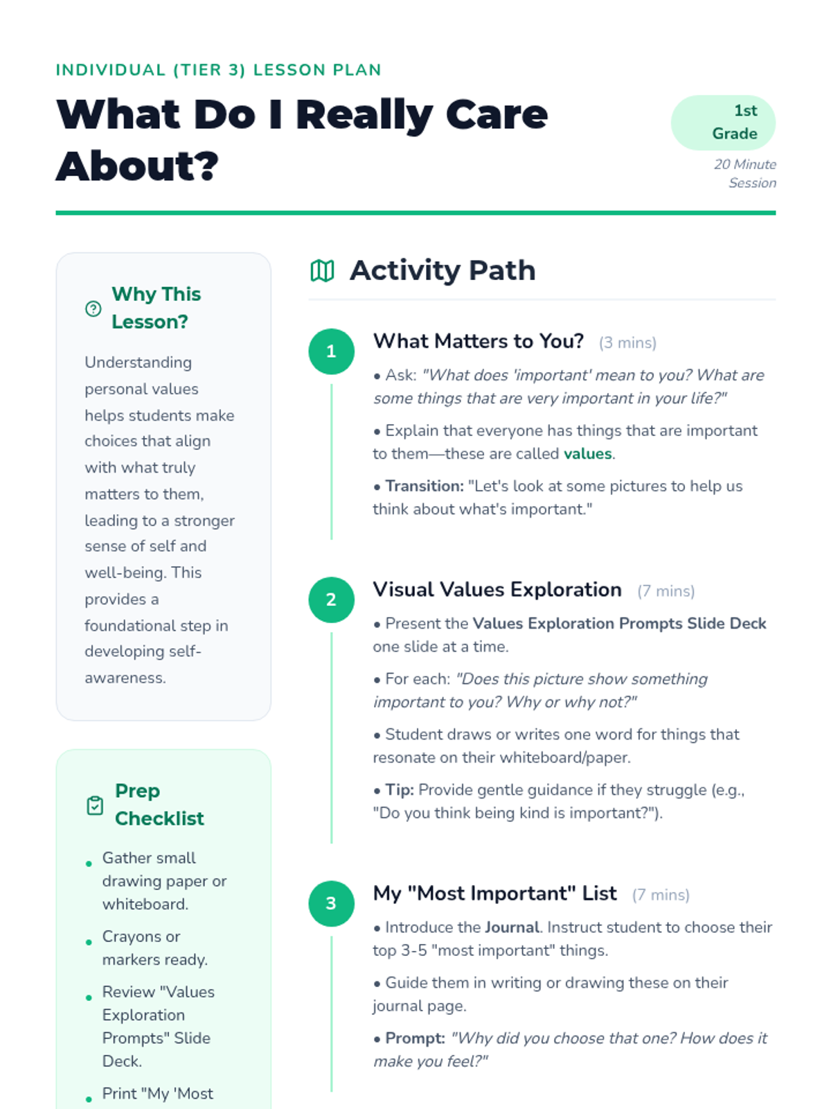 A Tier 3 individual session for 1st-grade students to explore personal values and self-awareness through visual prompts and creative journaling.