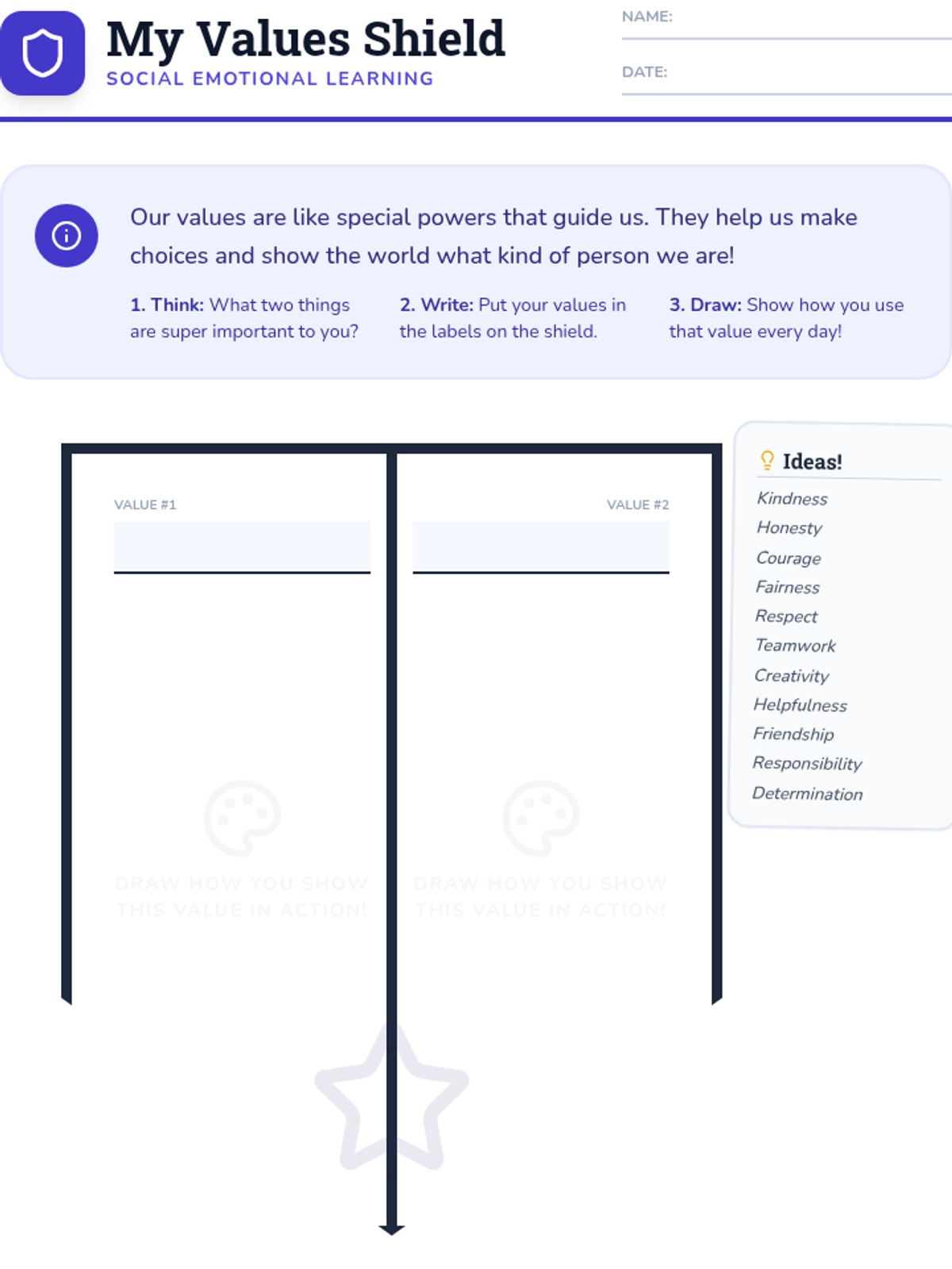A 20-minute SEL lesson for 3rd graders to identify personal values and understand how they guide actions through the creation of a 'Values Shield.'