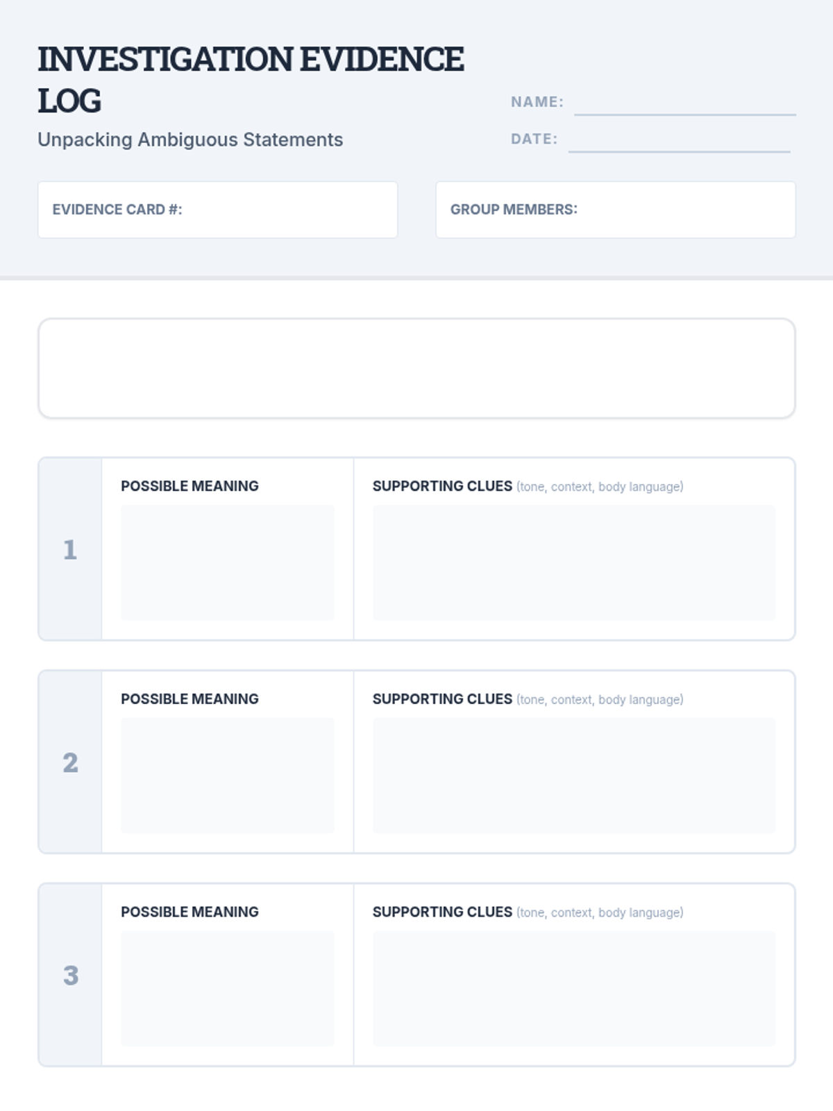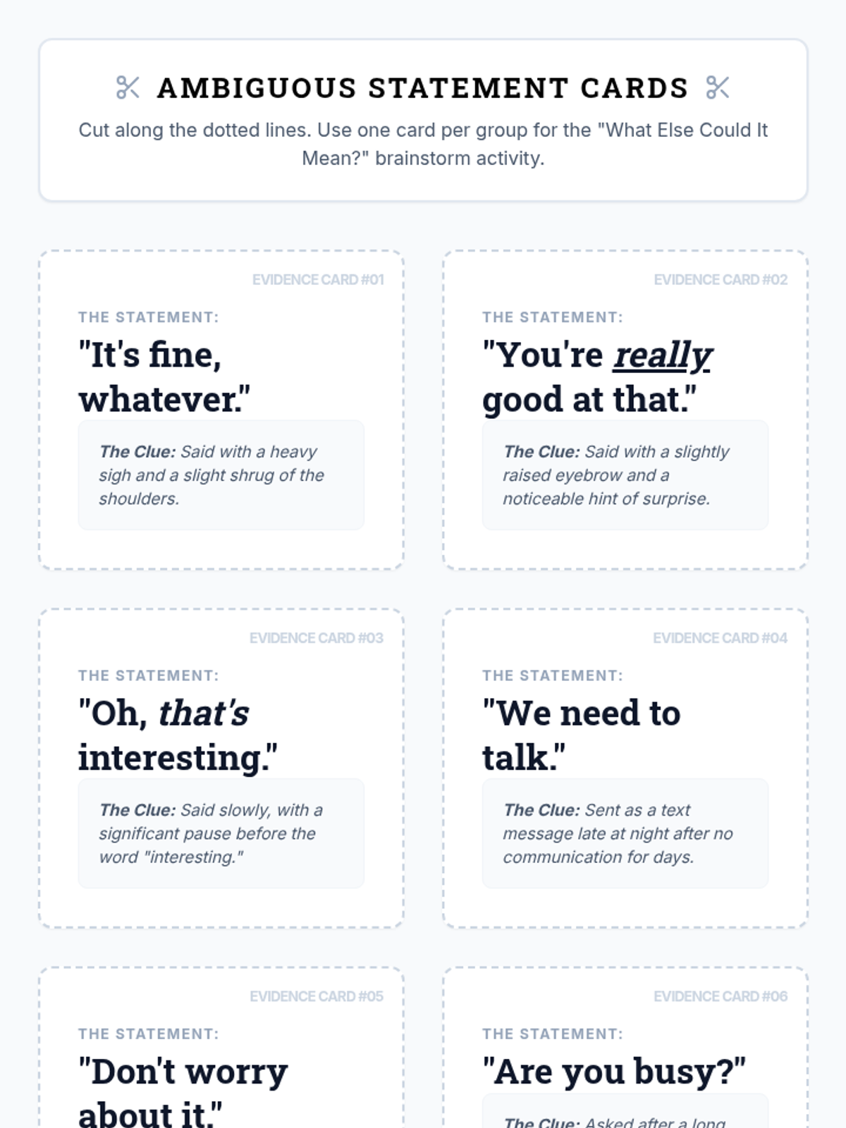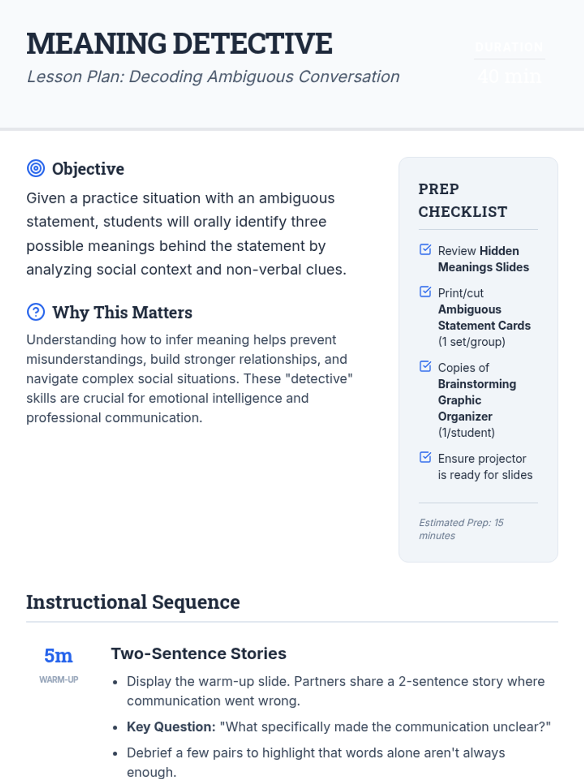 A 40-minute lesson for 9th-graders on developing inference and perspective-taking skills to navigate ambiguous social communication. Students act as 'conversation detectives' to analyze hidden meanings behind everyday statements.