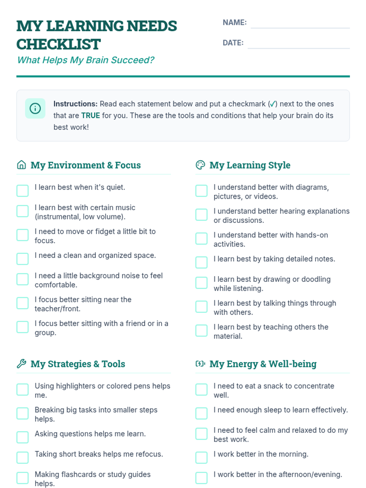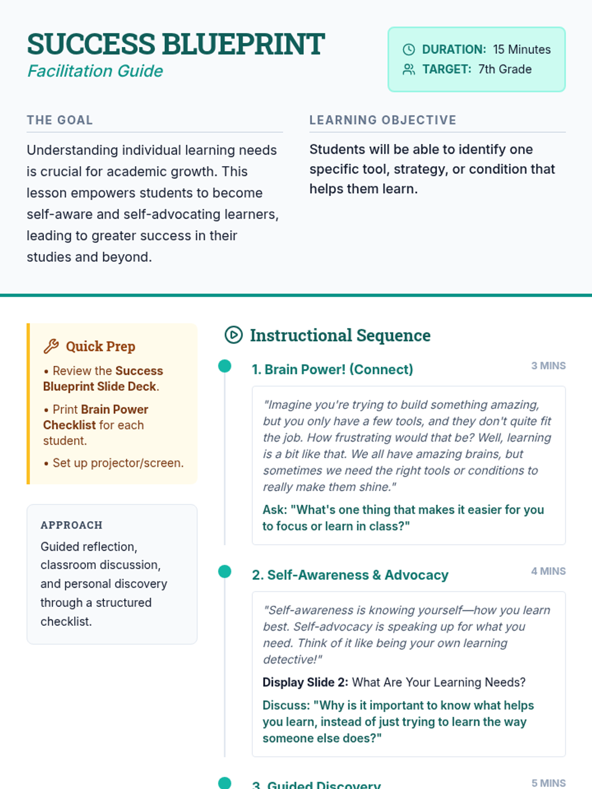 A 15-minute 7th-grade lesson that empowers students to identify their personal learning needs and develop self-advocacy skills through a self-discovery checklist.