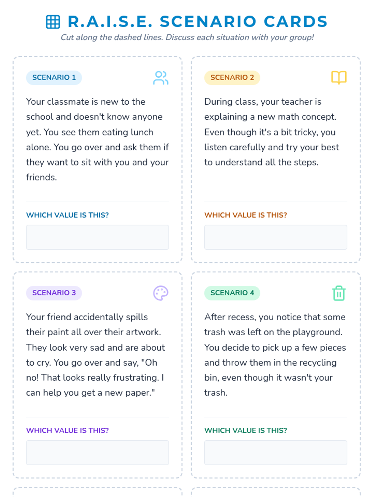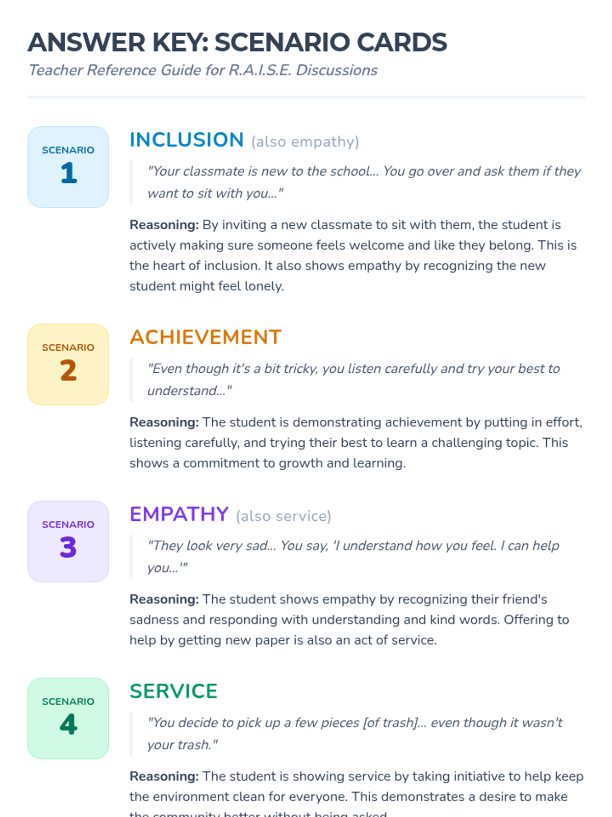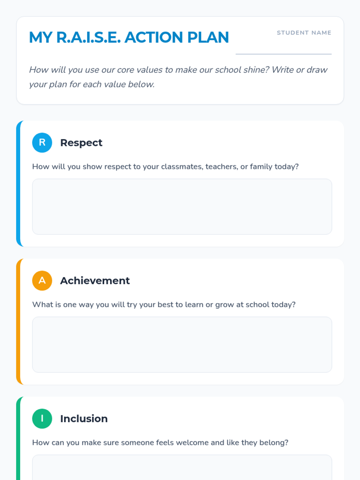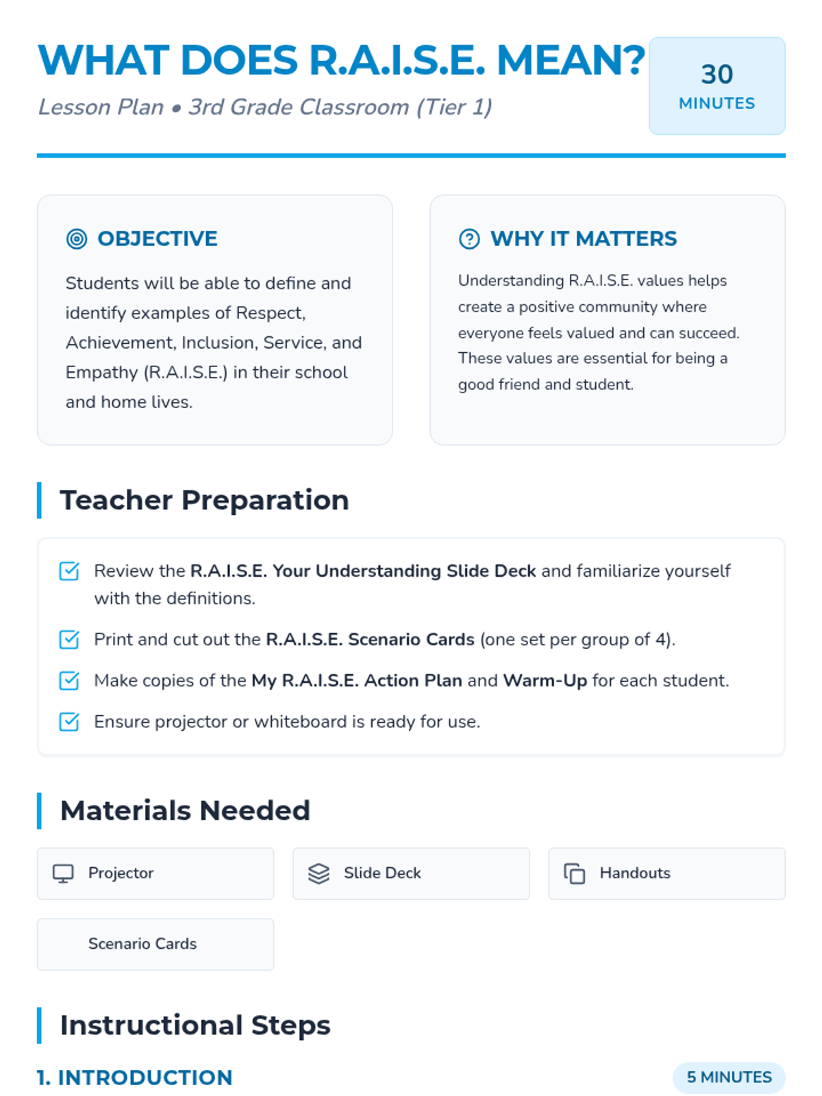 This lesson introduces 3rd-grade students to the core values of Respect, Achievement, Inclusion, Service, and Empathy (RAISE). It helps students understand what these values look like and sound like in their daily lives.