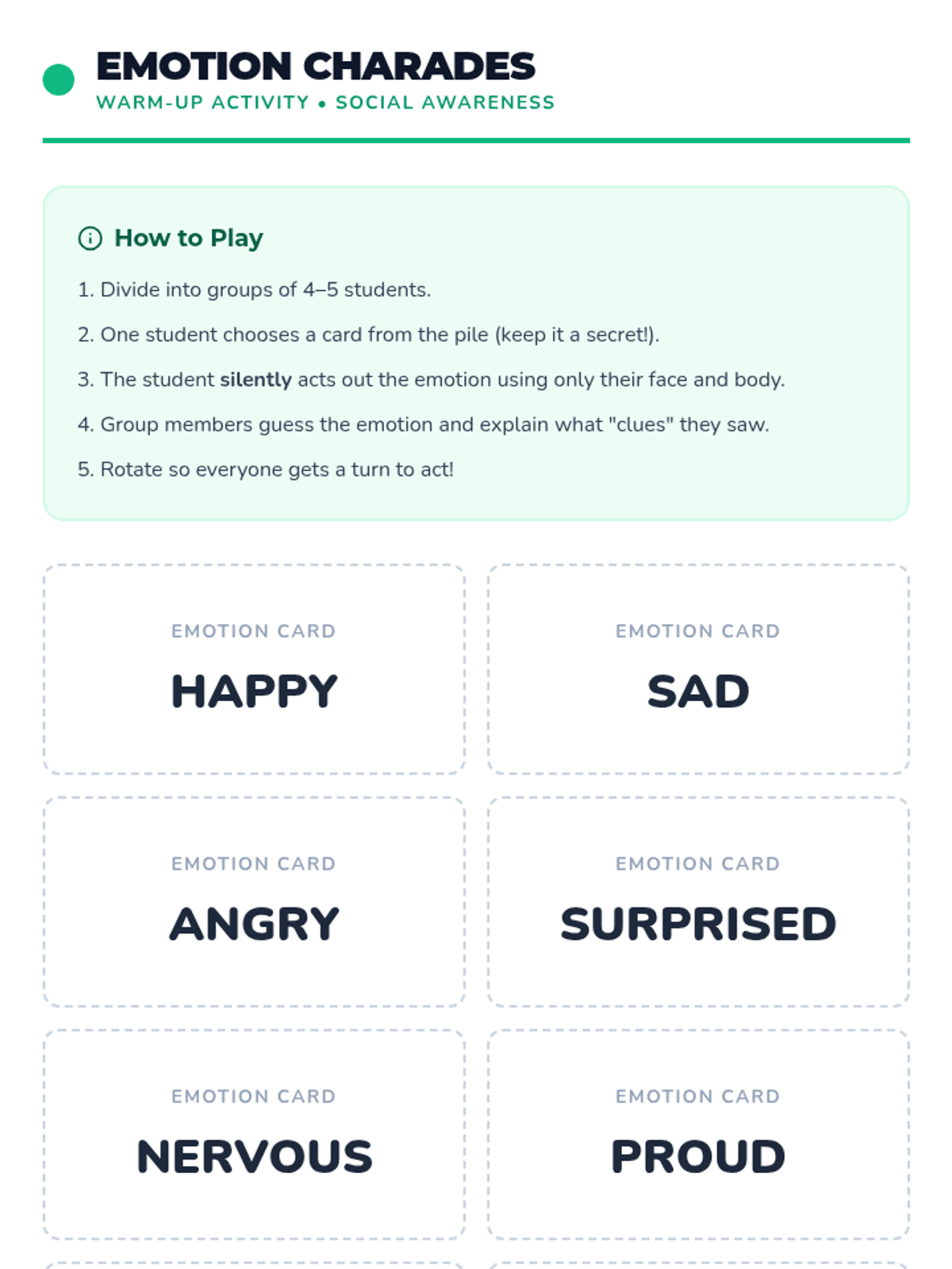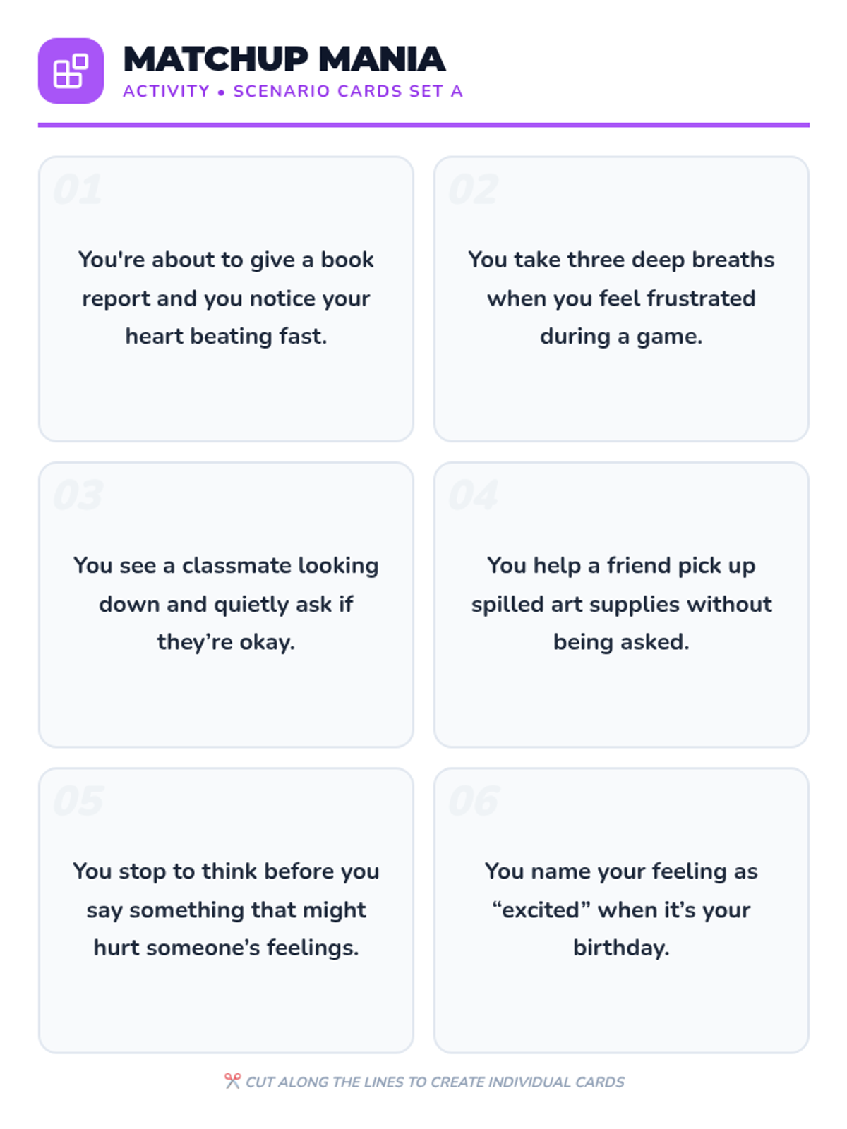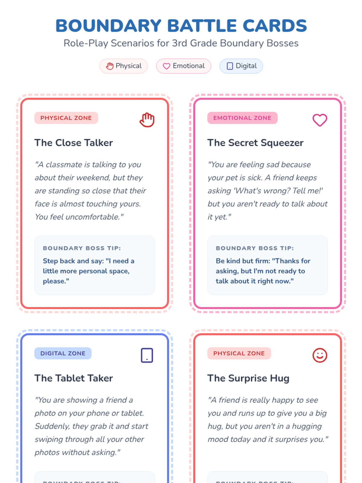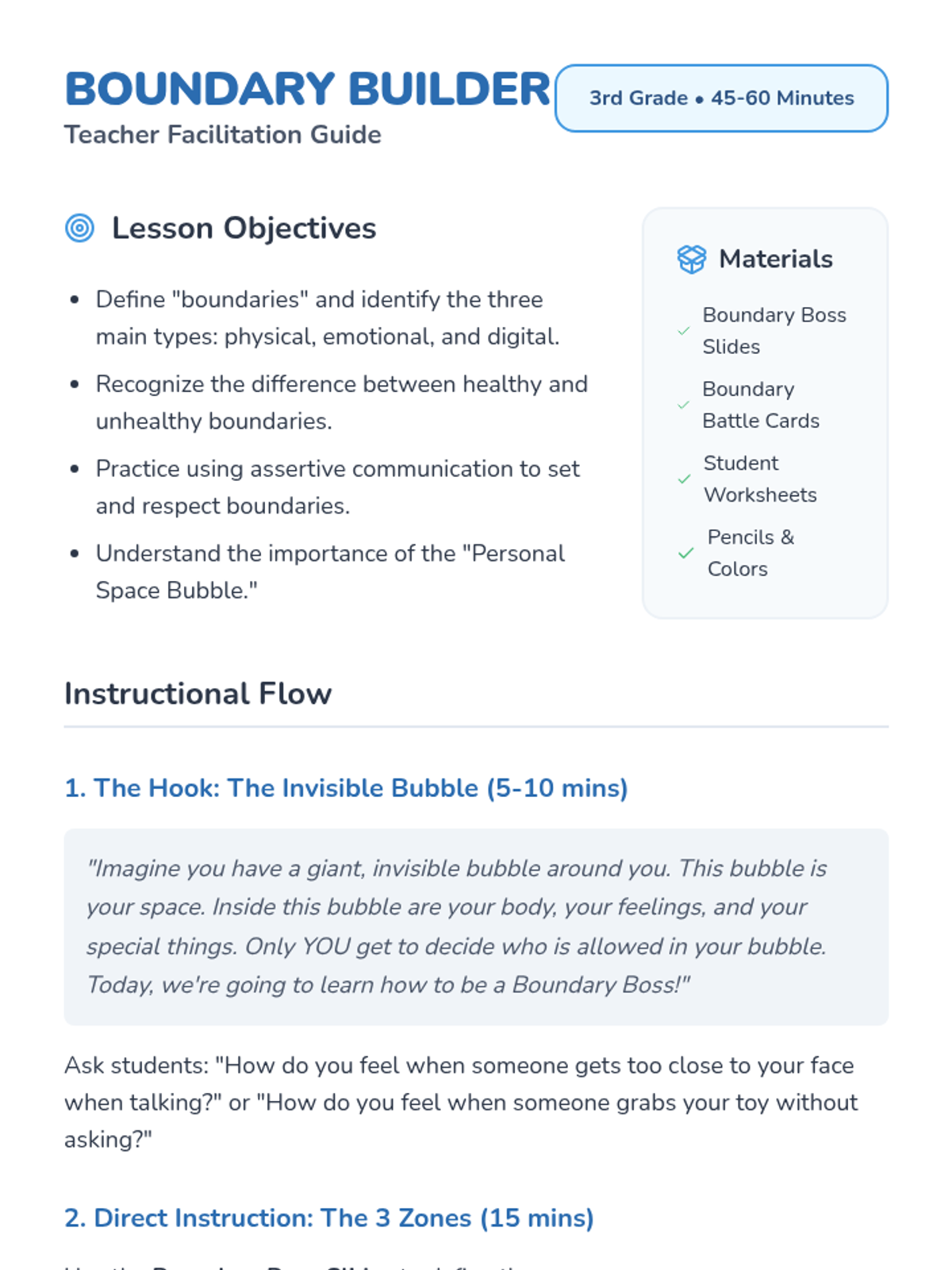 A comprehensive lesson designed to help students identify different types of bullying (physical, verbal, cyber) and develop empathy through scenario analysis and role-playing activities. Students will learn to recognize the impact of their actions and cultivate a culture of respect.