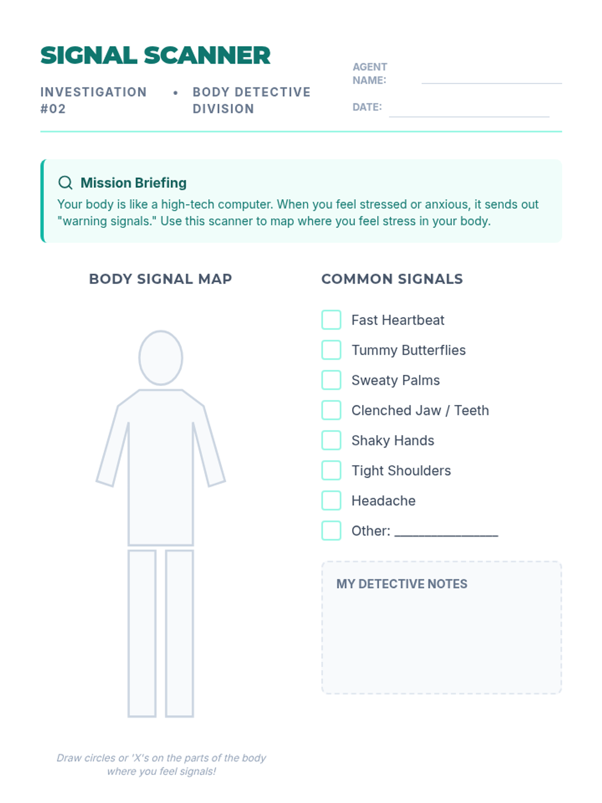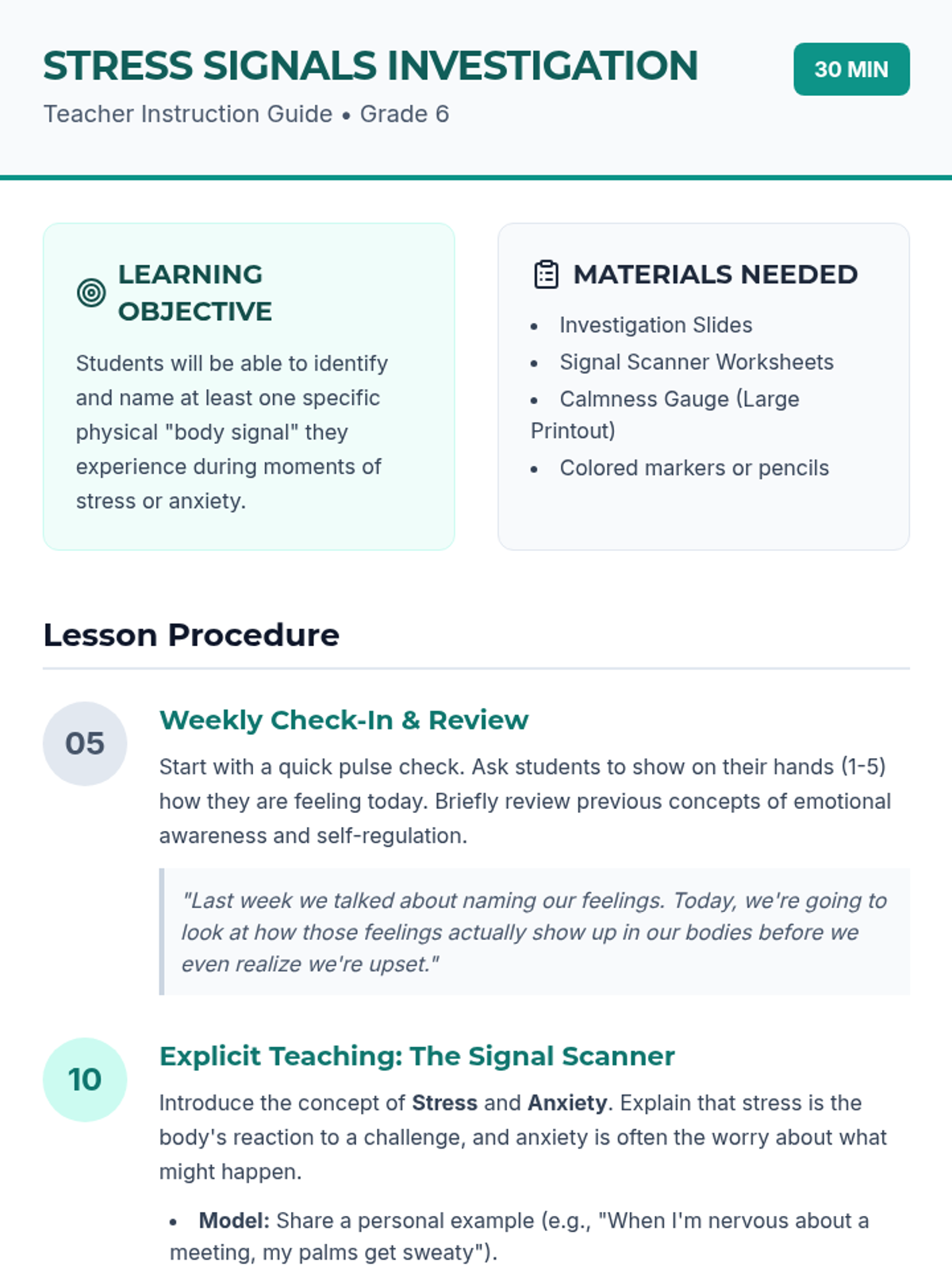 A 30-minute lesson helping 6th graders identify physical manifestations of stress and anxiety using the 'Body Detective' approach.