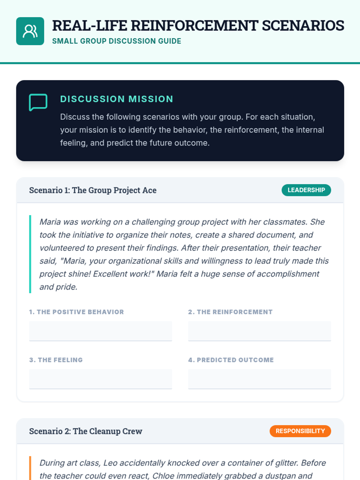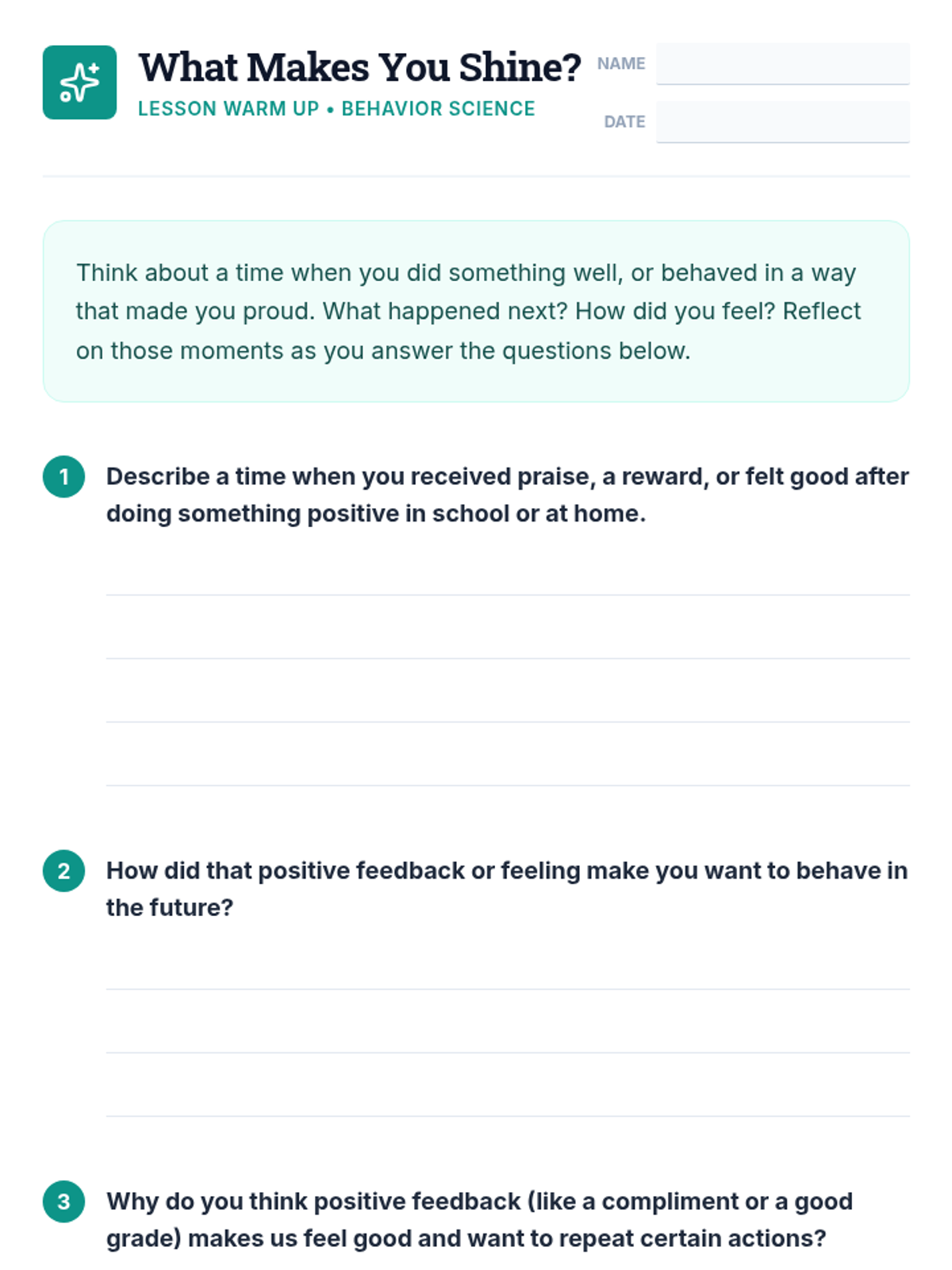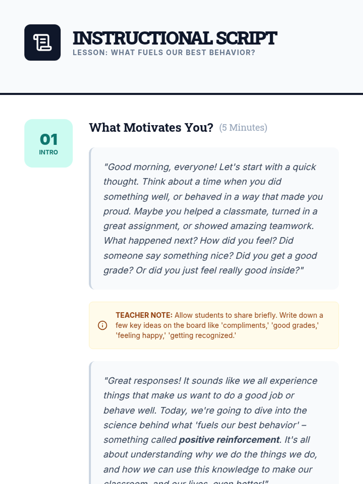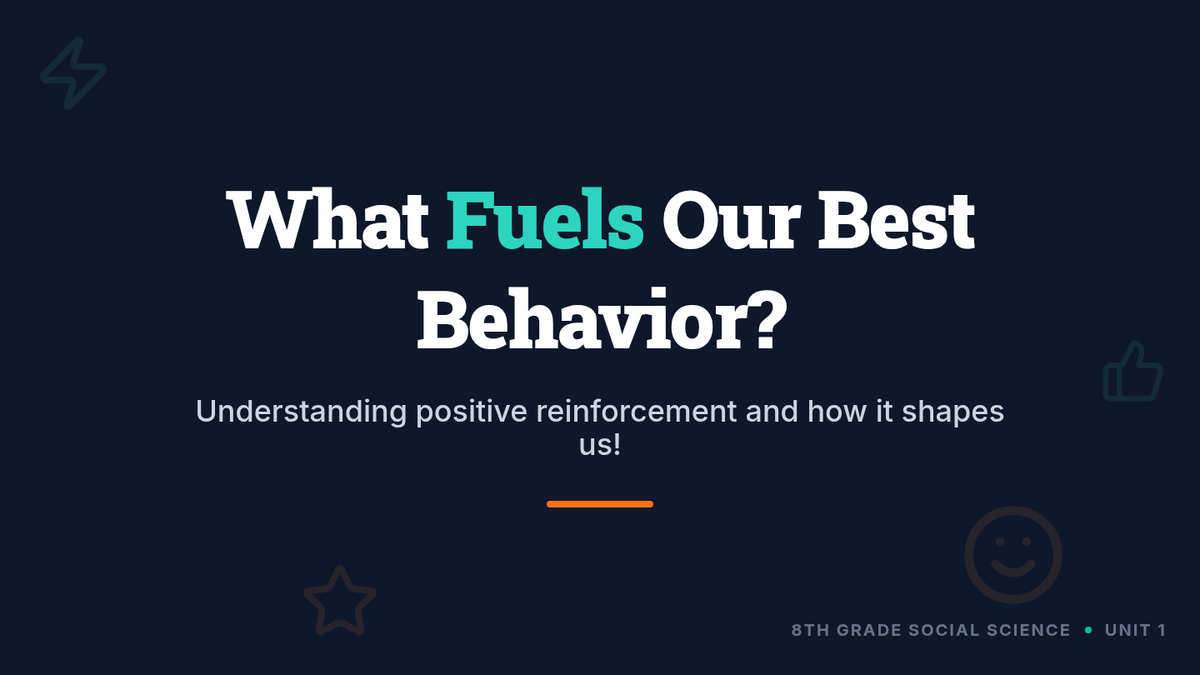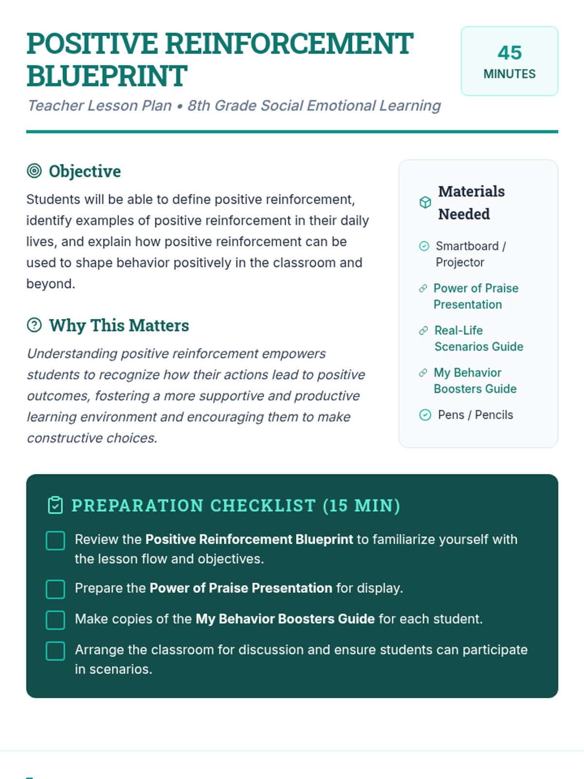An 8th-grade lesson exploring the psychological science of positive reinforcement, its impact on motivation, and how students can apply these principles to foster a proactive and supportive classroom culture.
