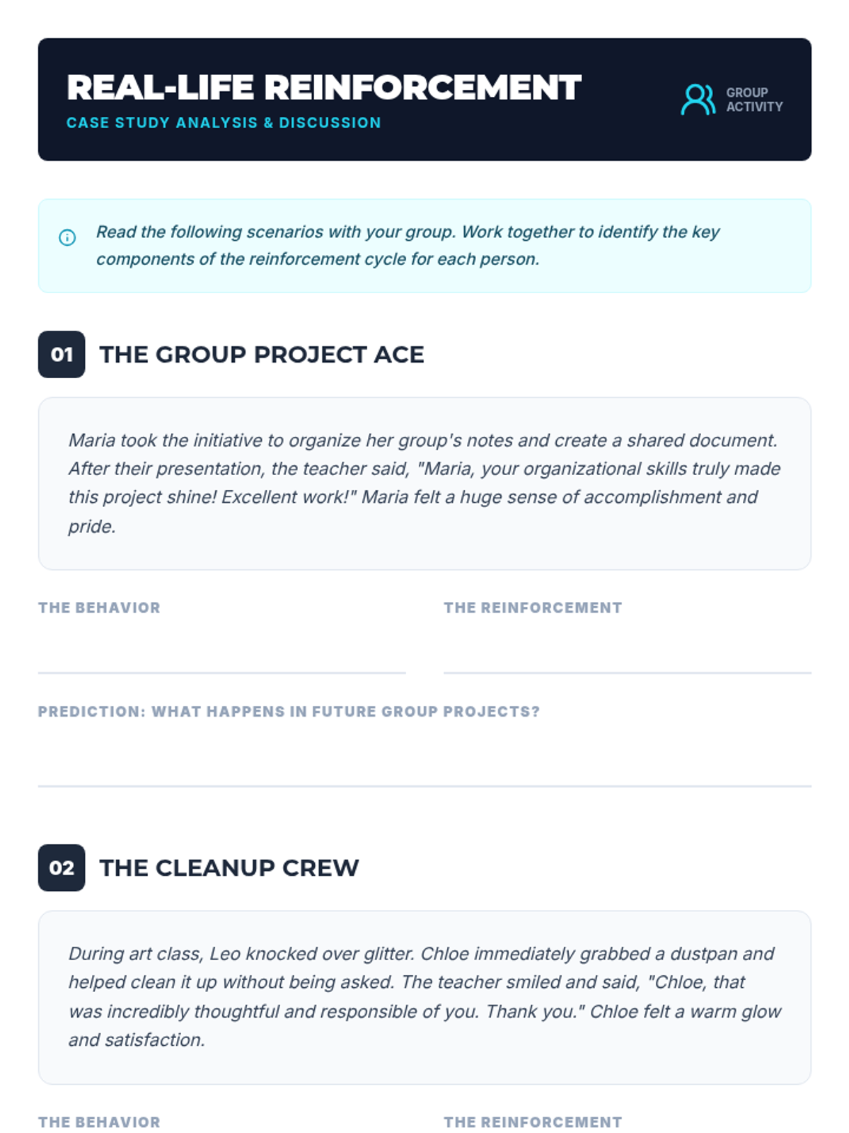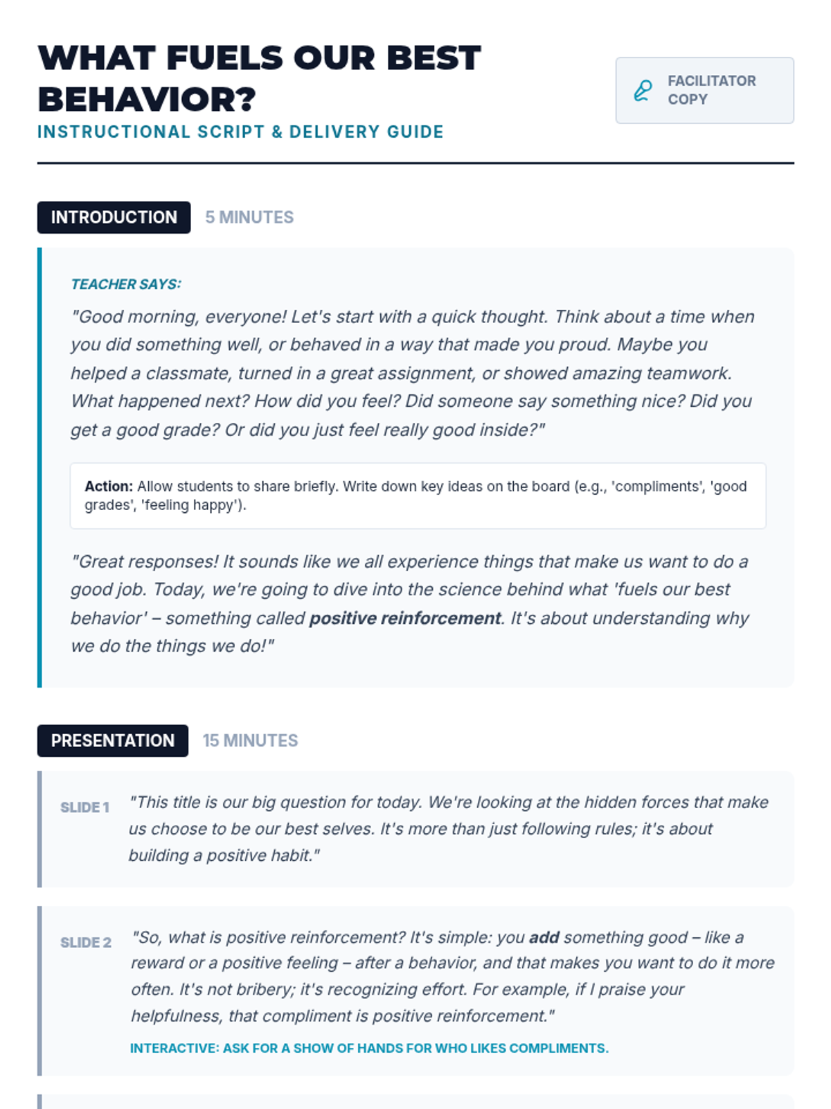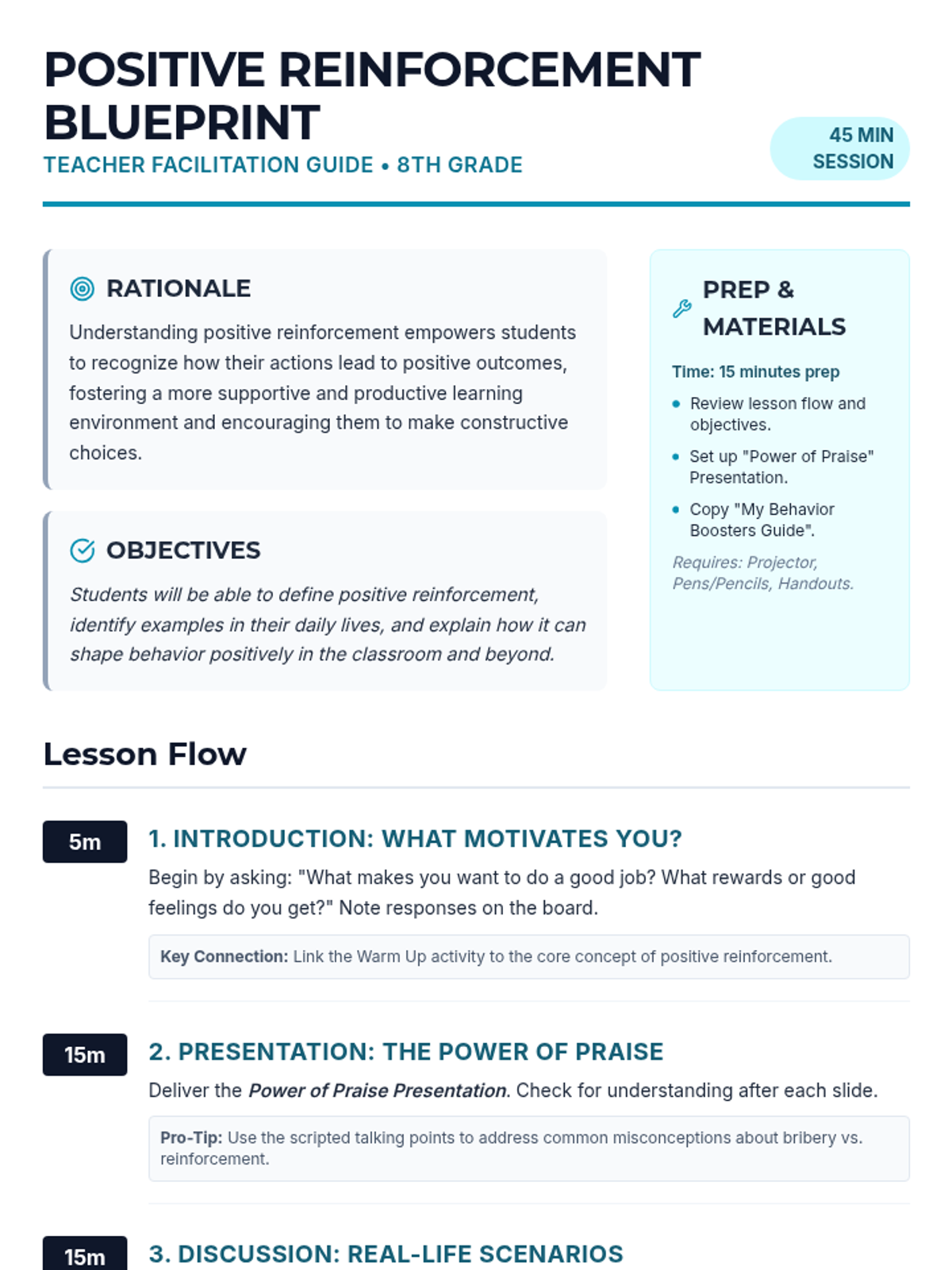 An engaging 45-minute lesson for 8th graders exploring the science of positive reinforcement and its impact on behavior and classroom dynamics.