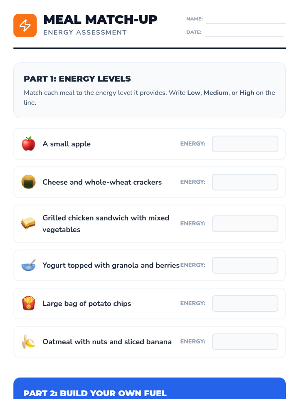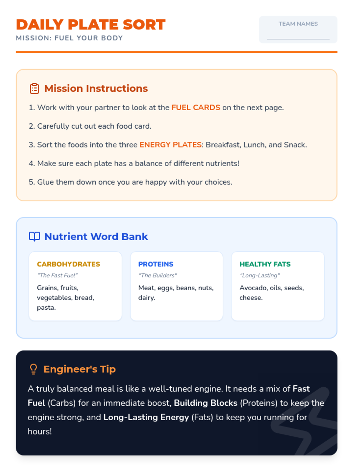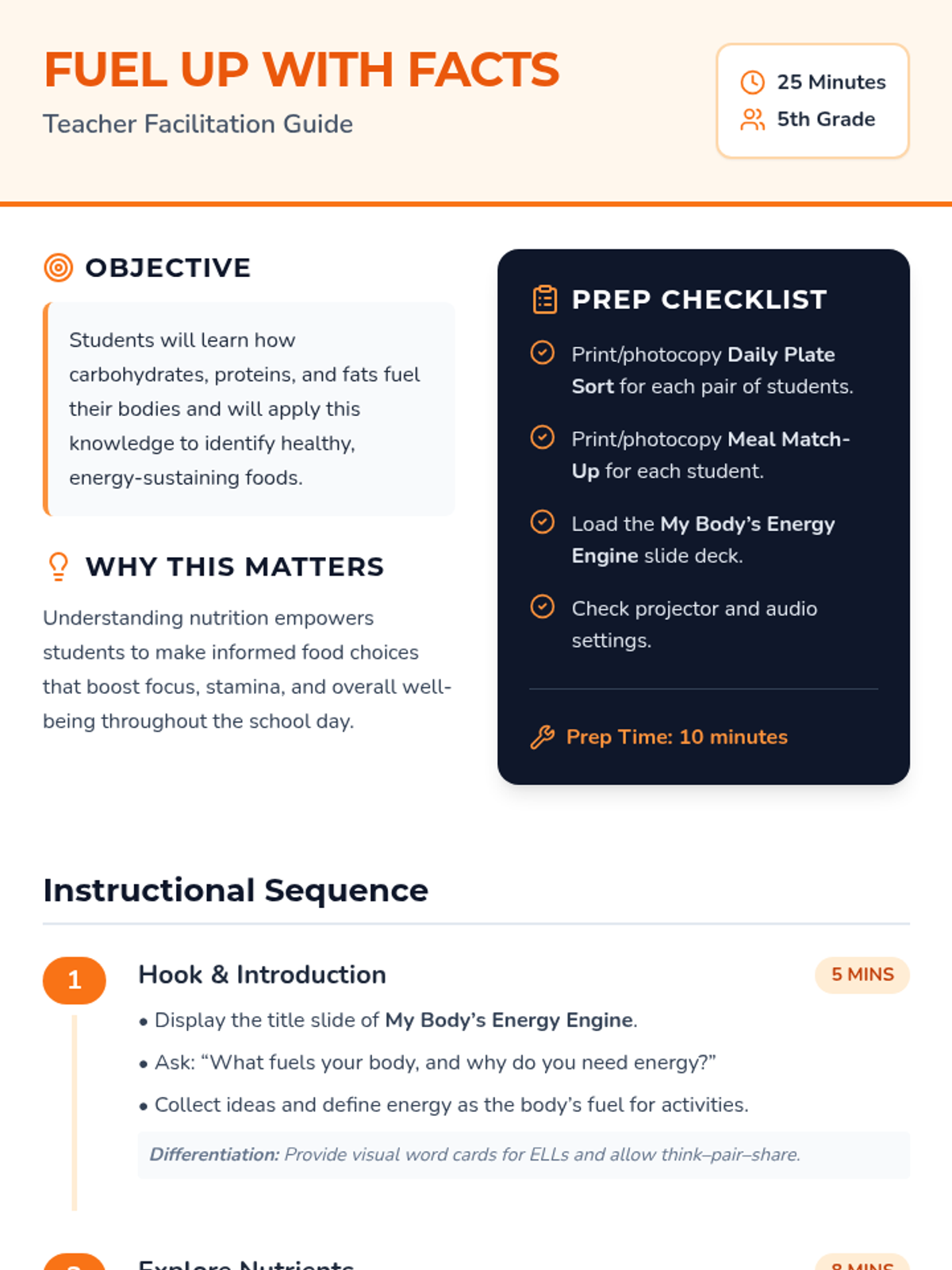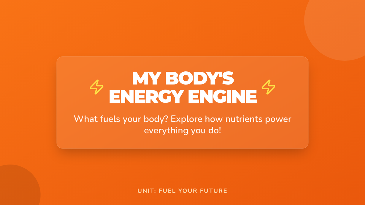 A high-energy, 25-minute lesson for 5th graders that explores how carbohydrates, proteins, and fats act as the body's fuel, featuring interactive sorting and matching activities.