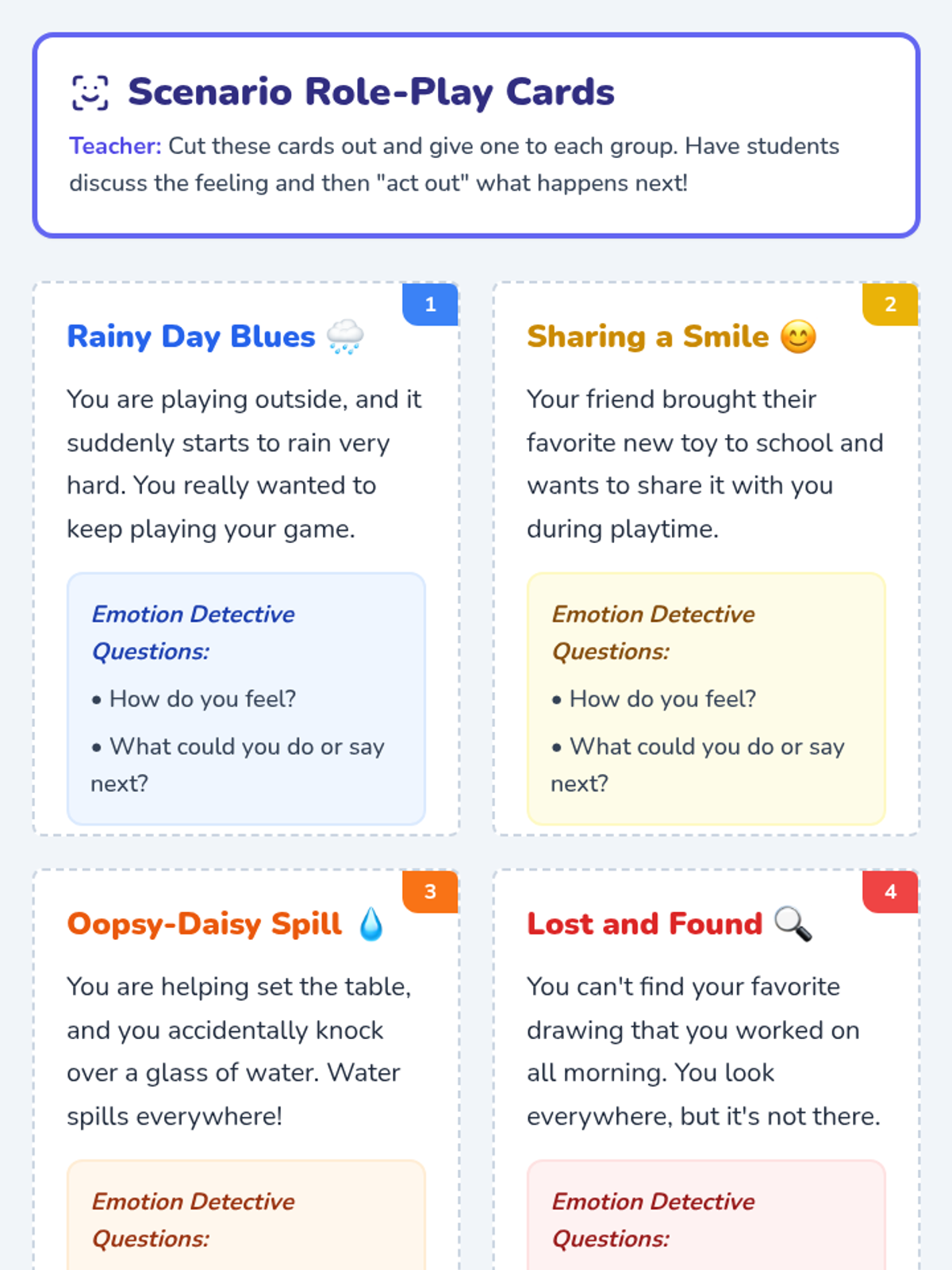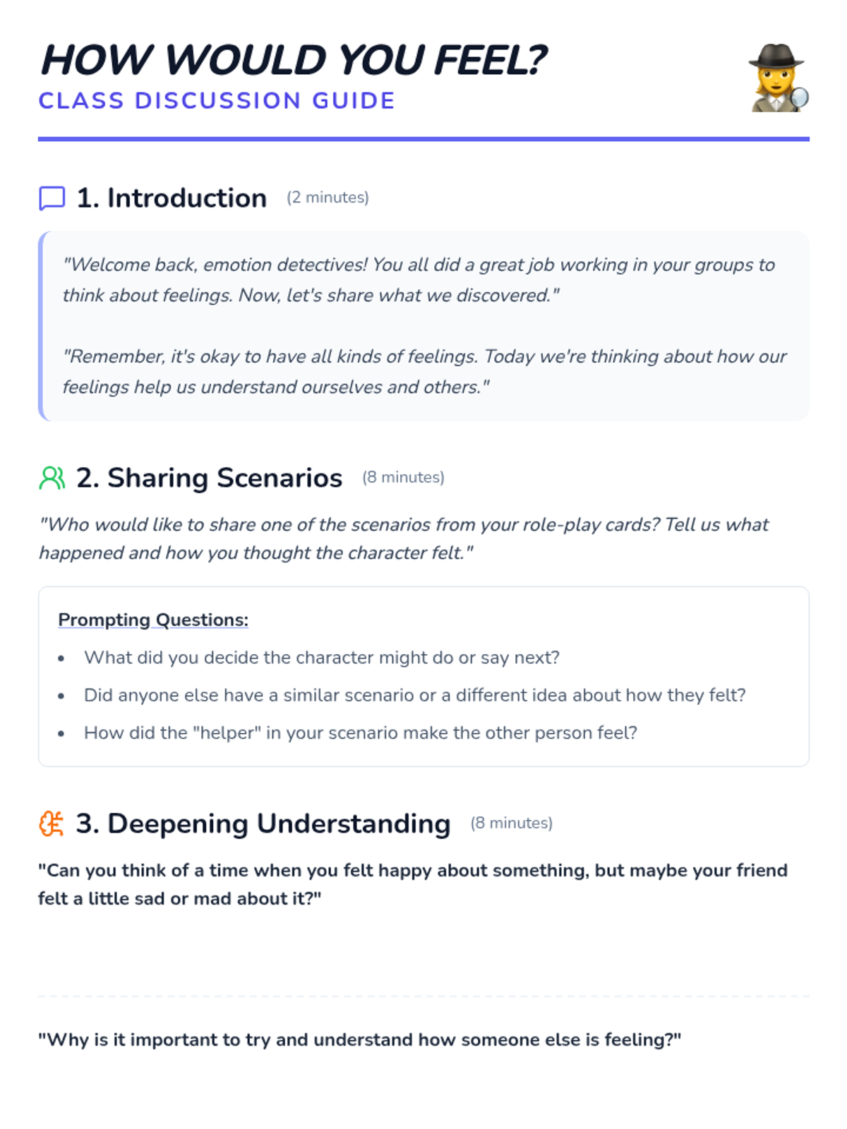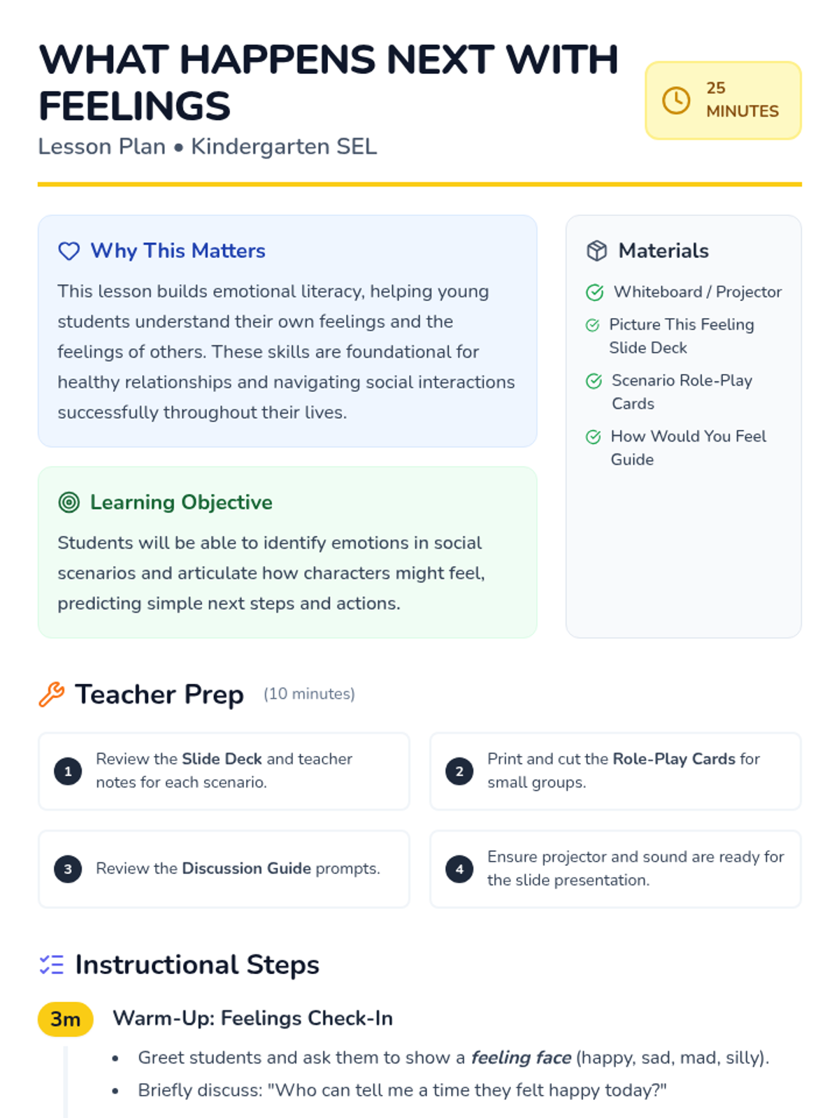 This lesson helps Kindergarten students develop emotional literacy by identifying emotions in social scenarios and predicting outcomes. It uses interactive slides and role-play to build social-emotional intelligence.