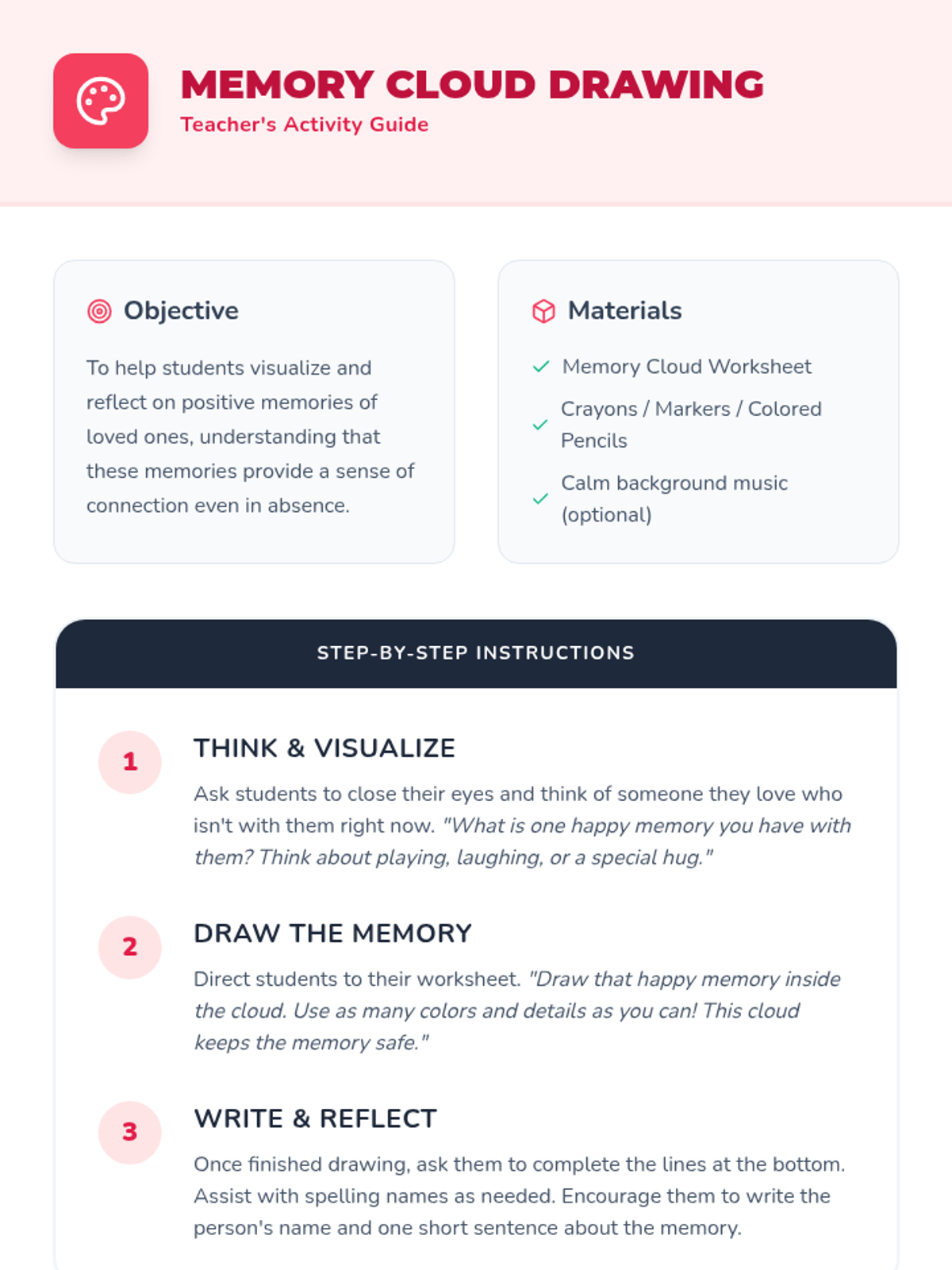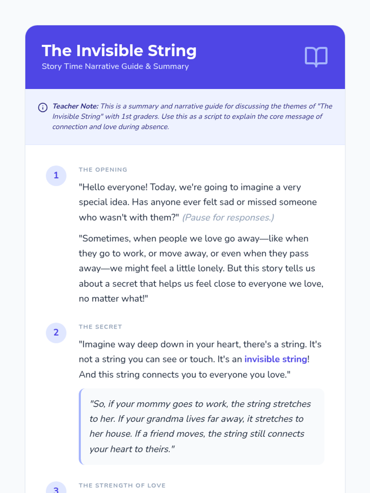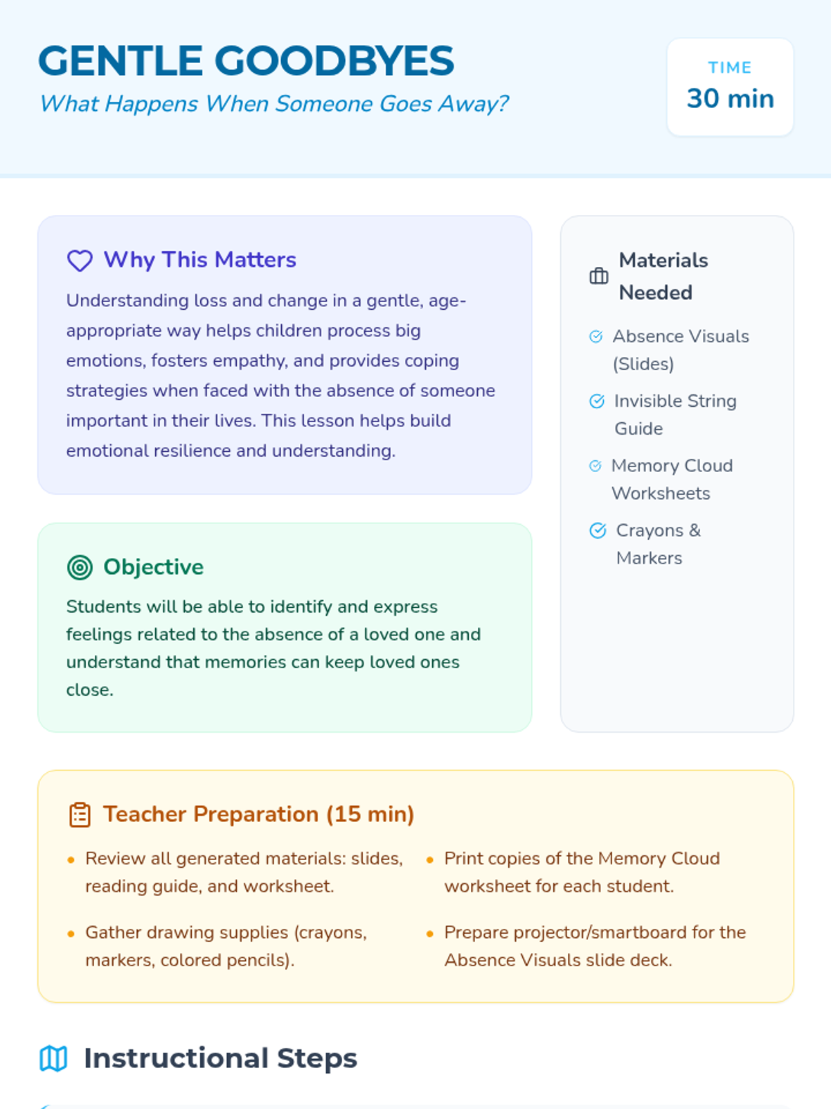 A gentle, age-appropriate introduction to the concepts of absence, change, and grief for first graders, using story and art to foster emotional resilience.