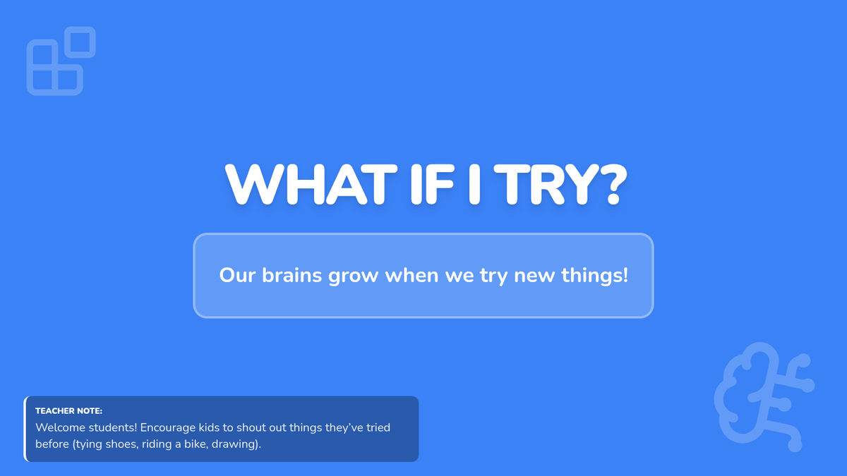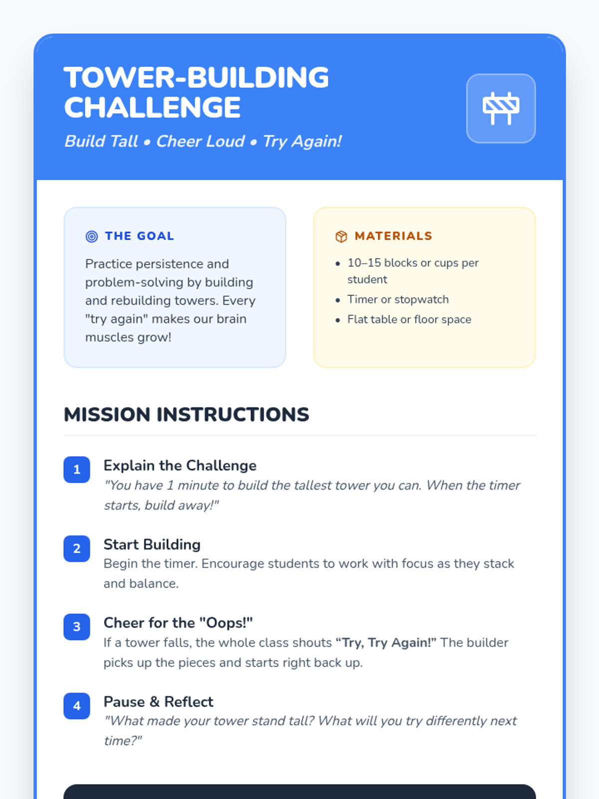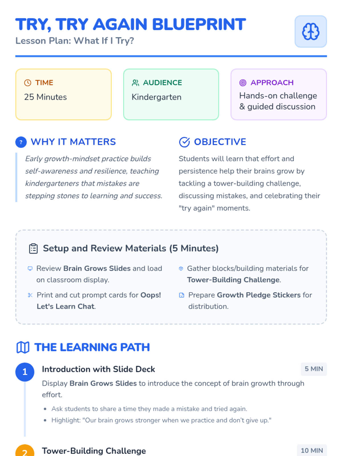 A playful 25-minute whole-class lesson for kindergarten that uses fun challenges and discussion to show how effort helps our brains grow. This Tier 1 self-awareness growth mindset lesson empowers young learners to try, persist, and celebrate mistakes as learning opportunities.