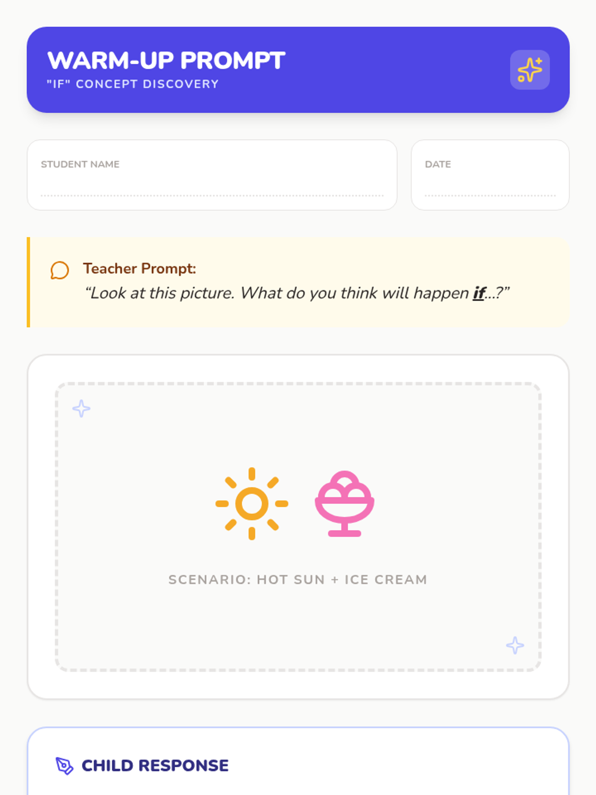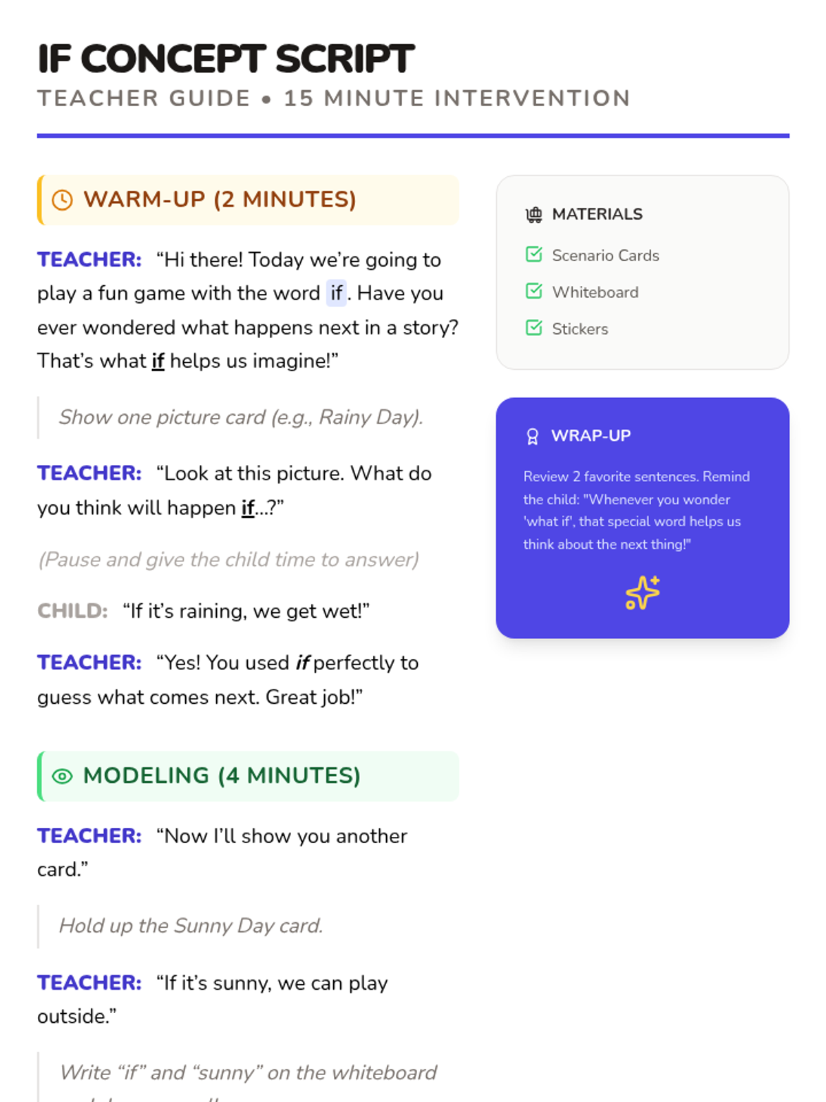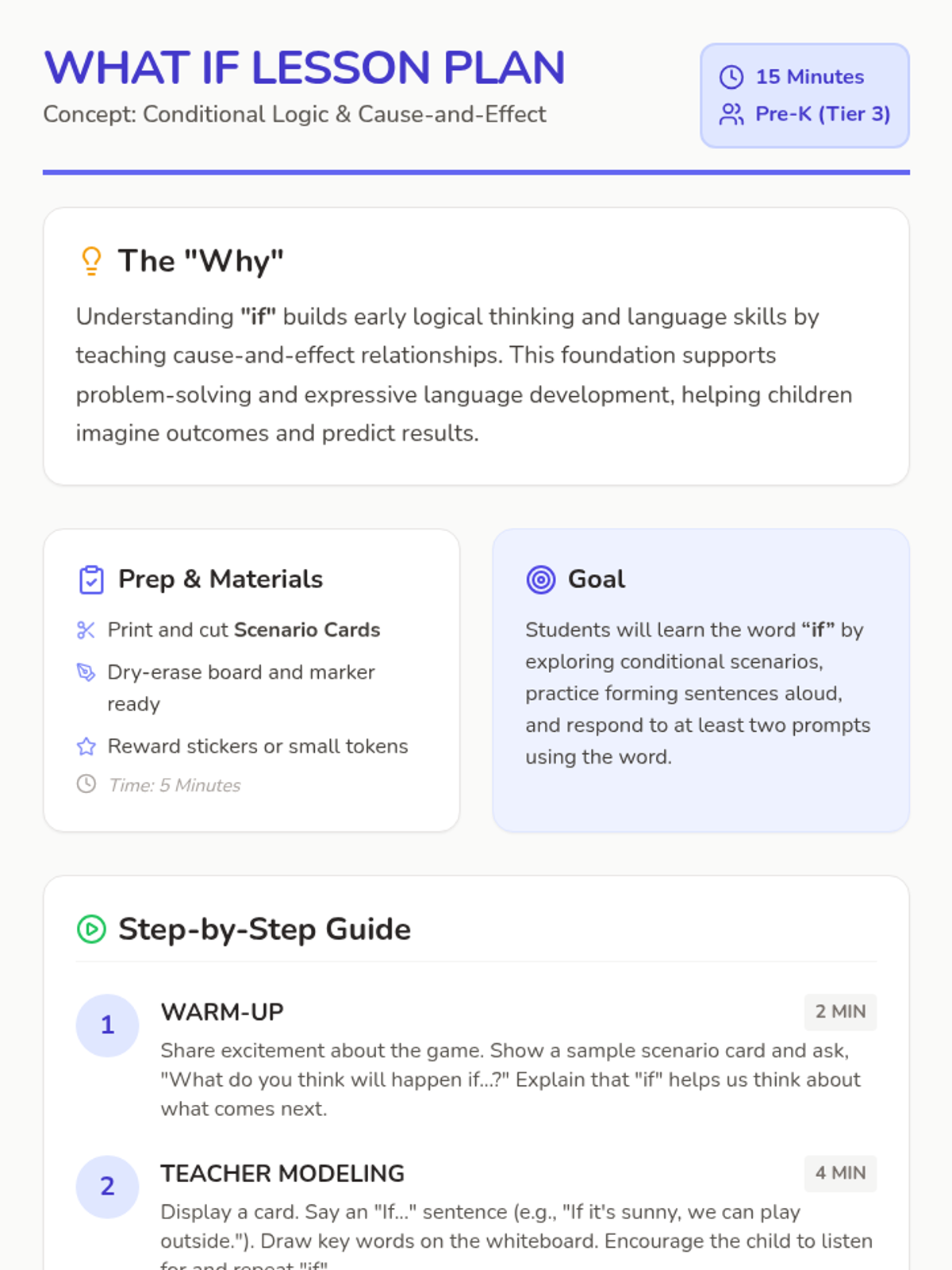 A 15-minute Tier 3 intervention for Pre-K learners to explore cause-and-effect thinking and conditional language using 'if' through playful scenarios.