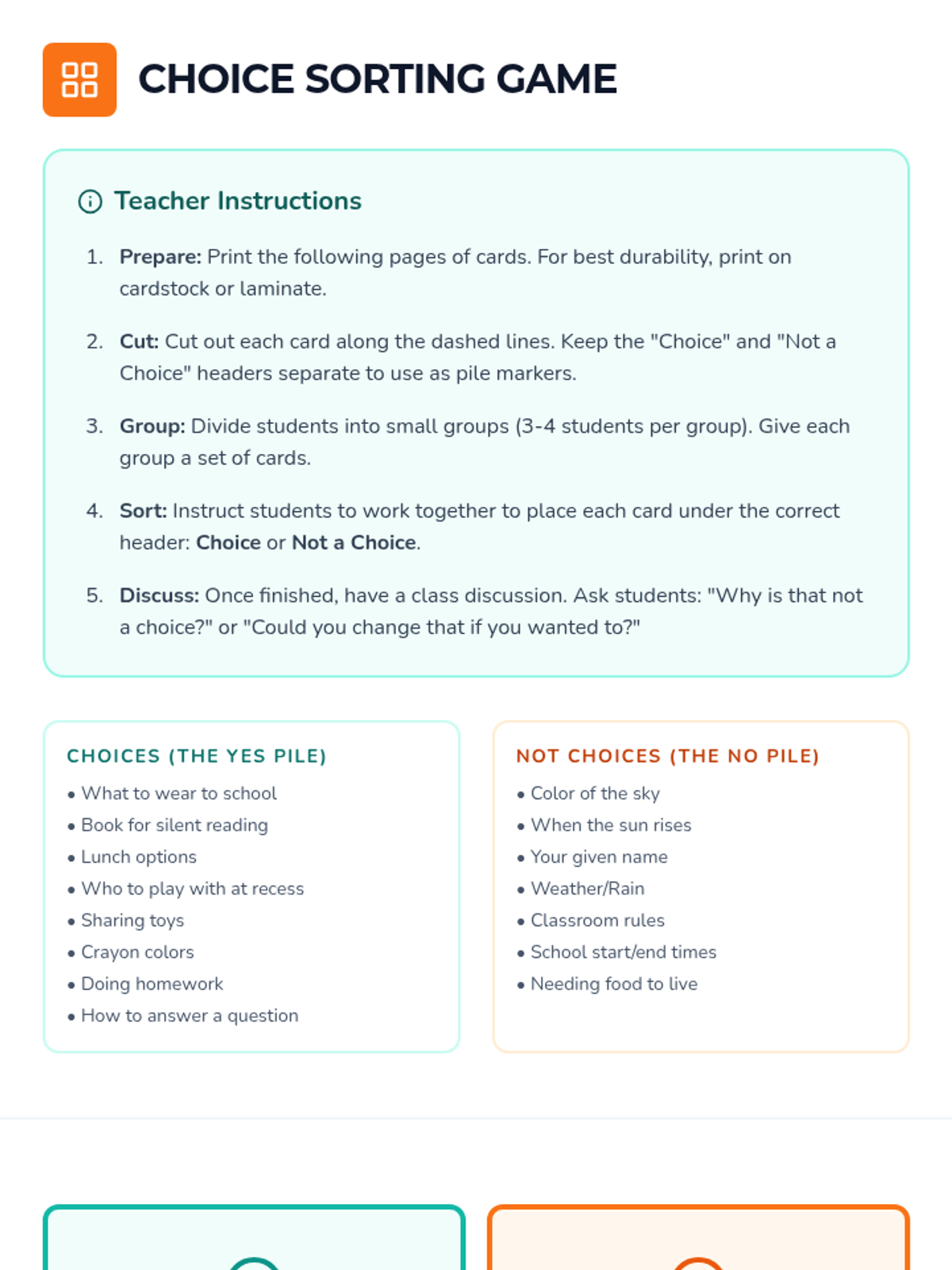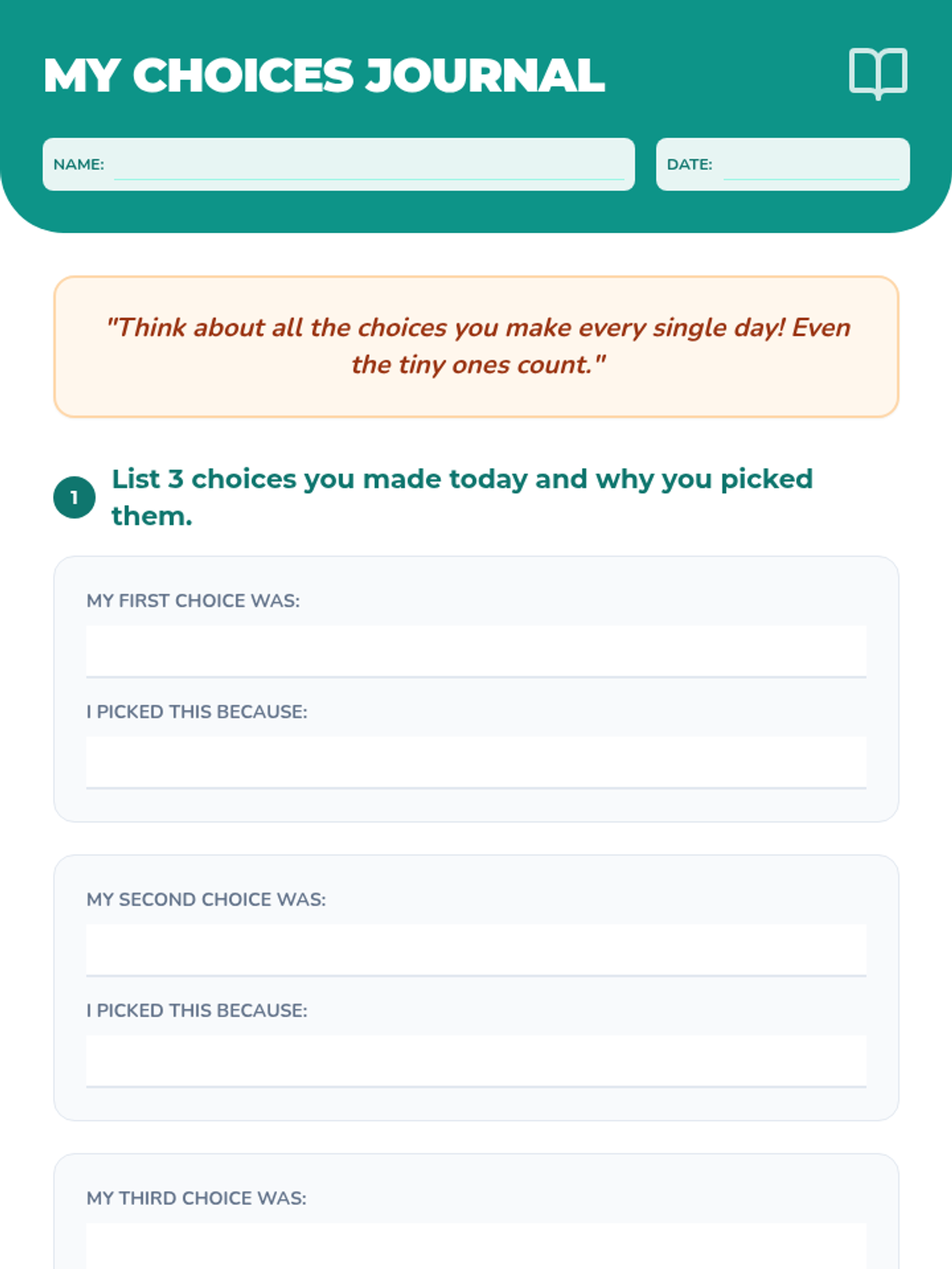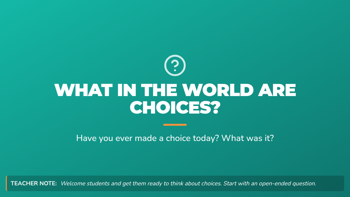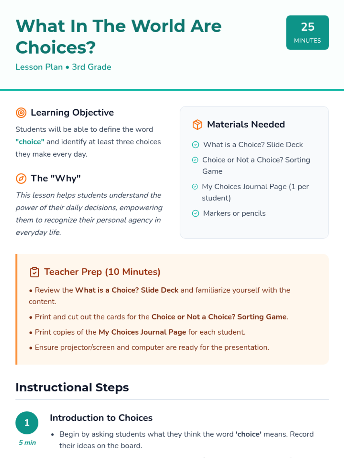 An introductory lesson for 3rd graders on the concept of agency and decision-making, helping students define 'choice' and recognize their daily influence on their own lives.