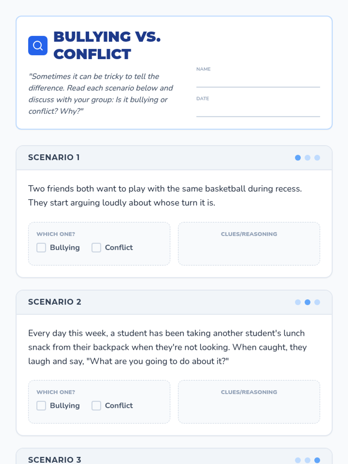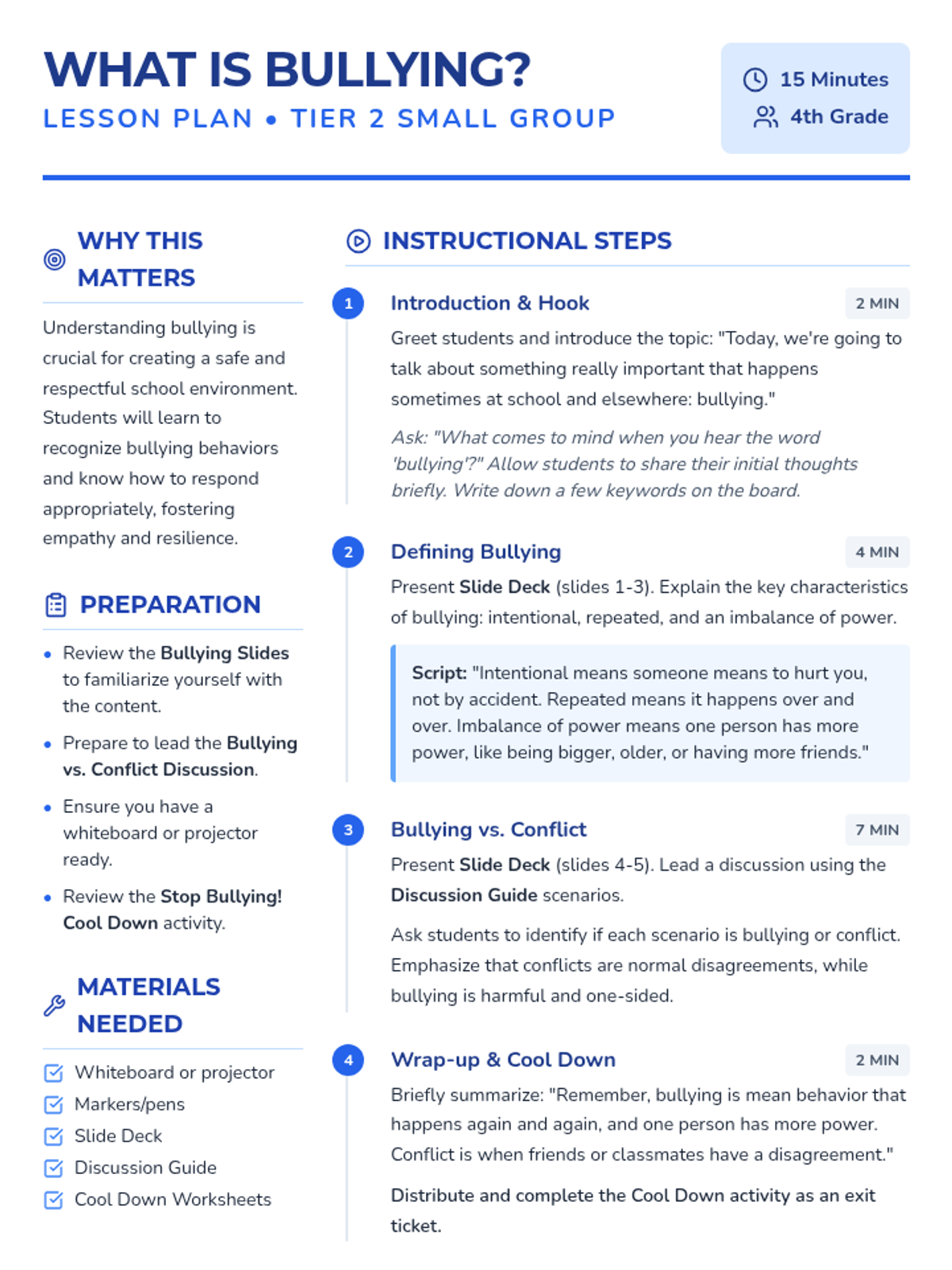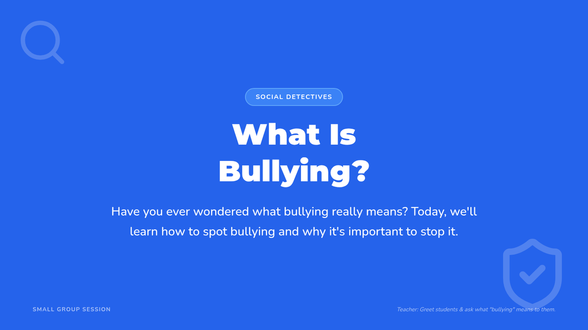 A 15-minute Tier 2 small group lesson for 4th graders to define bullying using the three key criteria (intentional, repeated, power imbalance) and distinguish it from normal conflict.