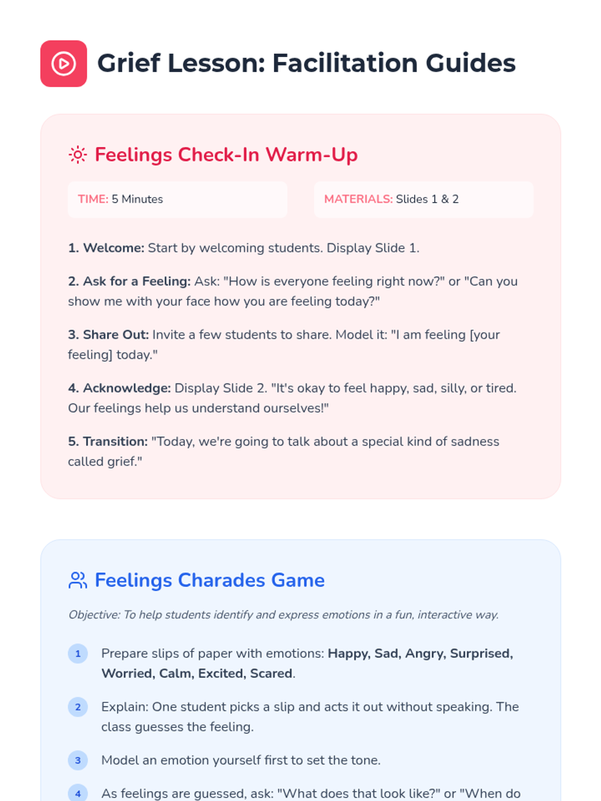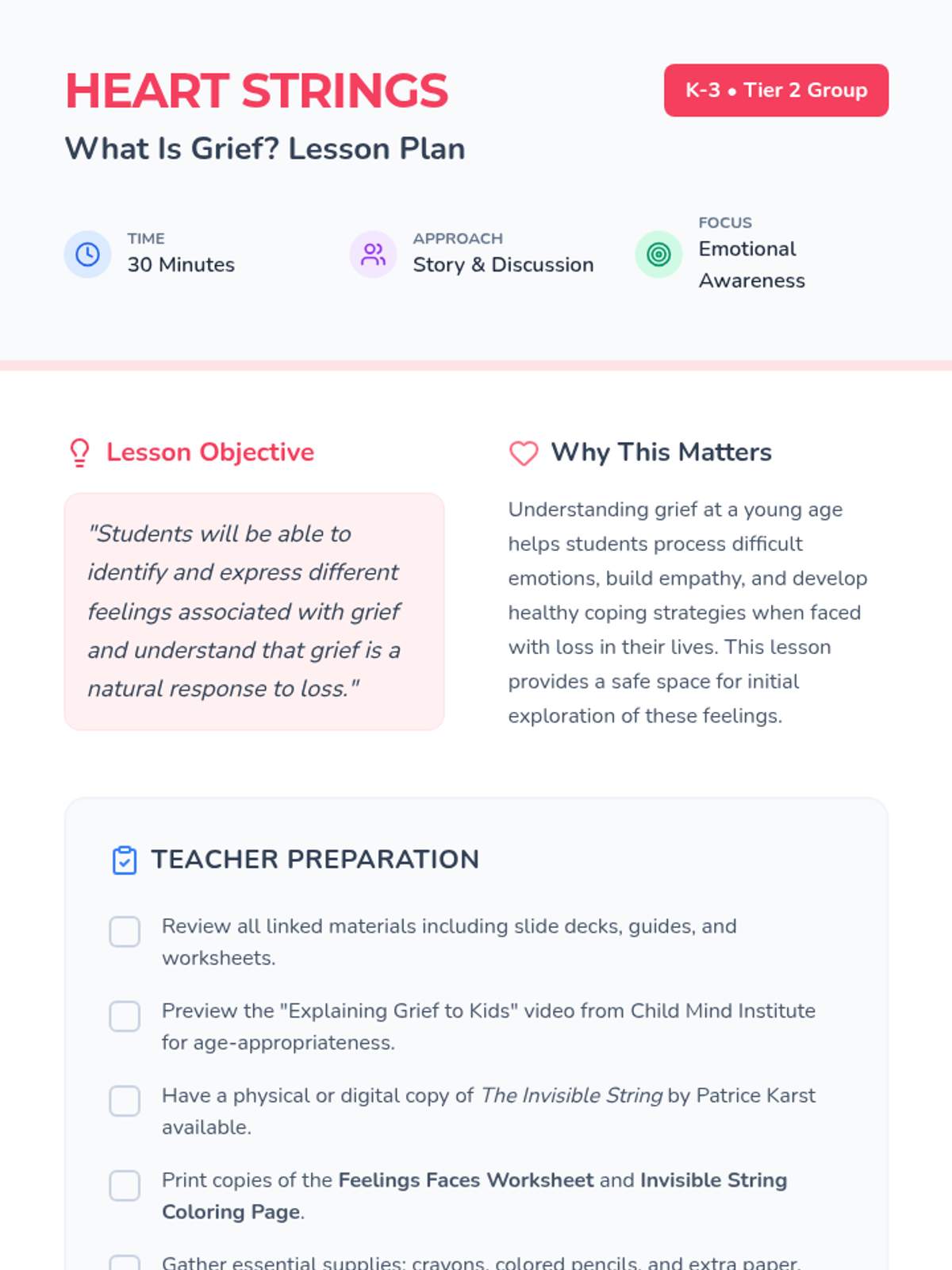 This lesson helps K-3 students understand what grief is and how it feels to experience sadness due to loss. It provides a foundational understanding of emotions related to loss in a supportive group setting over 30 minutes.