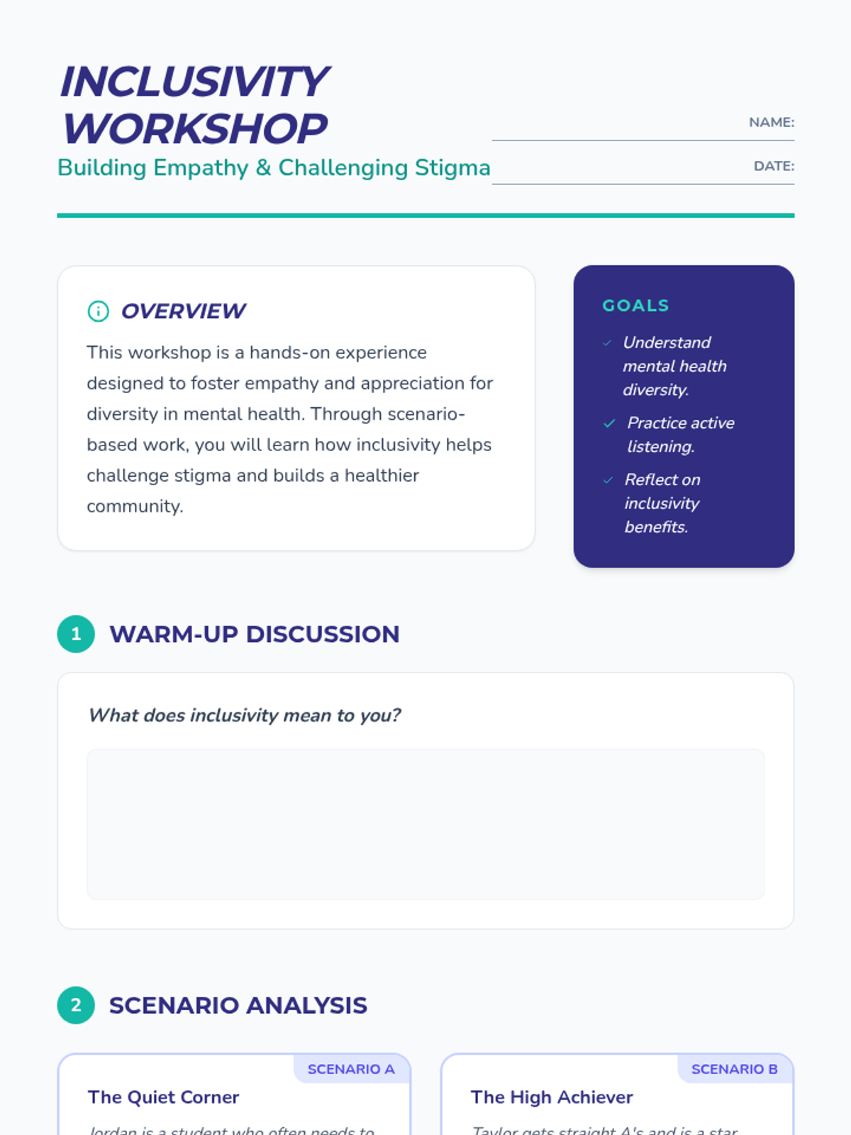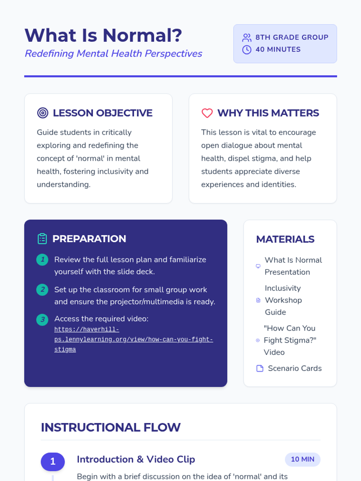 A lesson designed for 8th graders to challenge the societal definition of 'normal' regarding mental health, promoting inclusivity and reducing stigma through discussion and interactive activities.